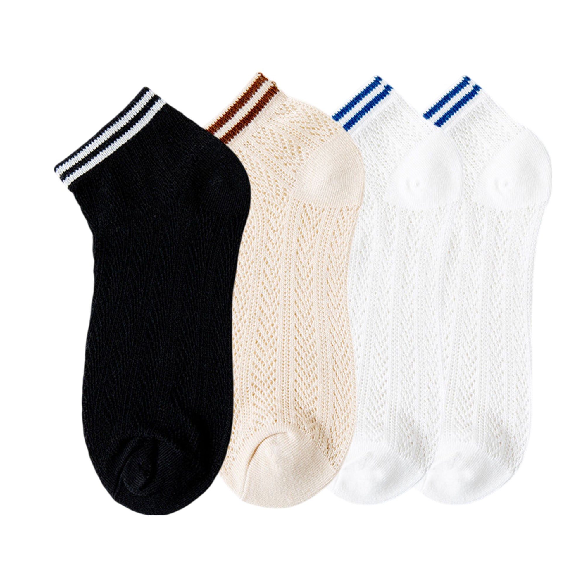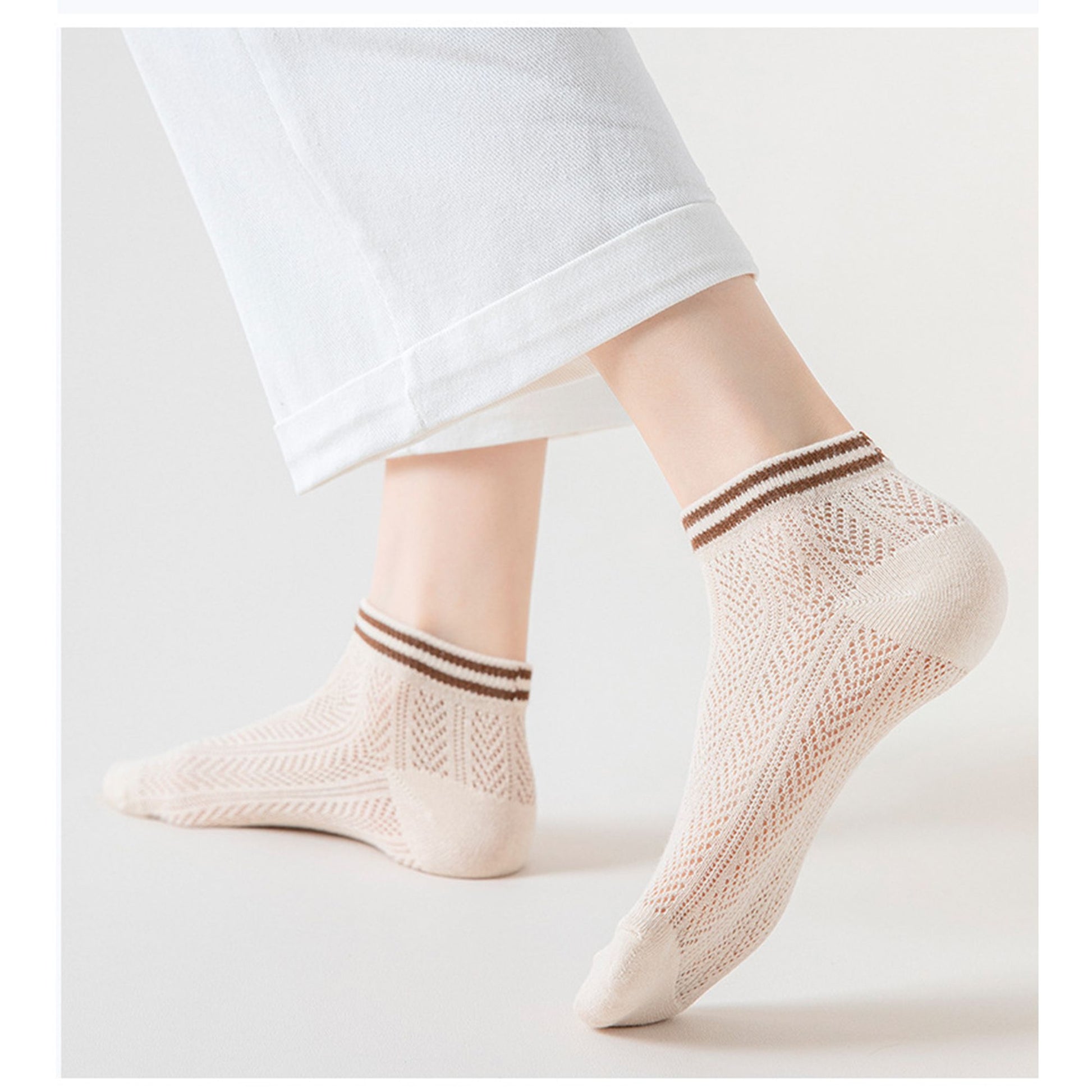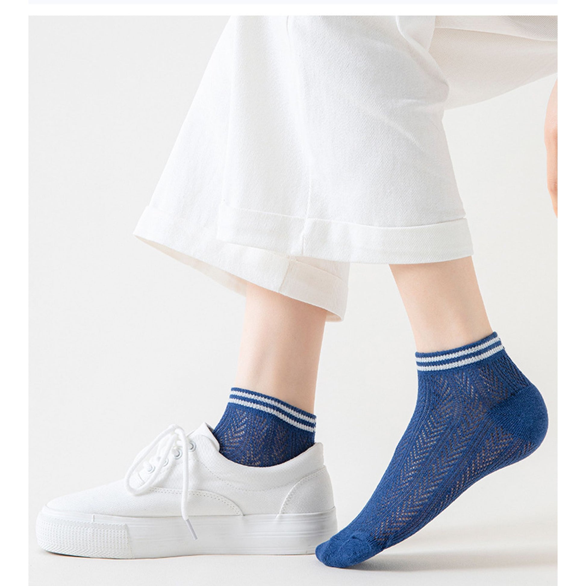 This 4-pair pack of women's ankle socks features a breathable open-knit mesh design and sporty striped cuffs for a stylish yet functional finish. Crafted for all-day comfort, the soft stretch fabric offers a snug fit without slipping. Each set comes in one of five coordinated color assortments, ideal for pairing with sneakers or casual shoes. A perfect combination of comfort, style, and breathability for everyday wear.