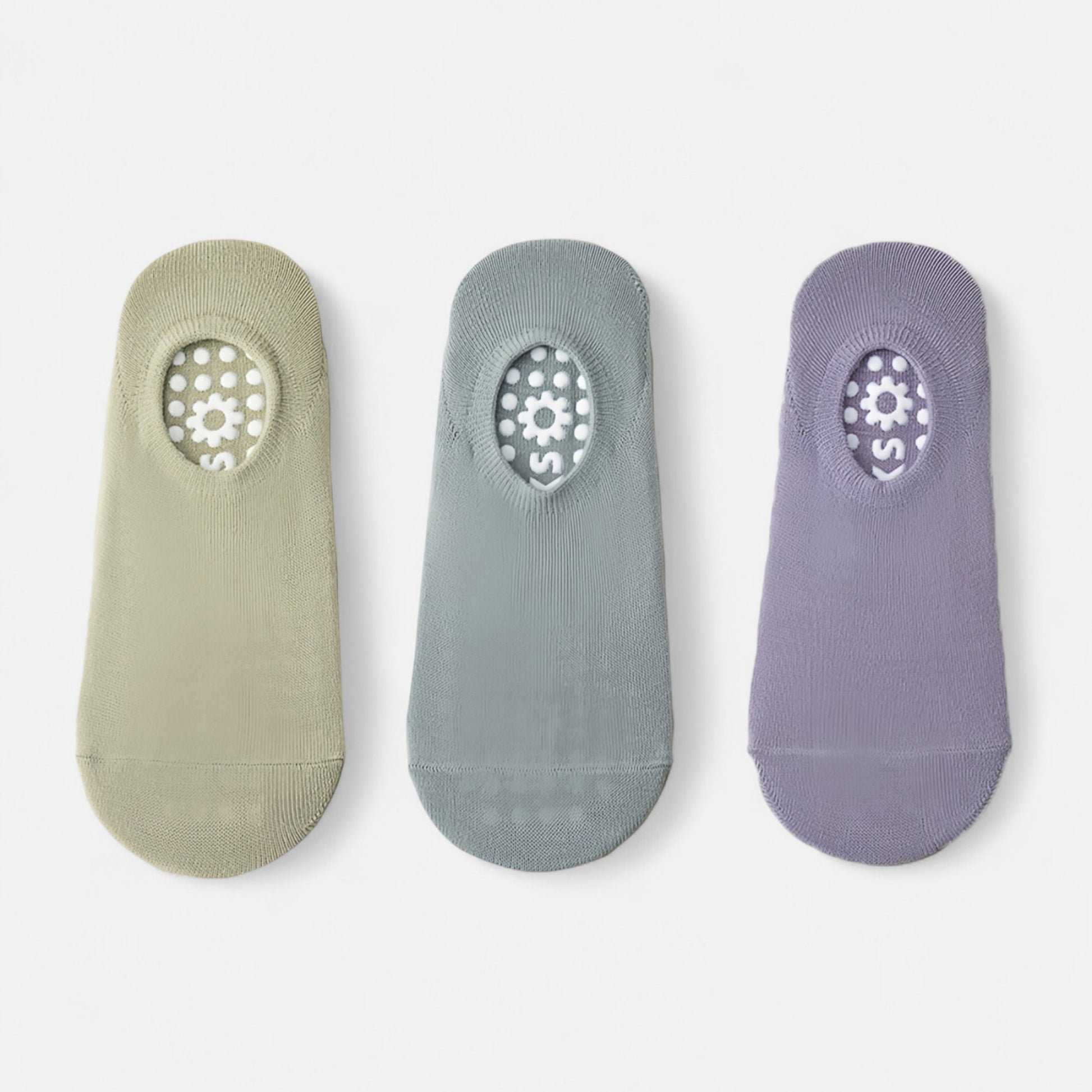 The Anna-Kaci Women's 3-Pack Ballet Cut Grip Socks are designed for secure movement and everyday ease. These low-cut socks feature a flower-shaped non-slip grip on the sole, offering added traction for pilates, barre, or lounging at home. Their sleek profile sits discreetly below the ankle, ideal for barefoot-style wear. Each pack includes three pairs in subtle, understated shades perfect for your daily studio rotation.