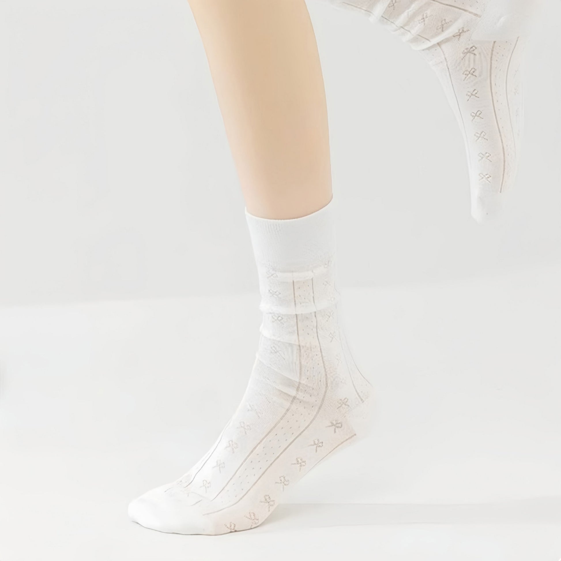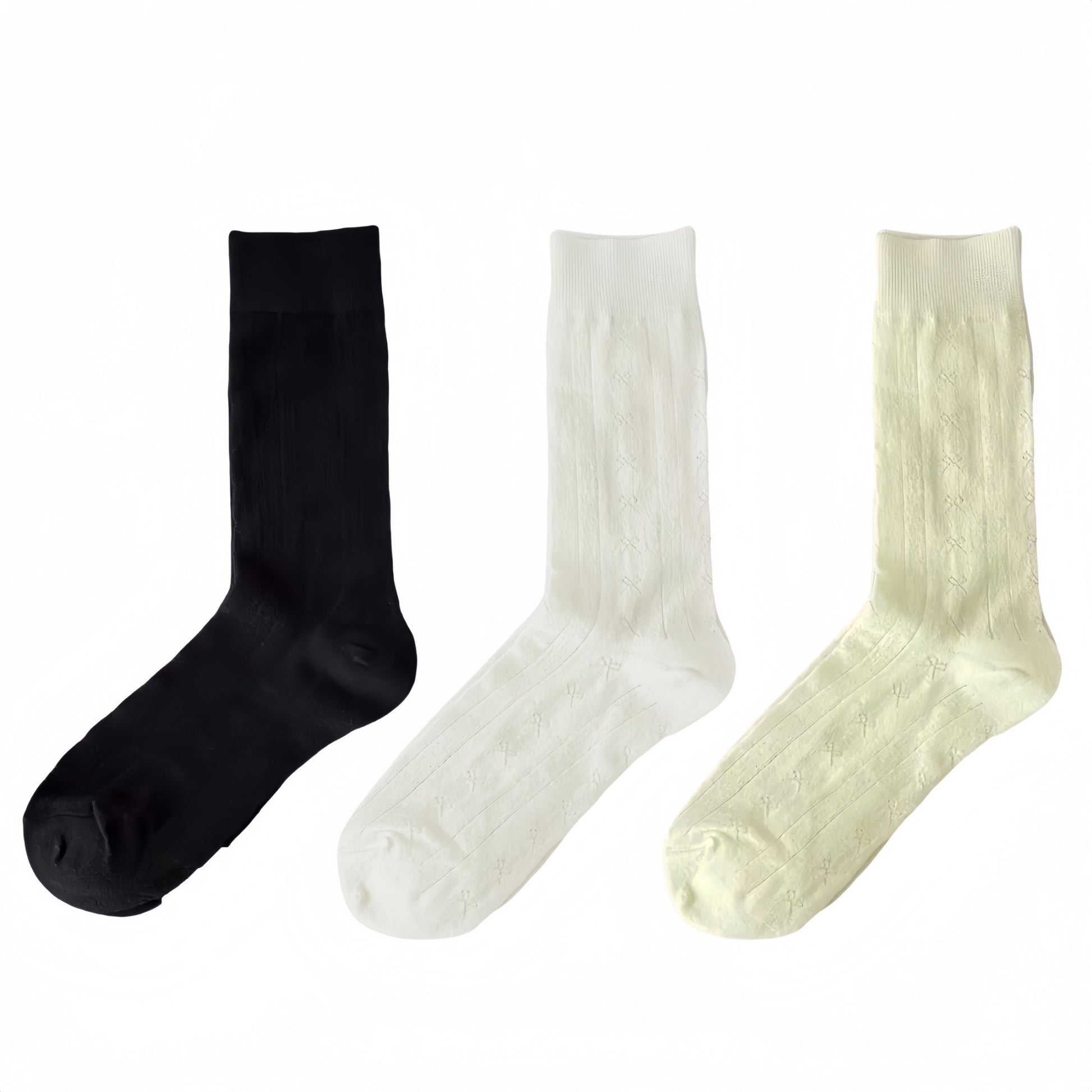 This 3-pair set of ribbed crew socks adds delicate charm to your everyday essentials. Designed with a subtle embroidered bow pattern and soft knit texture, each pair offers a comfortable fit that feels snug yet breathable. The neutral tones make them easy to pair with casual or dressier outfits. Perfect for adding a touch of sweetness to your sock drawer.