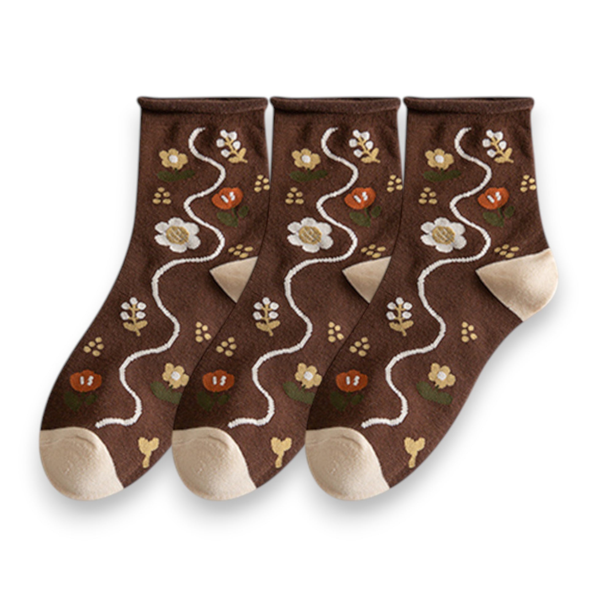 Anna-Kaci Women's 3-Pair Cotton Crew Socks Set with Checkered and Flower Textured Knit Patterns