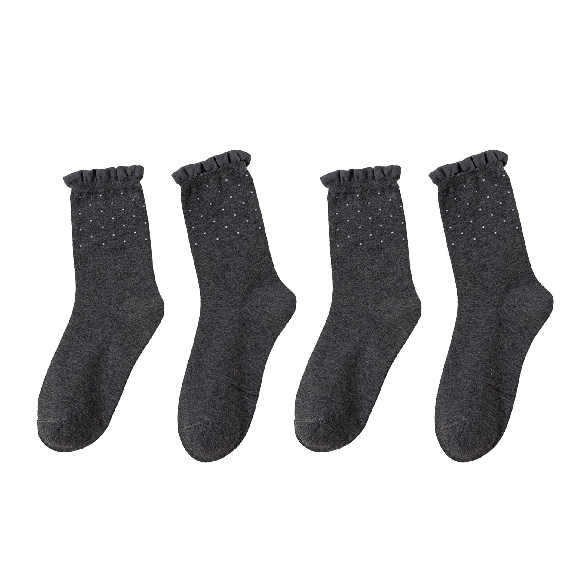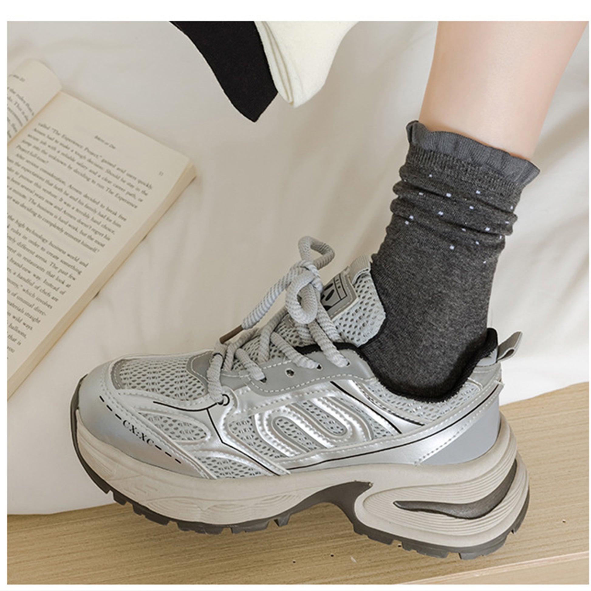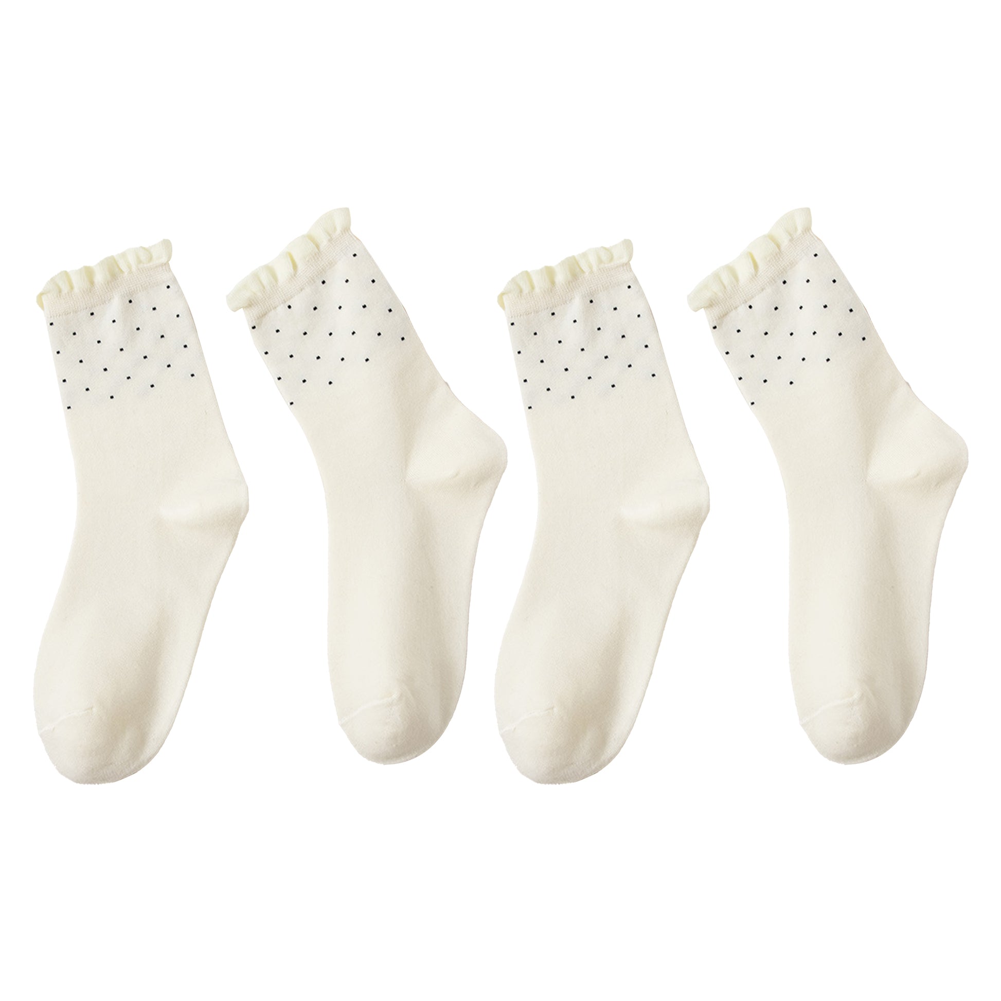 Women's 4 Pairs Knit Socks combine playful style and everyday comfort in a coordinated set. Each pack includes 4 pairs of socks in the same color, featuring a subtle polka dot pattern and delicate ruffle edge for a feminine touch. Made with soft knit fabric and ribbed cuffs, these socks ensure a secure fit and breathable comfort. Their versatile design pairs perfectly with sneakers or casual shoes, adding charm and practicality to your wardrobe.