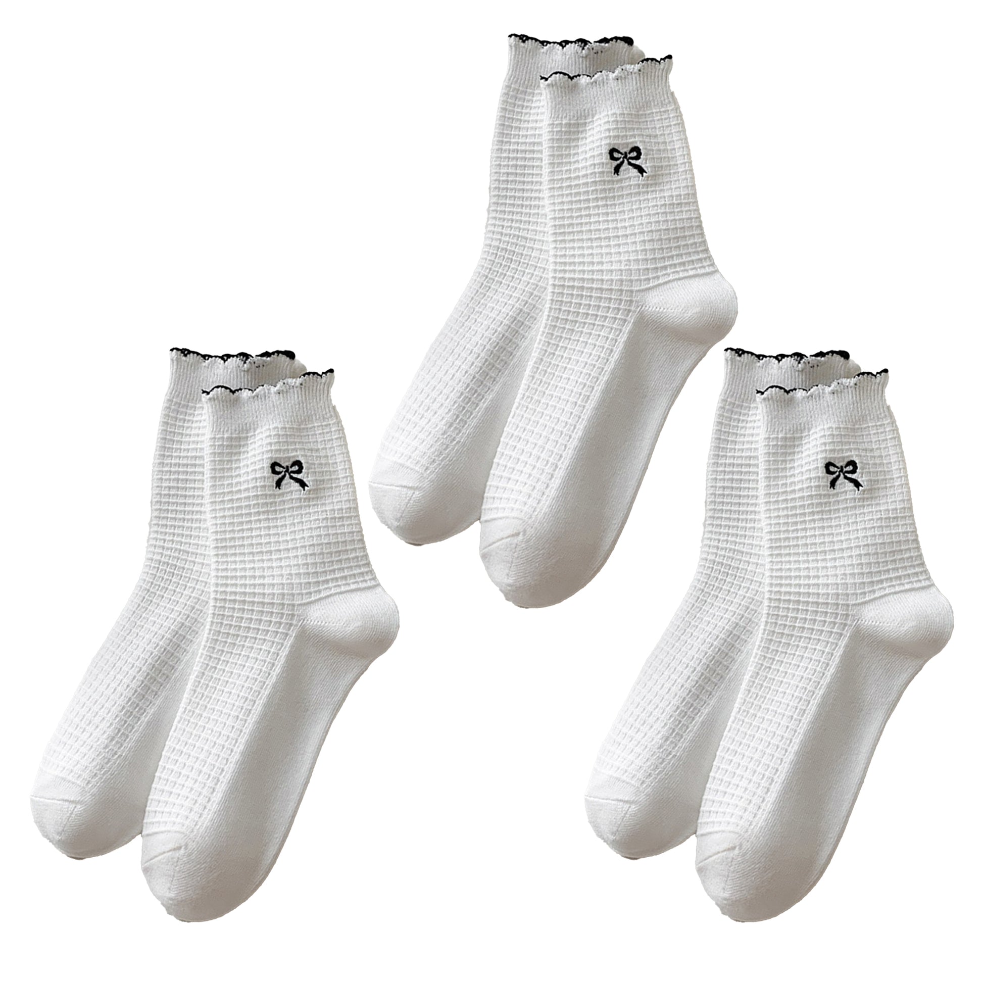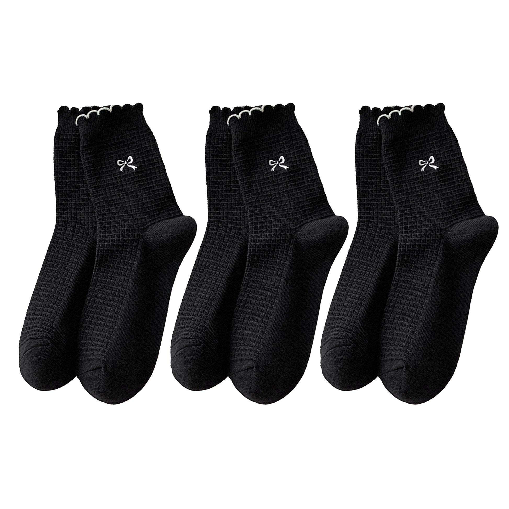 Women's 3 Pairs Knit Socks offer a stylish blend of comfort and charm in a coordinated set. Each pack includes 3 pairs in the same color, designed with a soft waffle knit texture, delicate bow embroidery, and feminine ruffle-edge cuffs. The ribbed construction ensures a secure fit, while the breathable knit fabric provides lasting comfort. Easy to pair with loafers, sneakers, or flats, these socks add a touch of elegance to everyday looks.