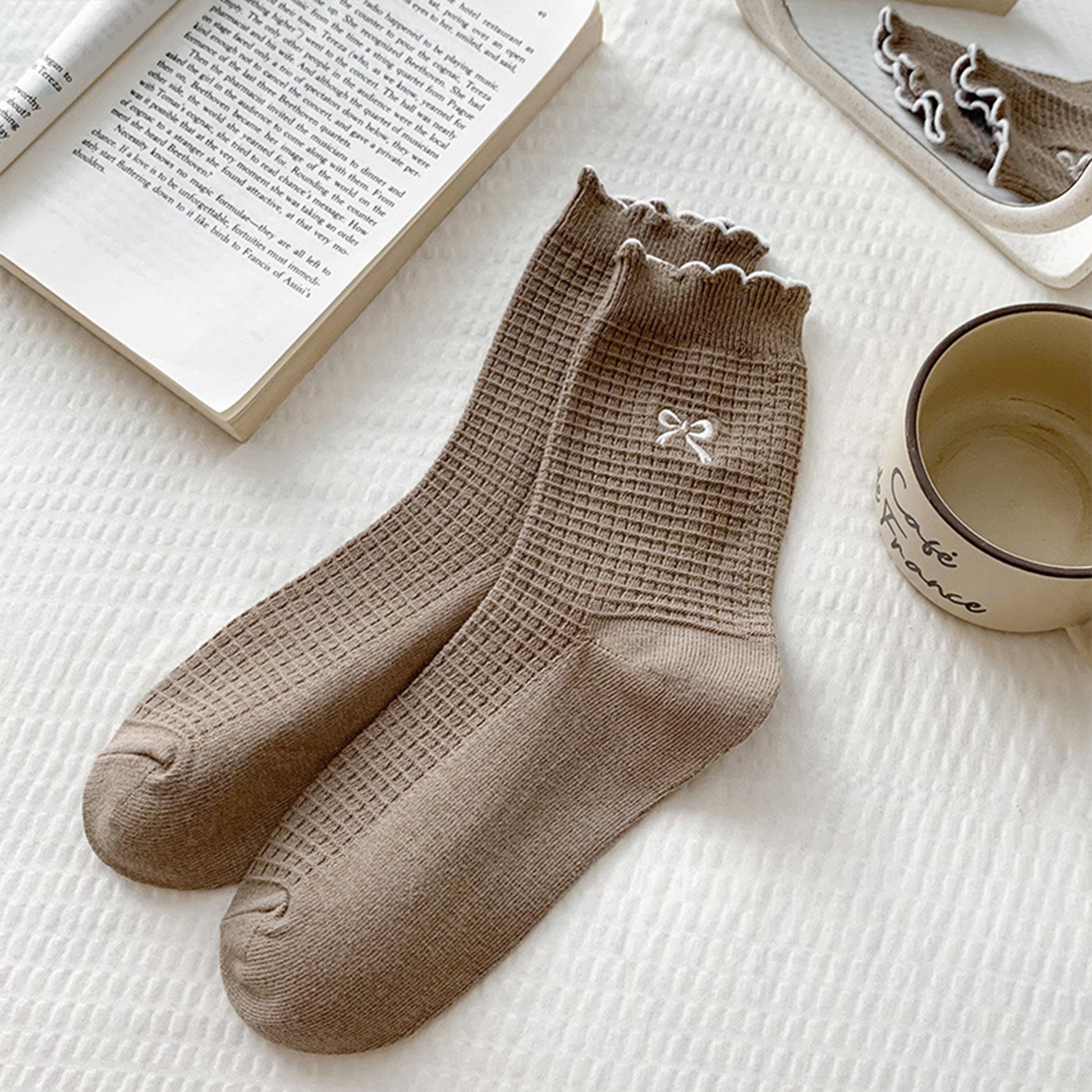 Anna-Kaci Women's 3 Pairs Knit Socks with Waffle Texture Bow Embroidery Ruffled Edge Ribbed Cuffs