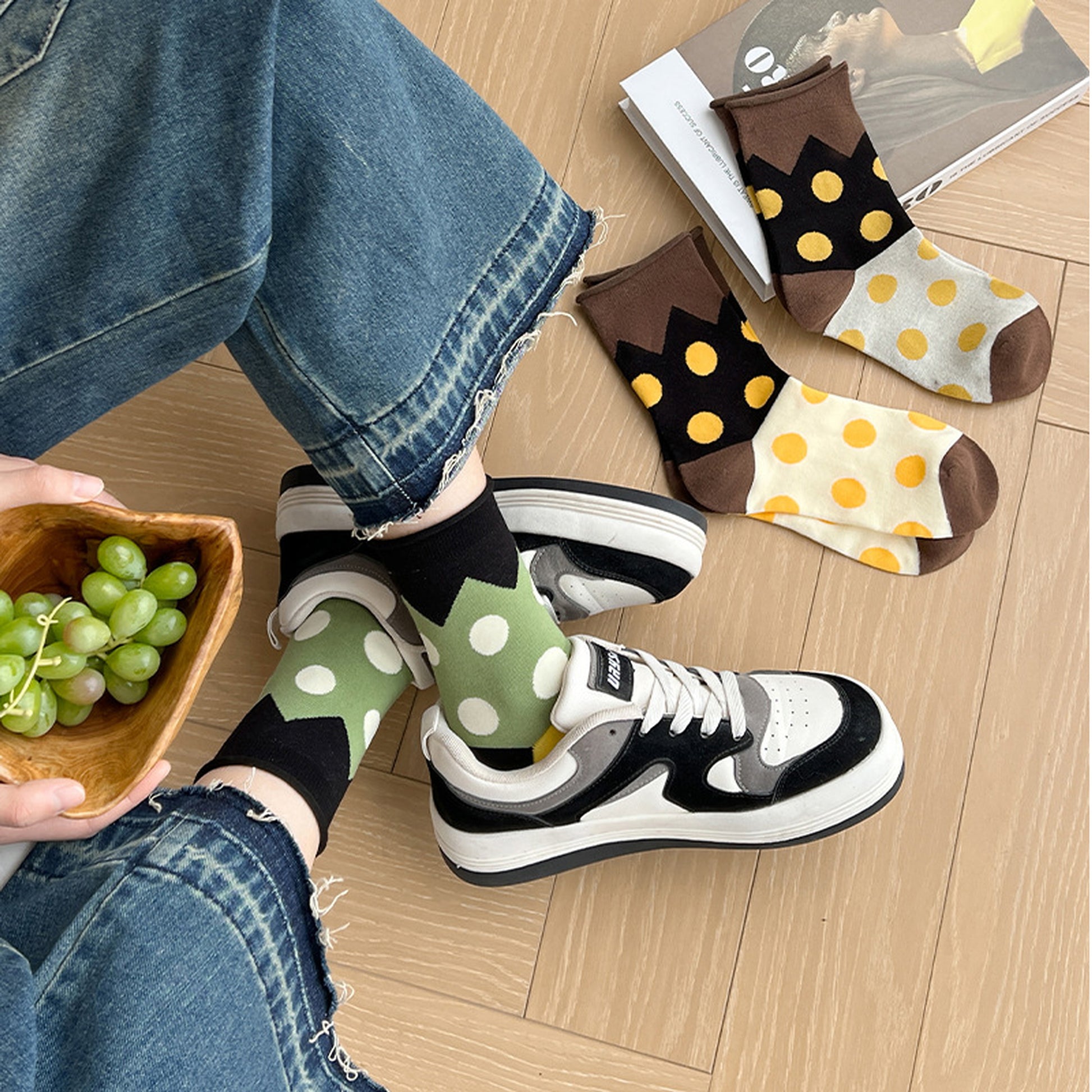 Elevate your sock game with our Women's Color - Blocked Polka Dot Cotton Ankle Socks, the ultimate choice for those who love to stay on - trend. These socks feature a bold color - blocking design with bright yellow, fresh green, and sleek black, making them a statement piece that's sure to turn heads. The classic white polka dots scattered across the colorful background add a playful and charming element, blending timeless style with modern fashion.