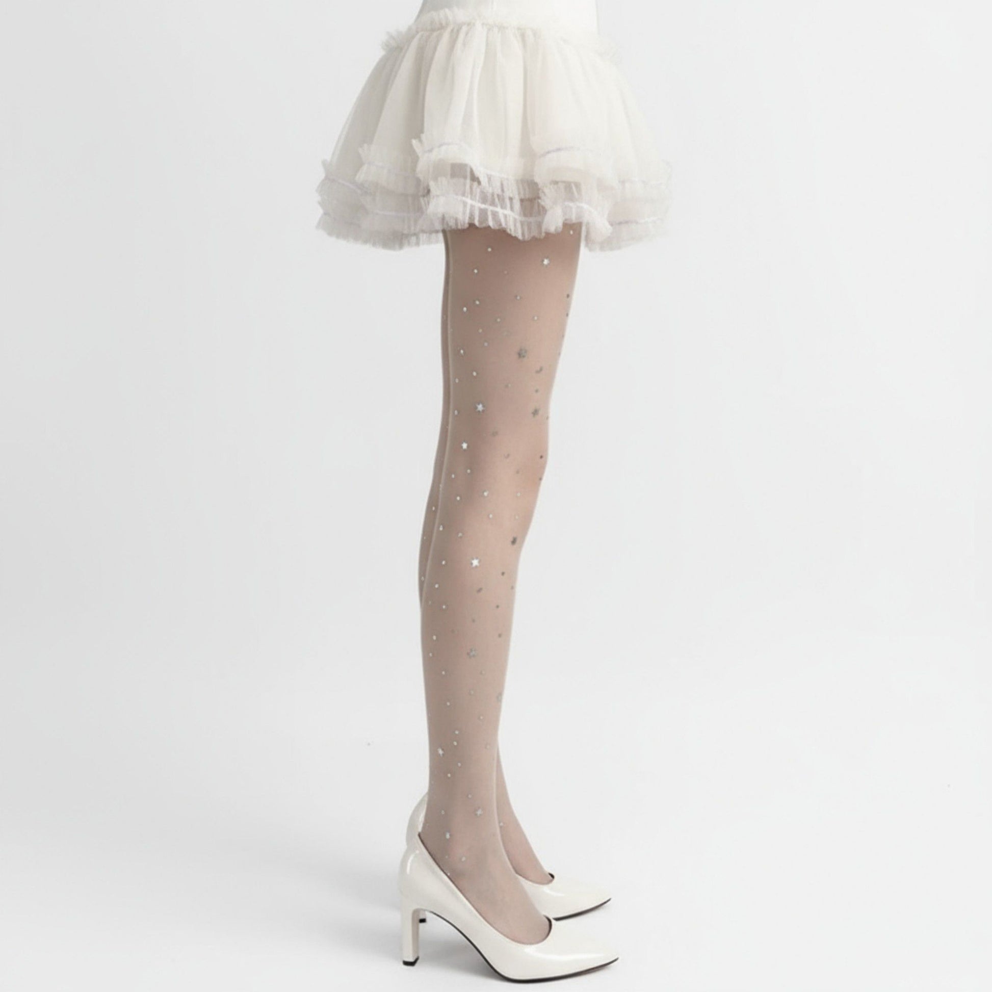 The Anna-Kaci Women's Sheer Star Pattern Tights add a whimsical sparkle to any outfit. Adorned with tiny star accents, these sheer tights bring a subtle shimmer that enhances your look with elegance and charm. Crafted from lightweight, breathable mesh fabric, they provide a comfortable stretch fit that moves effortlessly with you. Perfect for styling with dresses, skirts, or heels, these tights offer a delicate touch of glamour suitable for both casual and dressy occasions.