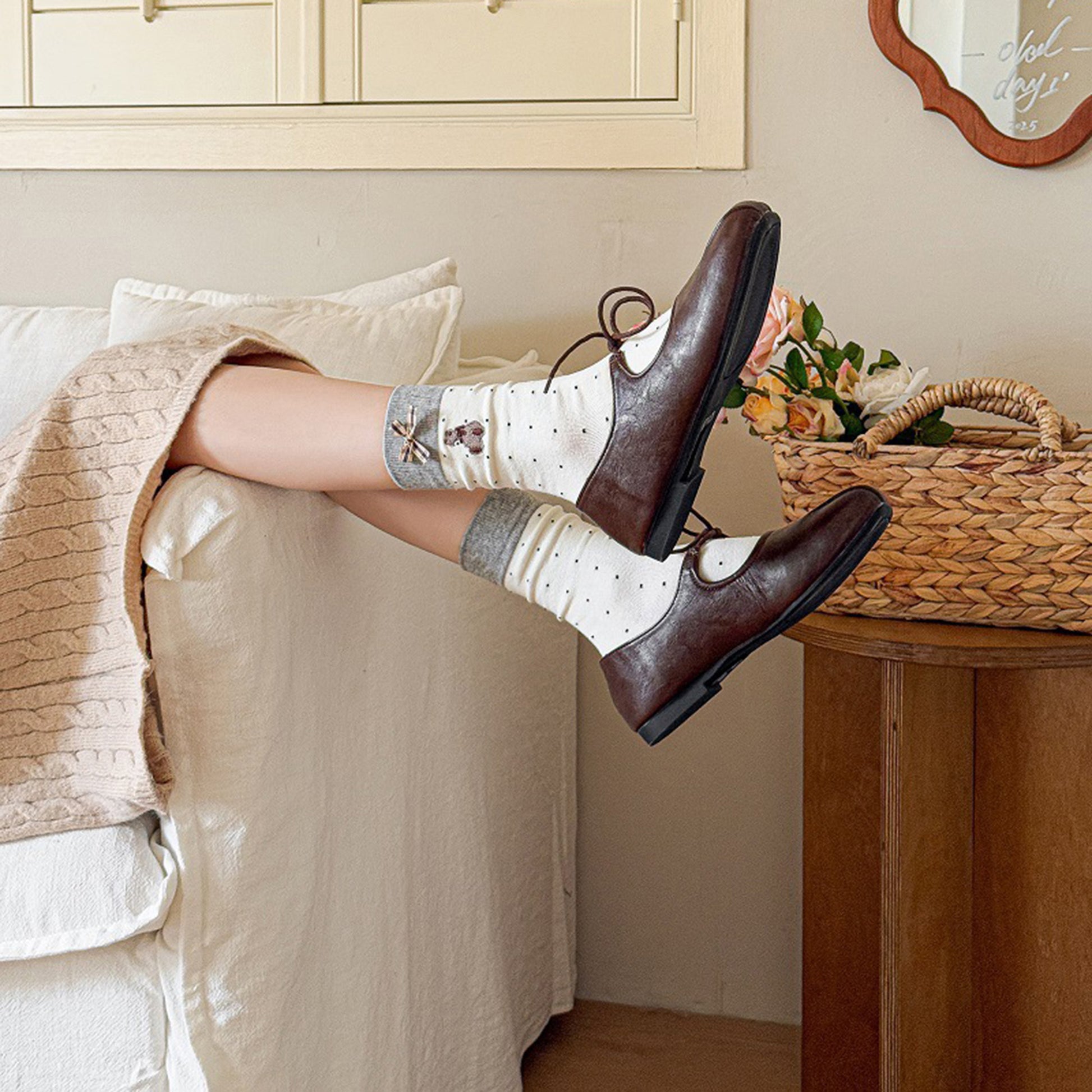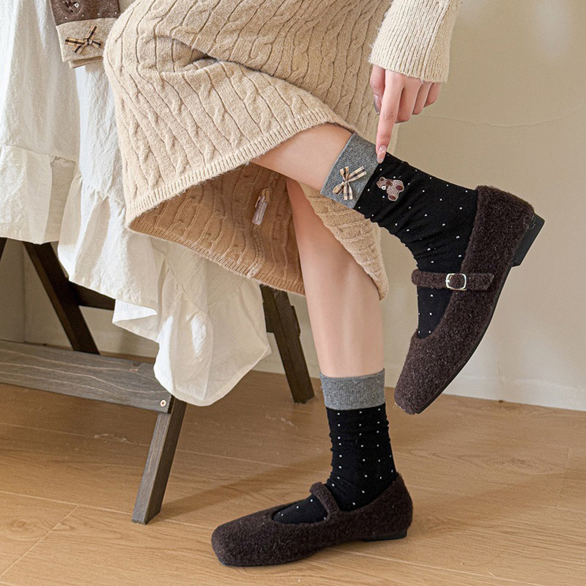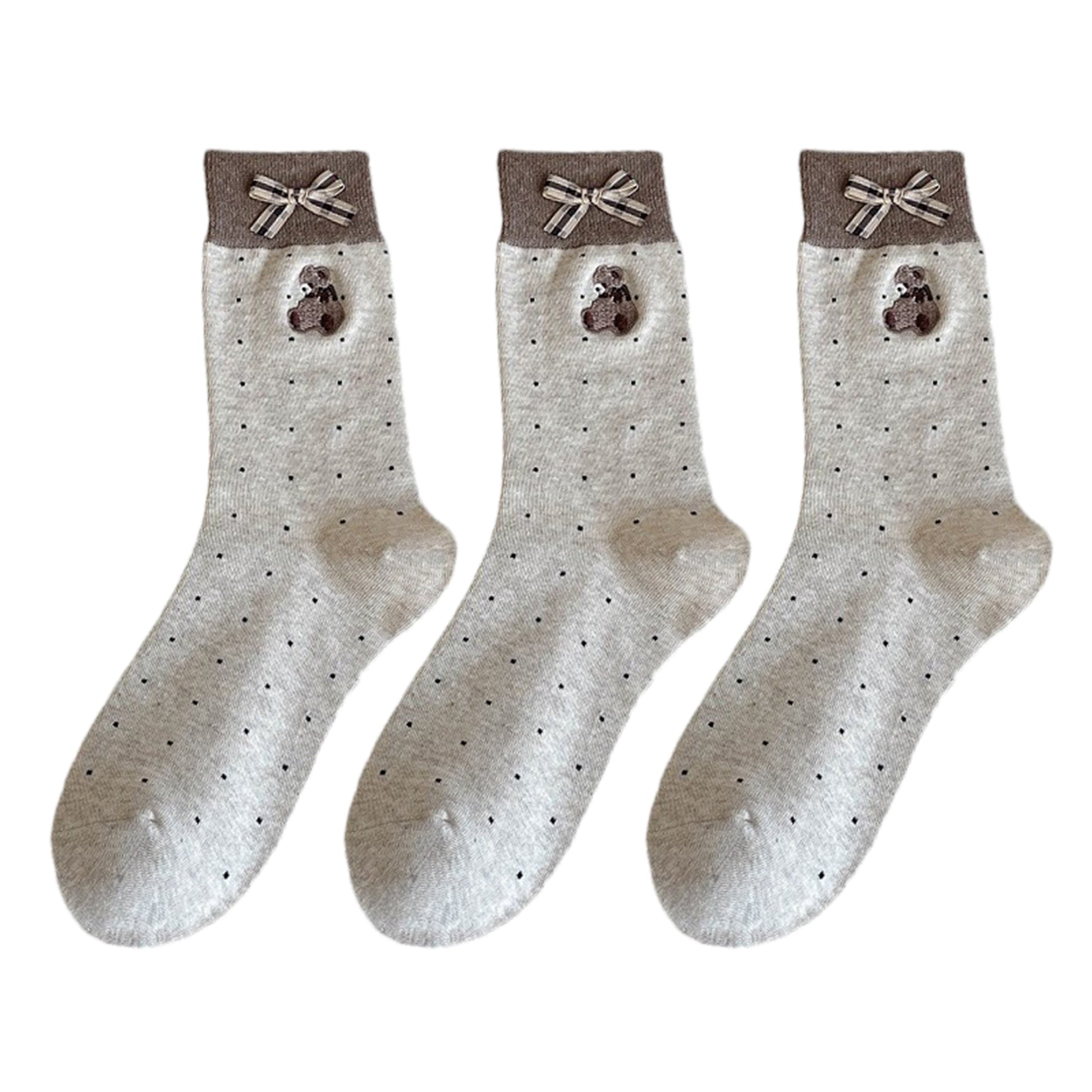 Anna-Kaci 3-Pair Soft Knit Crew Socks with Tiny Dot Pattern, Embroidered Bear Detail, Decorative Ribbon Bow Trim and Smooth Comfortable Stretch Fit
