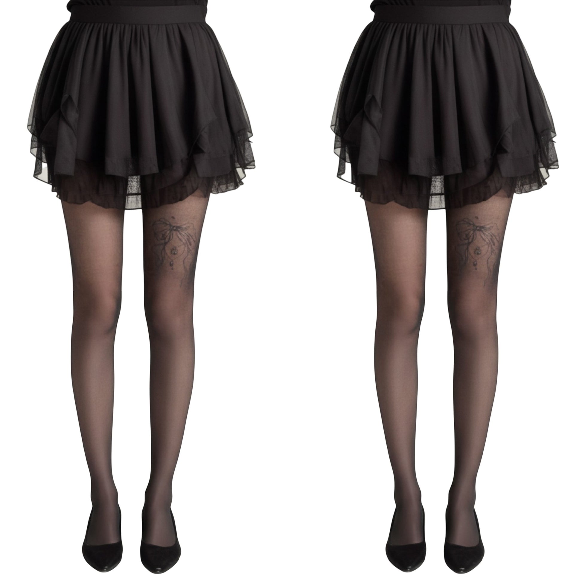 Anna-Kaci 2pcs Women's Sheer Full Length Tights with Decorative Bow Thigh Print and Soft Stretch Fit for Delicate Feminine Styling