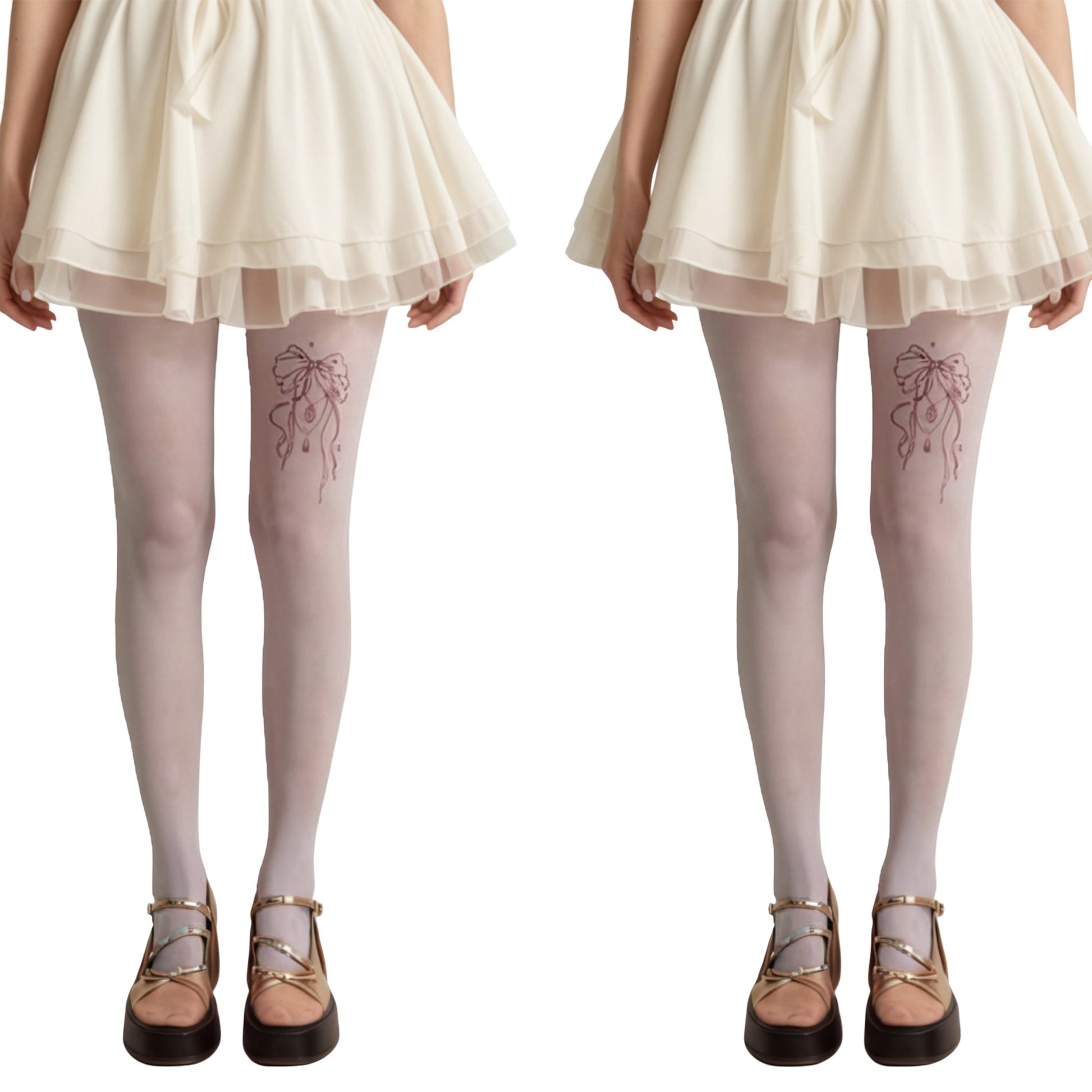 These sheer full length tights feature a delicate printed bow motif placed on the thigh for a soft, feminine accent. Crafted from lightweight stretch knit, they provide smooth coverage and a comfortable, flexible fit that enhances the natural shape of the legs. The subtle printed detail adds charm without overwhelming the look, making these tights a versatile pairing piece for skirts, dresses, and layered outfits. Designed for gentle wear and a polished finish.