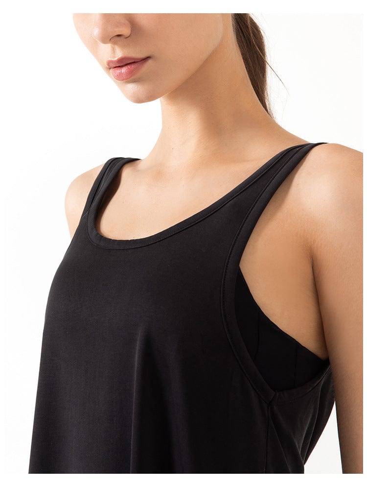 The Anna-Kaci tank top is detailed with a scoop neckline, and thick tank straps that connect in an open triangle back. Features a twist detail mid-back, and flares out to an open split that can be tied and falls below the hips. This light-weight, super breathable tank is perfect for laying over sports bras for a run, workout, hike, yoga, or even simply every day wear.