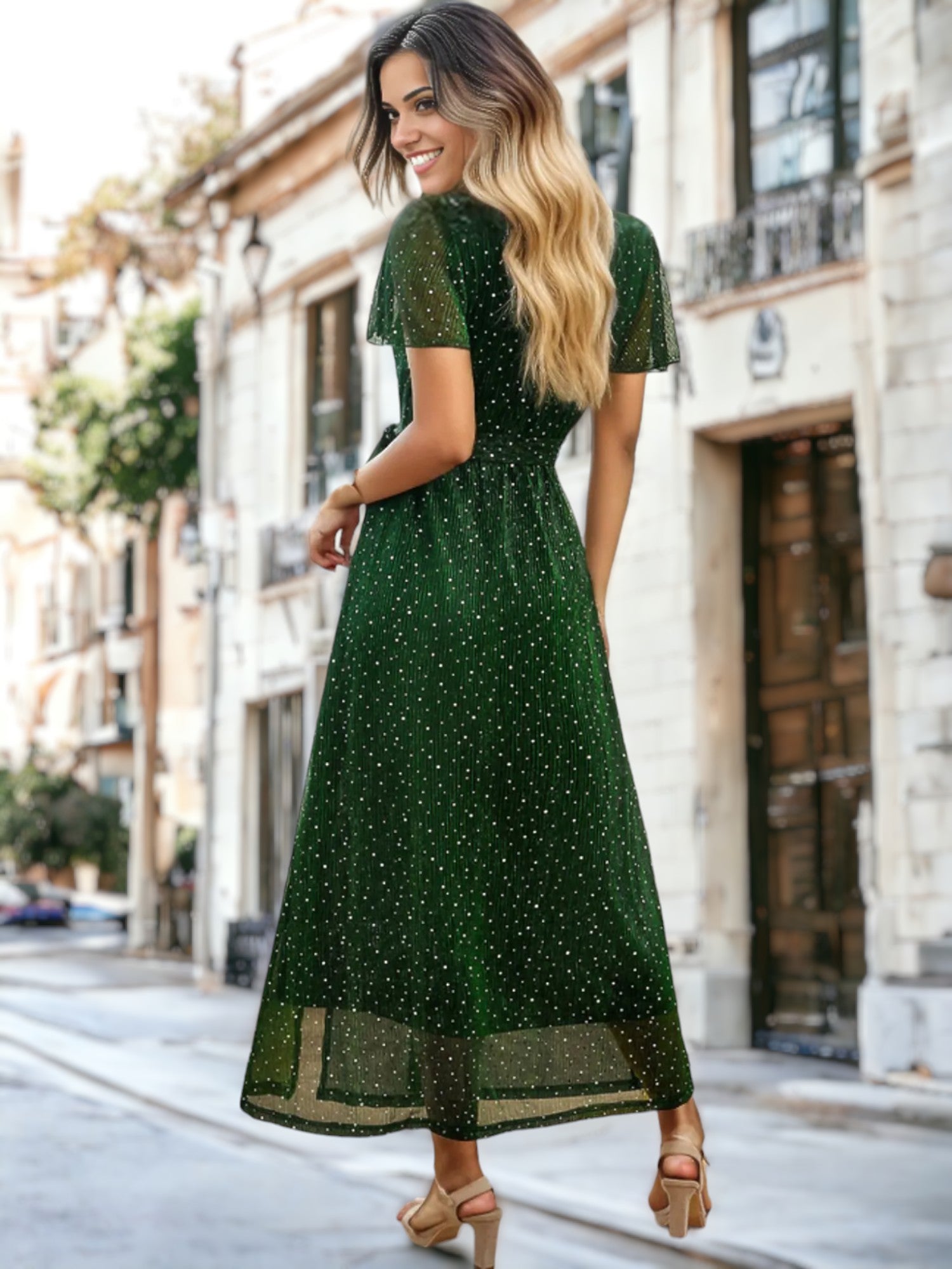 Sparkle Sheer Detail V-Neck Dot Sequin Dress