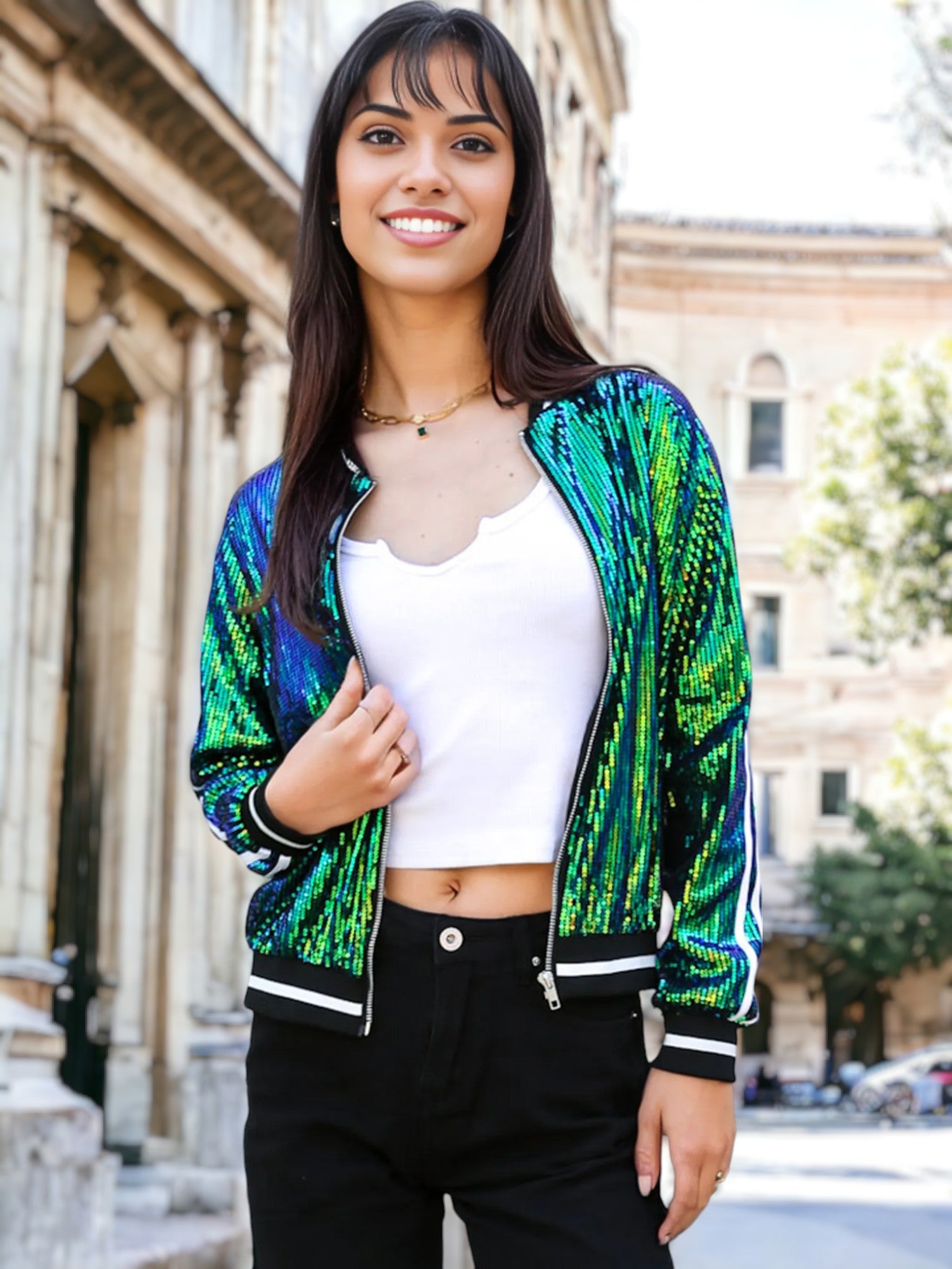 Embrace a touch of glamour with our Striped Metallic Sequin Varsity Jacket. This unique piece combines the sporty charm of a varsity jacket with the sparkle of metallic sequins, creating a stunning fusion of style. The stripes add a classic and athletic feel, while the sequins bring a dose of glamour to your look. Perfect for adding flair to casual outfits or making a statement at events, this jacket is a versatile and trendy choice. Elevate your outerwear collection with the Striped Metallic Sequin Varsity Jacket for a fashion-forward and eye-catching ensemble.