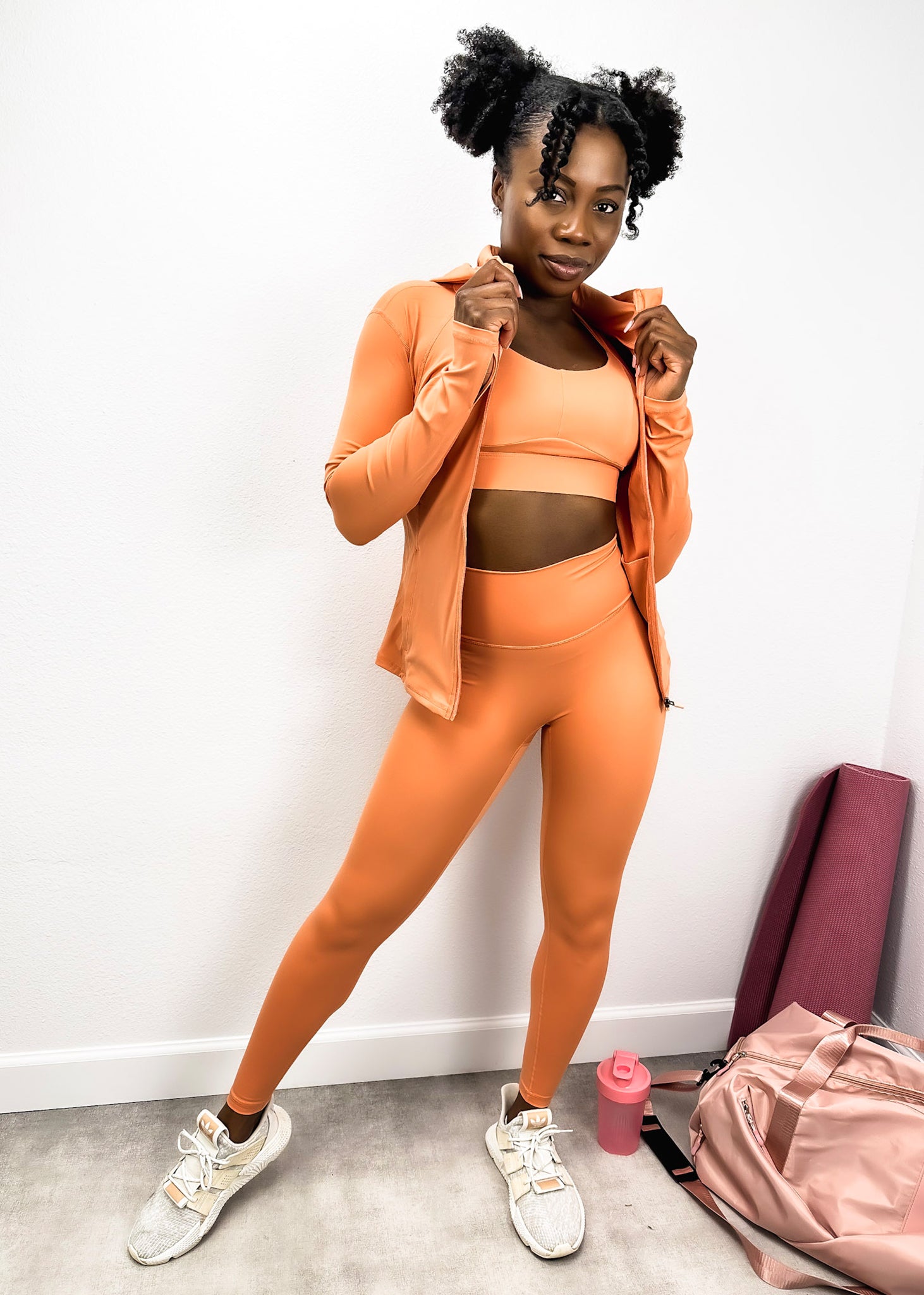 The Anna-Kaci jacket is detailed with defining body contour seams, full length sleeves, and two front pockets. Features a full zipper closure, hood, thumbholes, falls at hip length, and features a built in vented upper back panel for breathability. This workout set also comes with a matching sports bra, detailed with a body contouring seams, scoop neck and thick tank straps for support, and a clasp adjustable crossover racer open back. To finish the look, the matching leggings are high waisted, and feature body contouring back seams for a lifting effect, and are at 7/8 length. This buttery soft, light-weight, quick-drying, full workout set is the easiest cute go-to for any of your yoga classes, gym sessions, hikes, or for simply running errands.