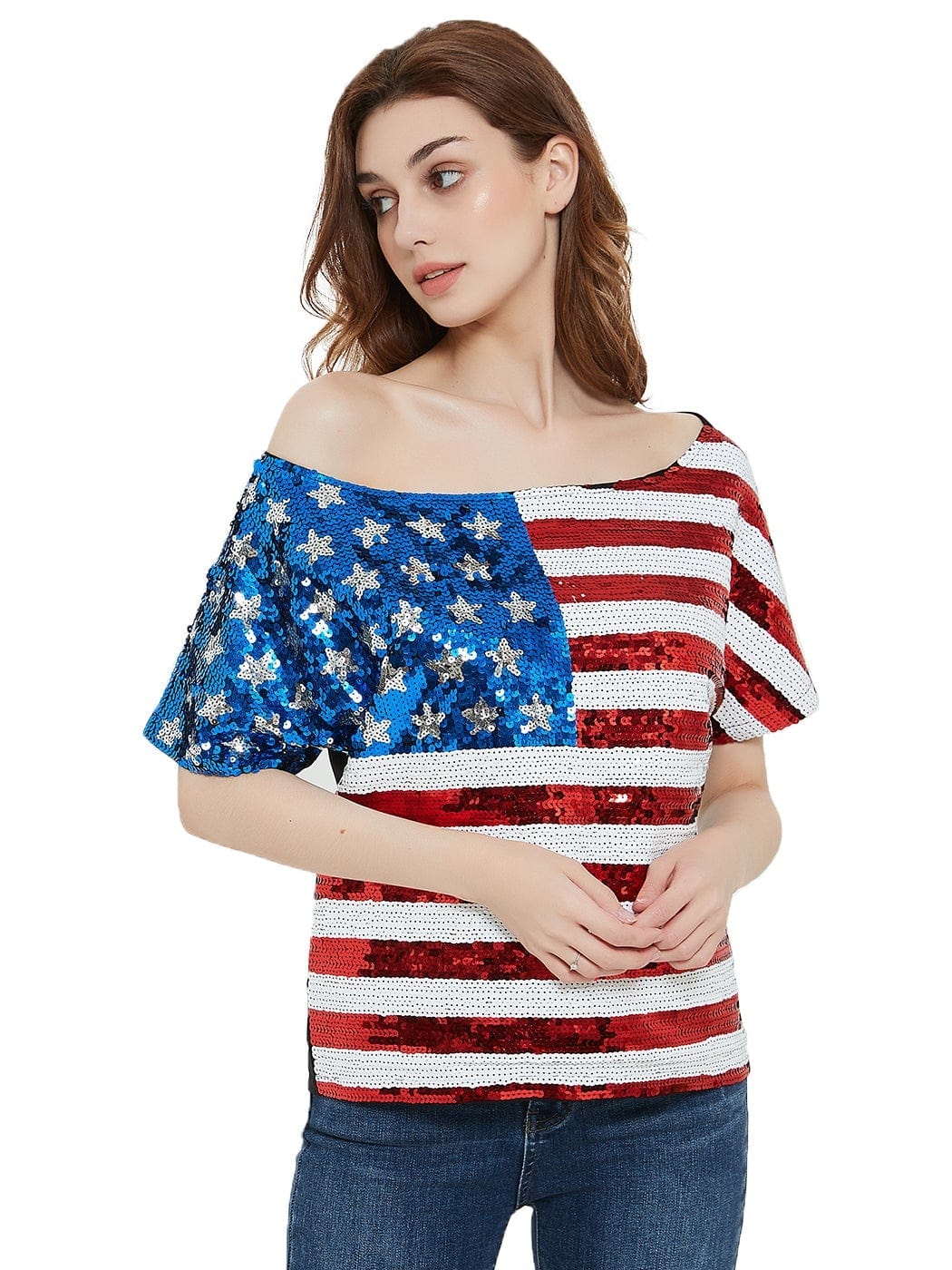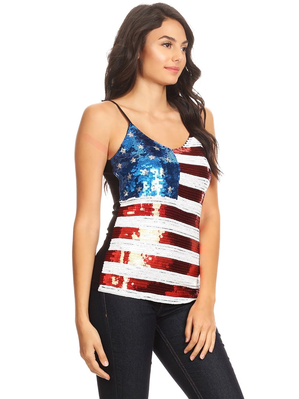 - STAR SPANGLED SEQUIN CAMISOLE. Show off your pride for the home of the brave and land of the free with this patriotic deep v neck camisole top. Sparkling red, white, and blue sequins come together to replicate the flag of the United States.