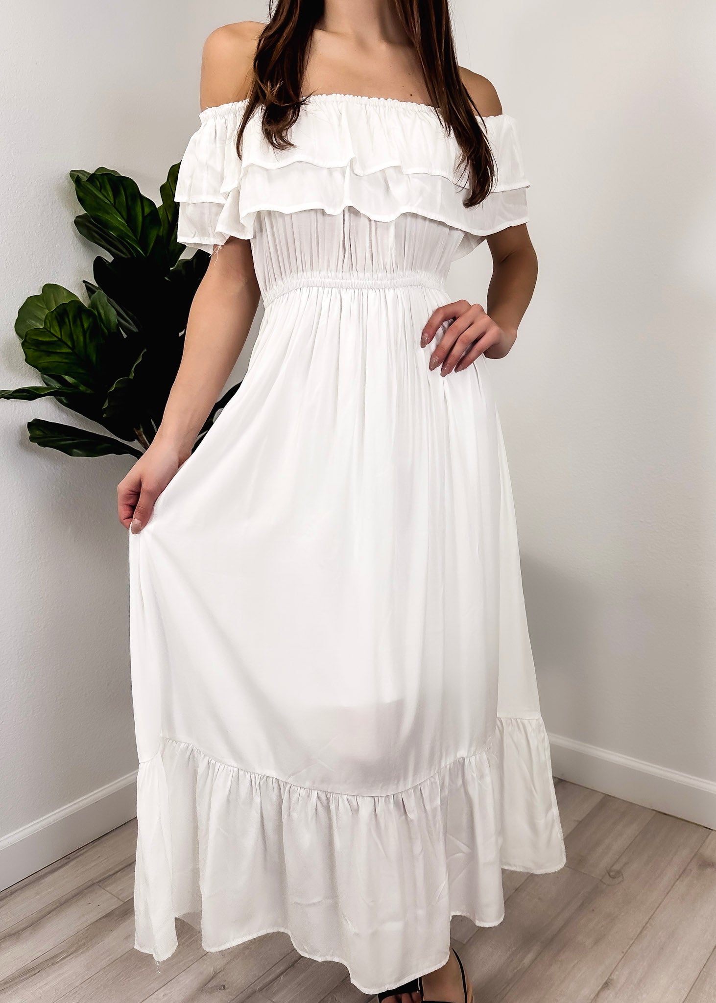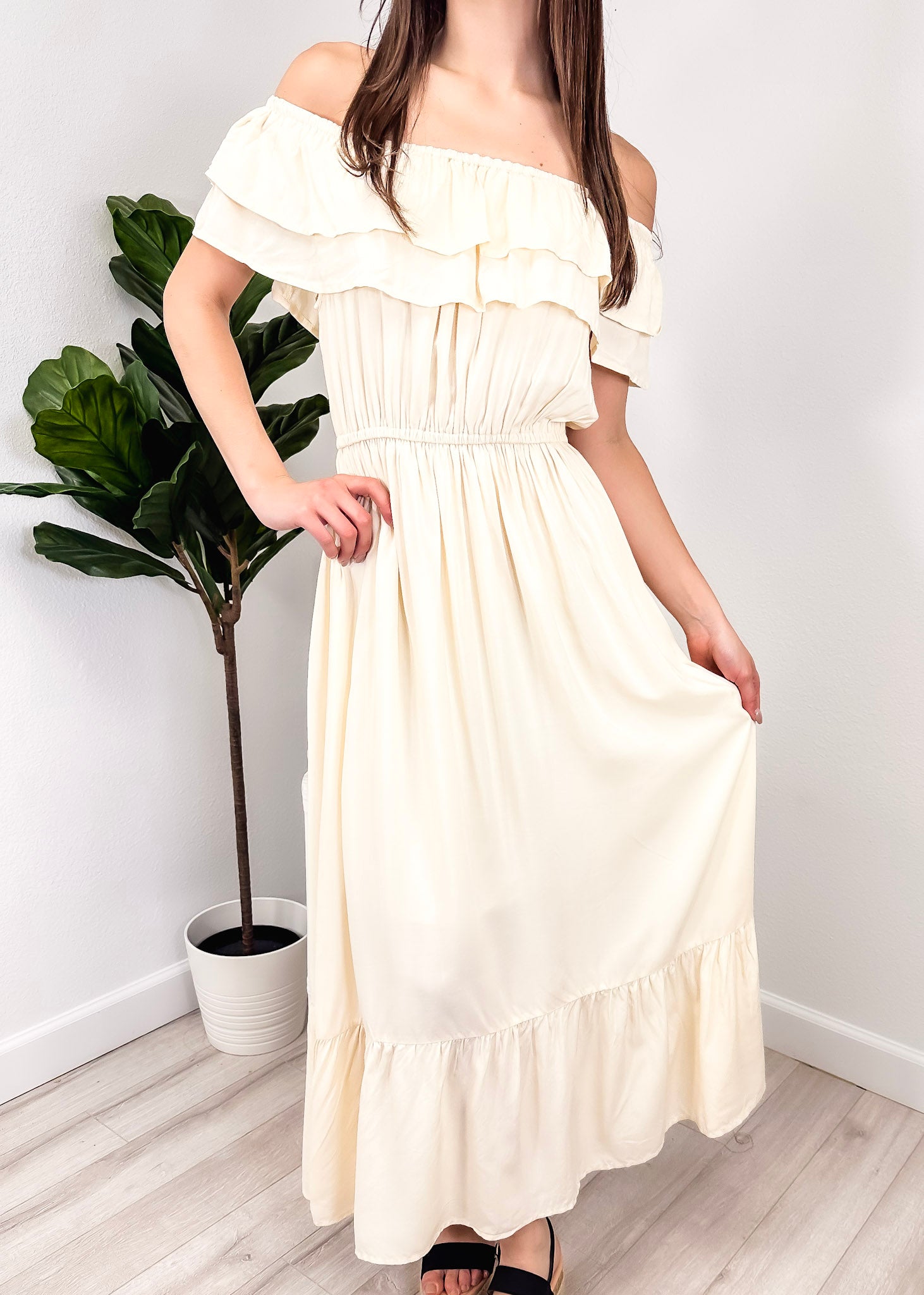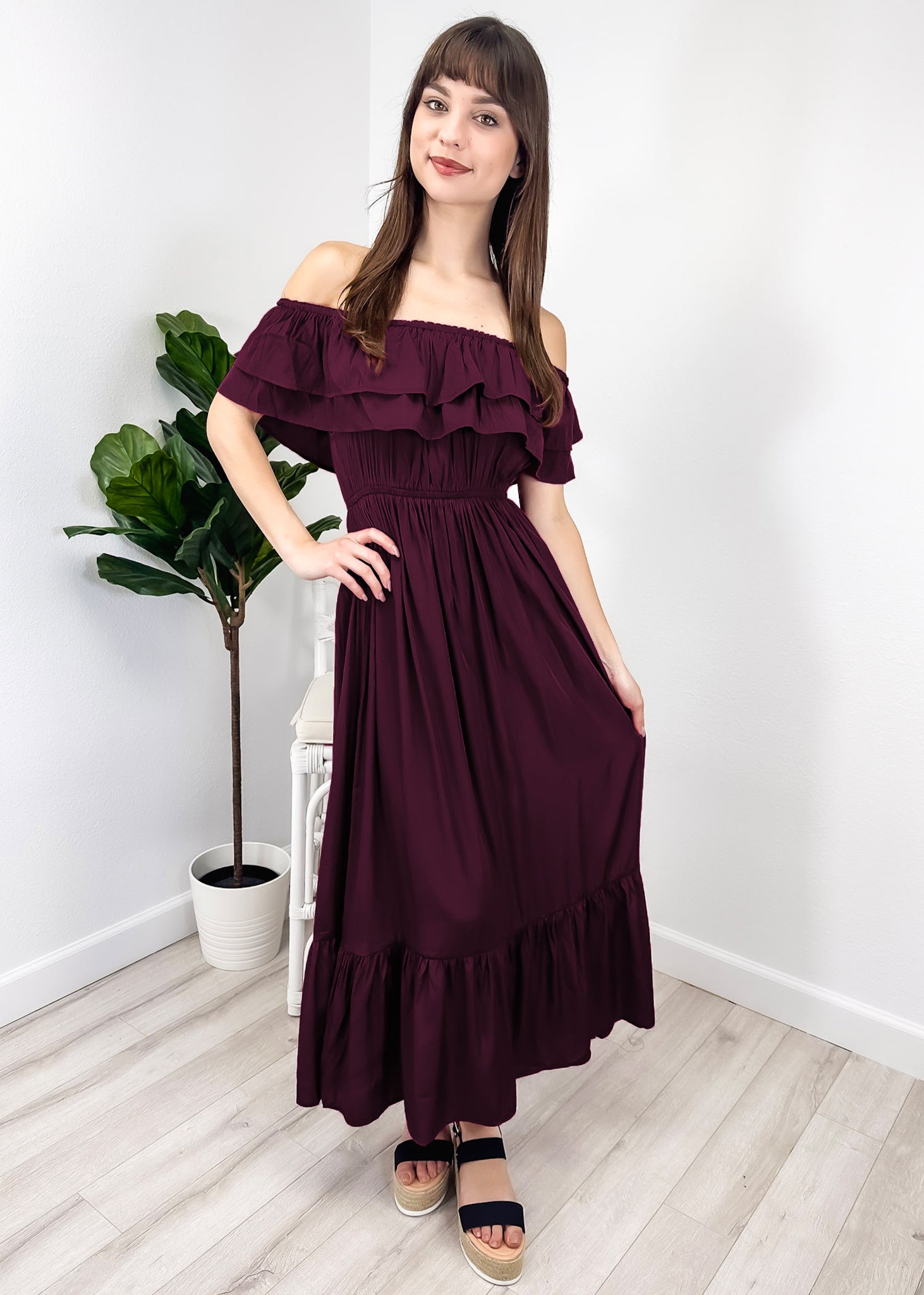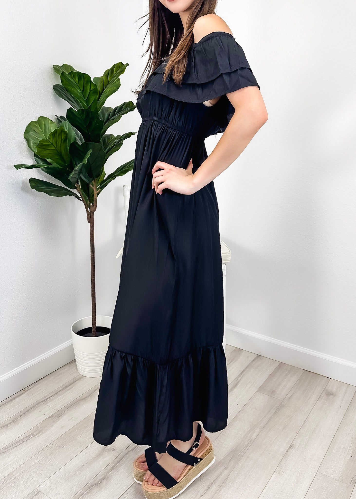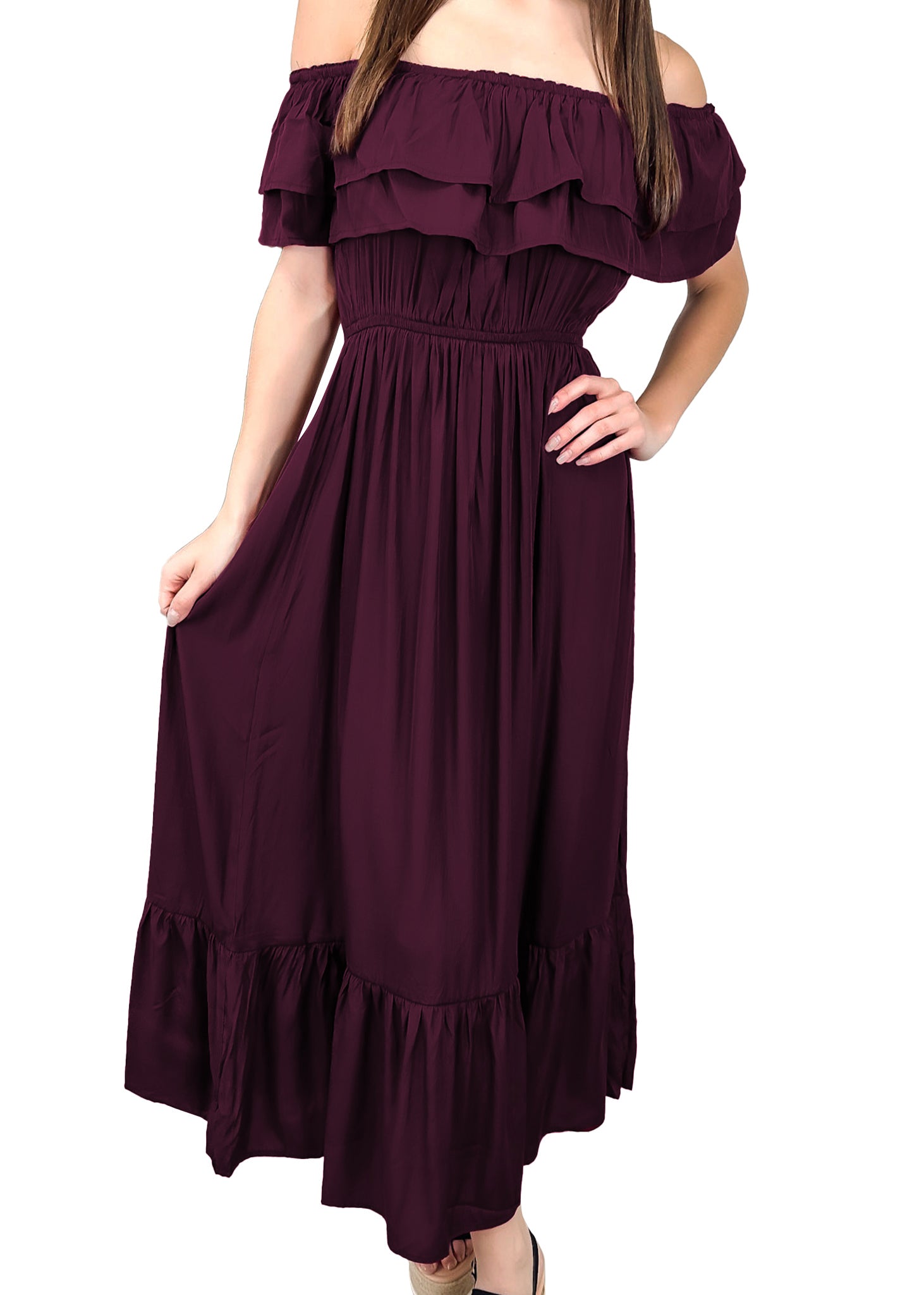 - A gorgeous long maxi dress with square neckline, accented by a ruffle fringe and a gathered stretchy waist. A versatile piece for any wardrobe.