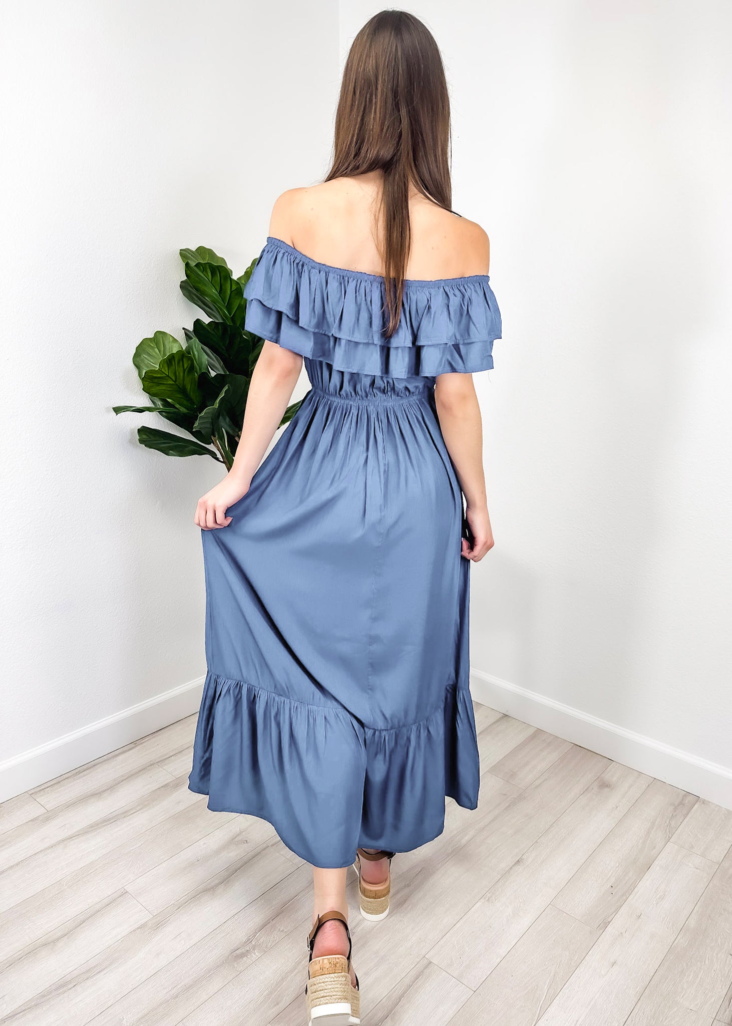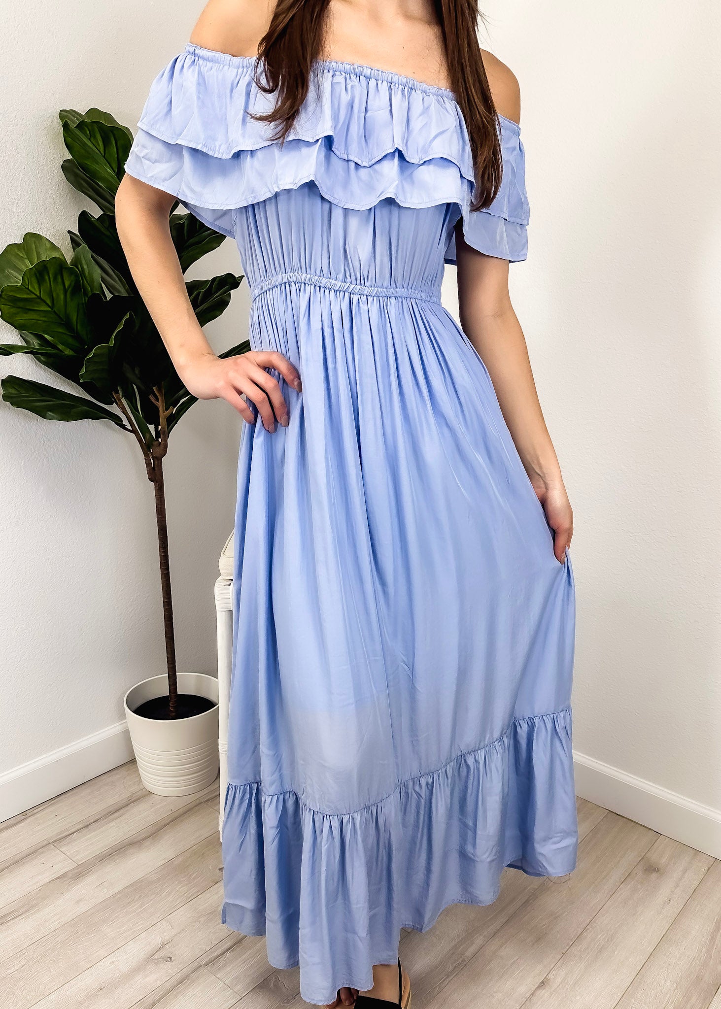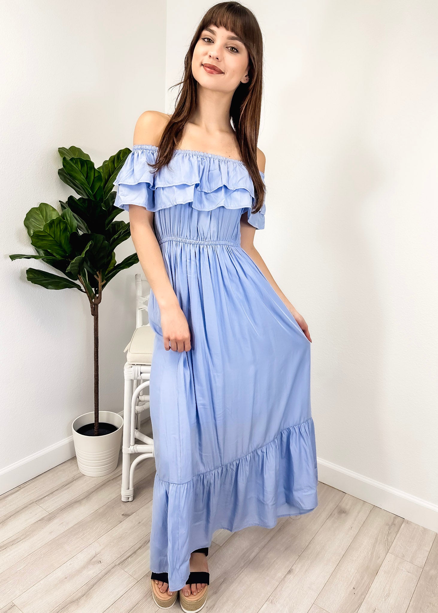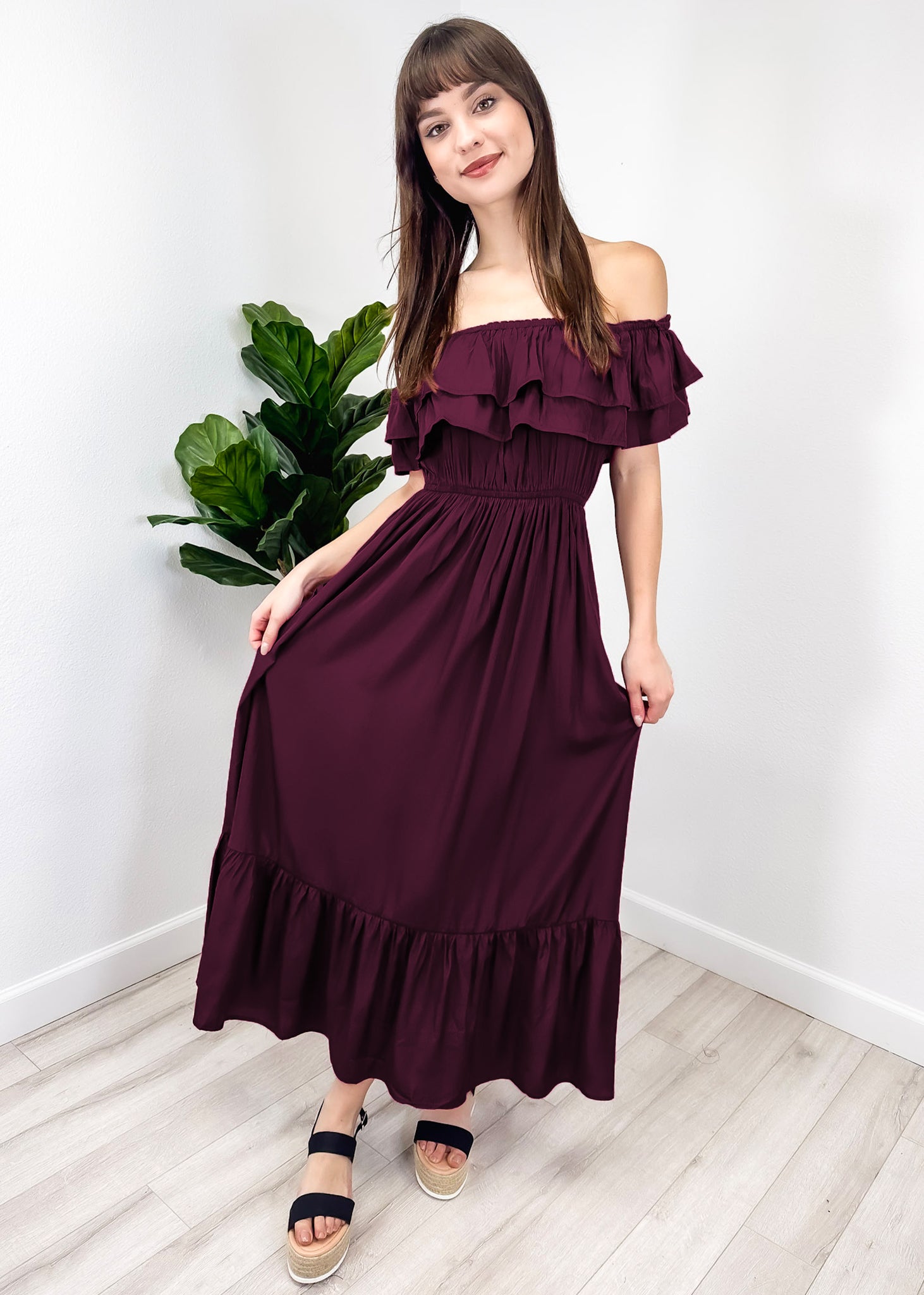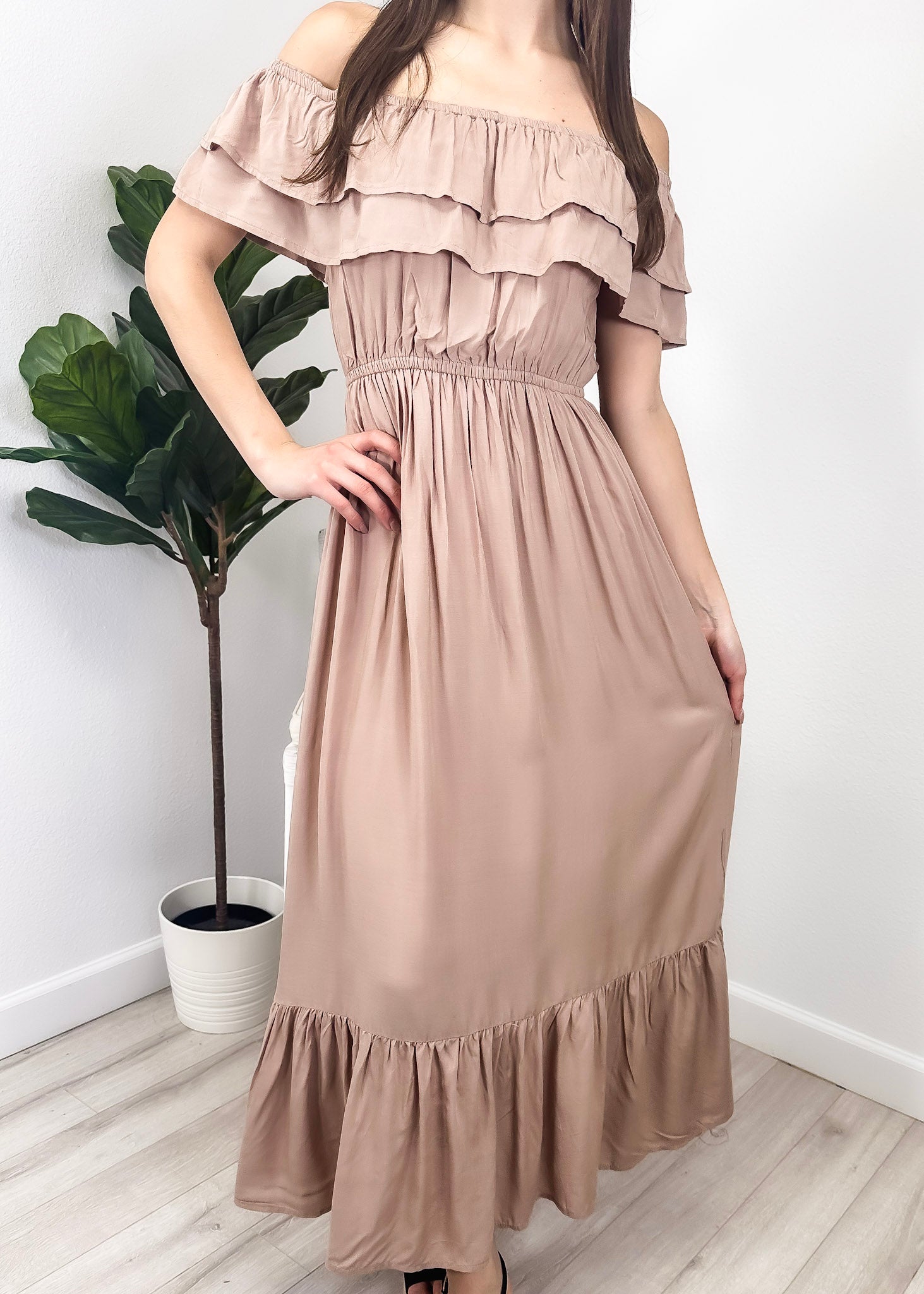 - A gorgeous long maxi dress with square neckline, accented by a ruffle fringe and a gathered stretchy waist. A versatile piece for any wardrobe.
