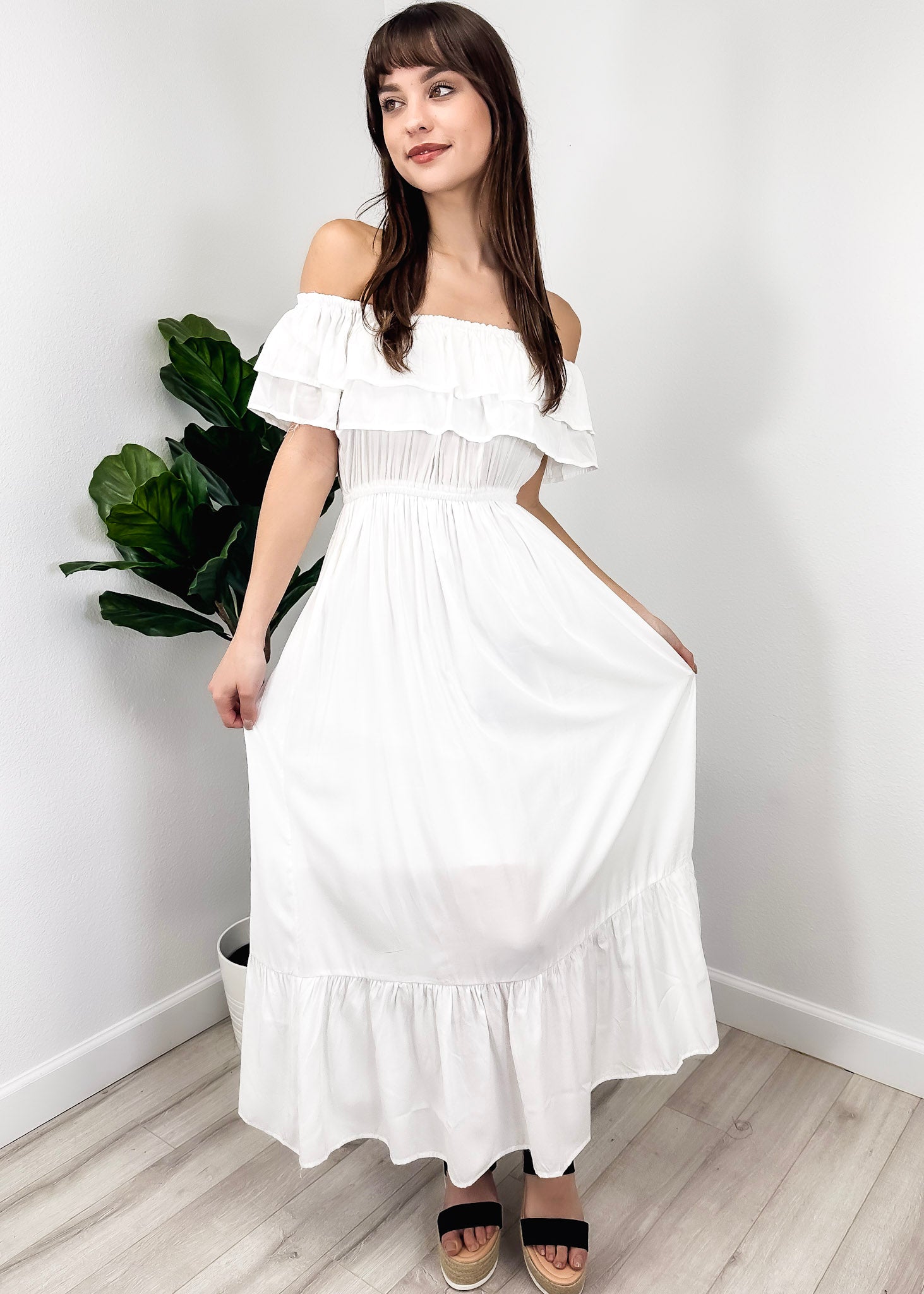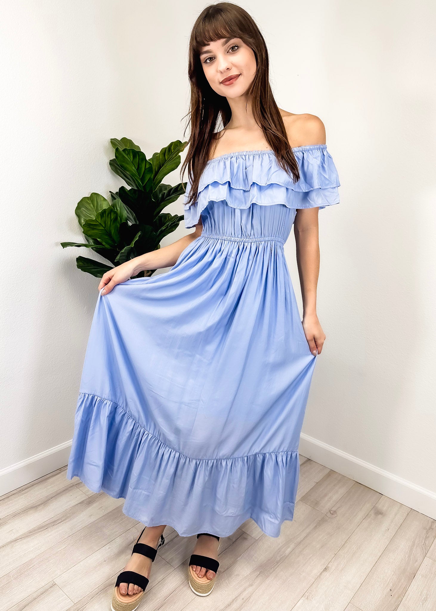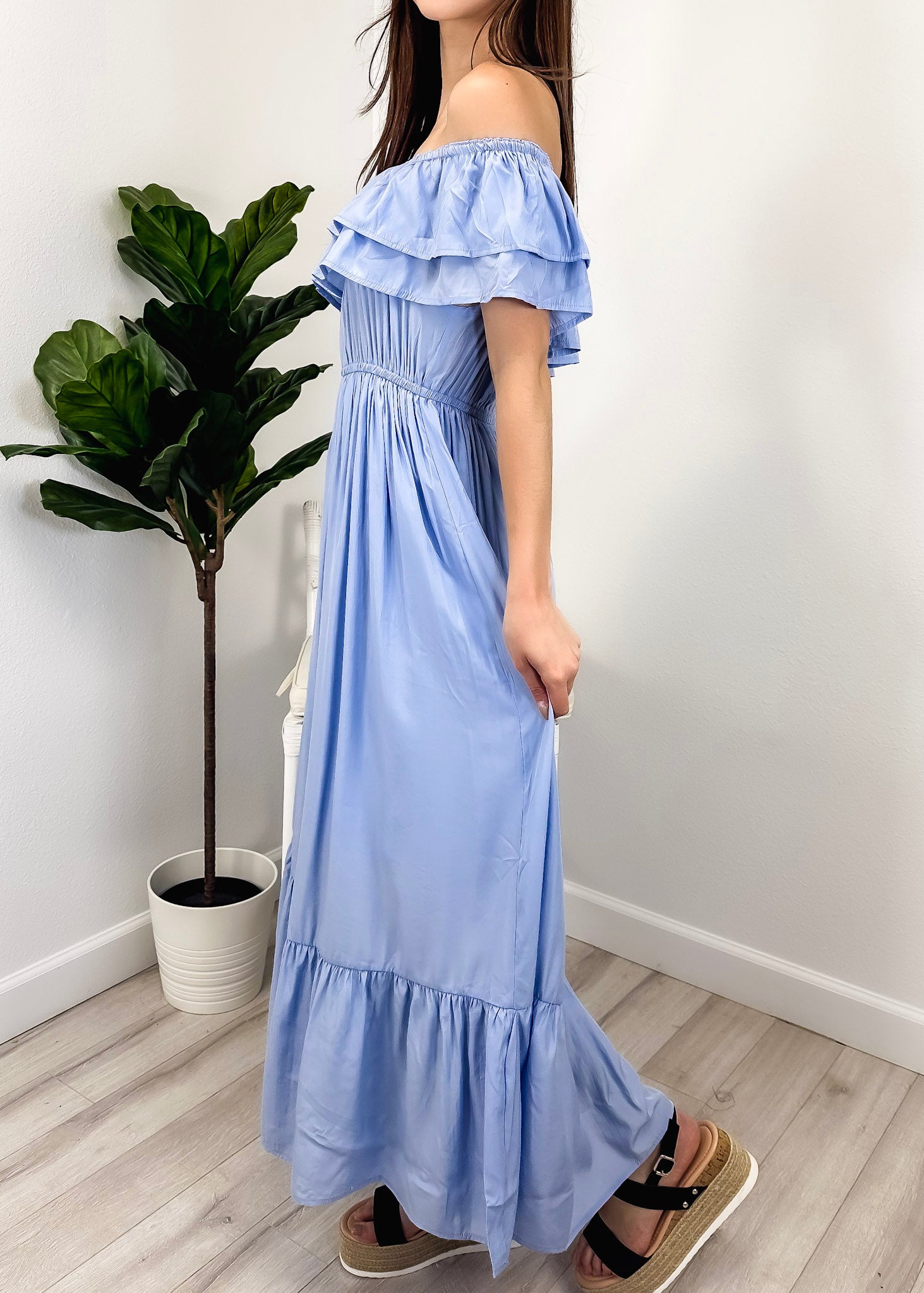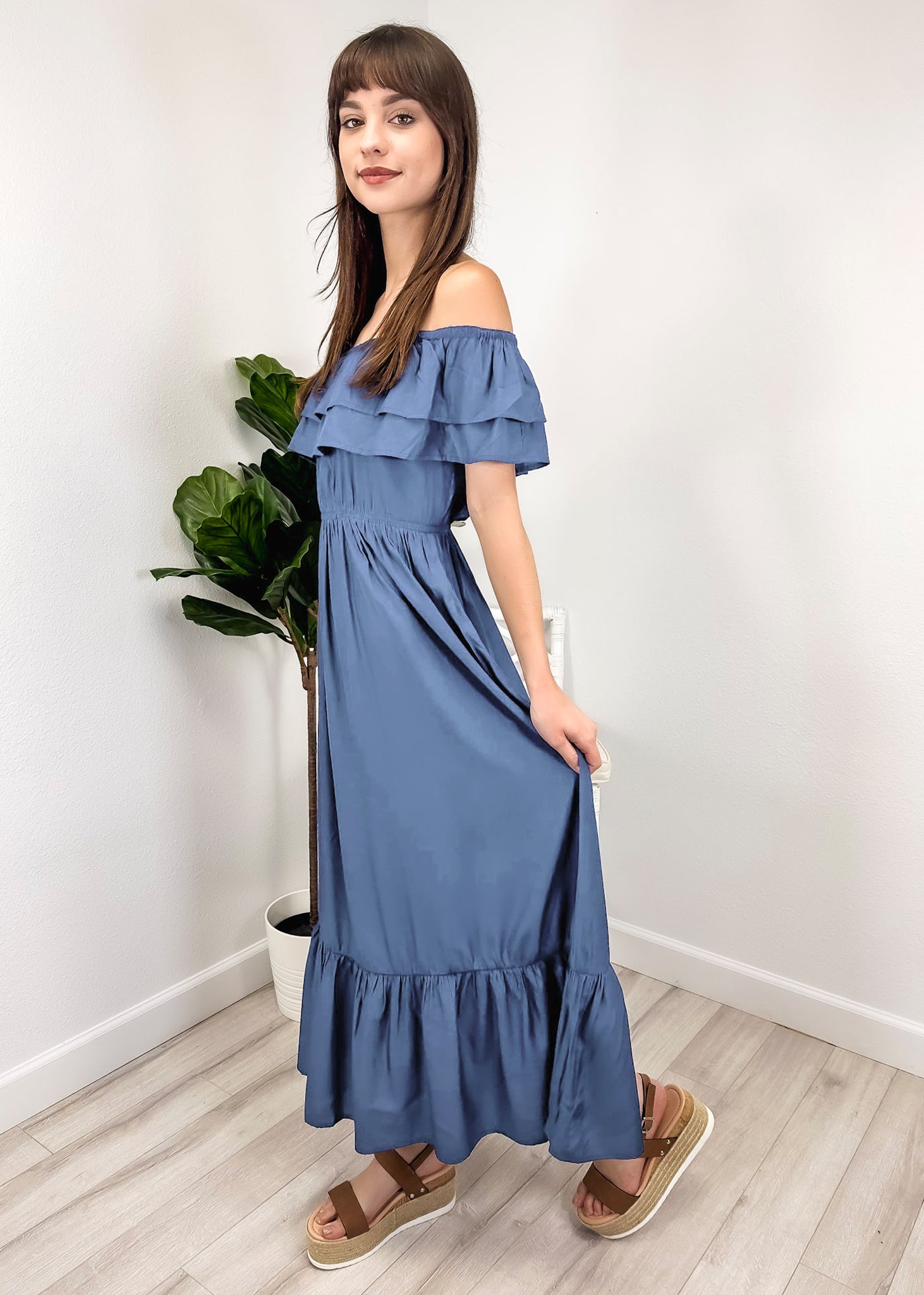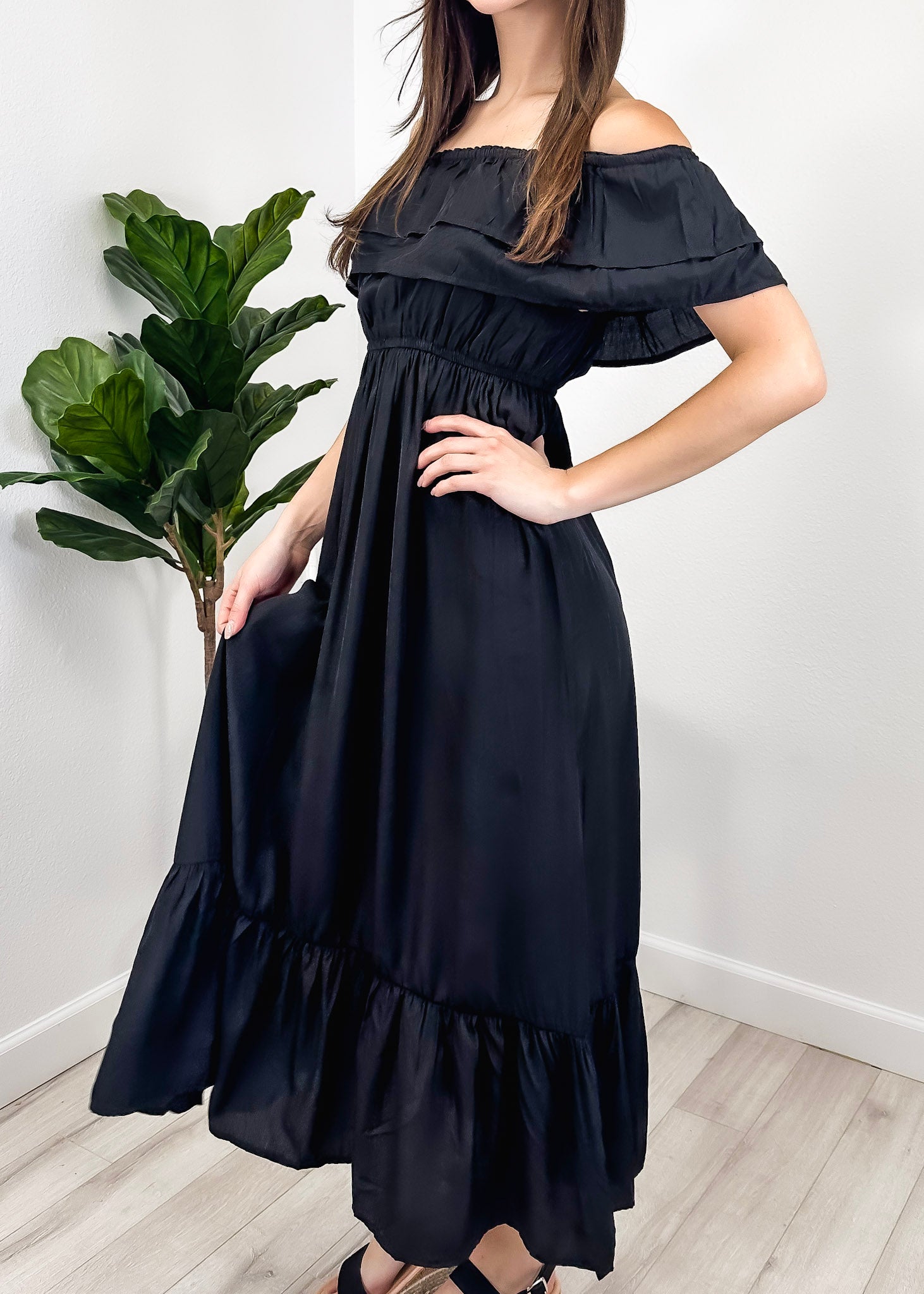 - A gorgeous long maxi dress with square neckline, accented by a ruffle fringe and a gathered stretchy waist. A versatile piece for any wardrobe.