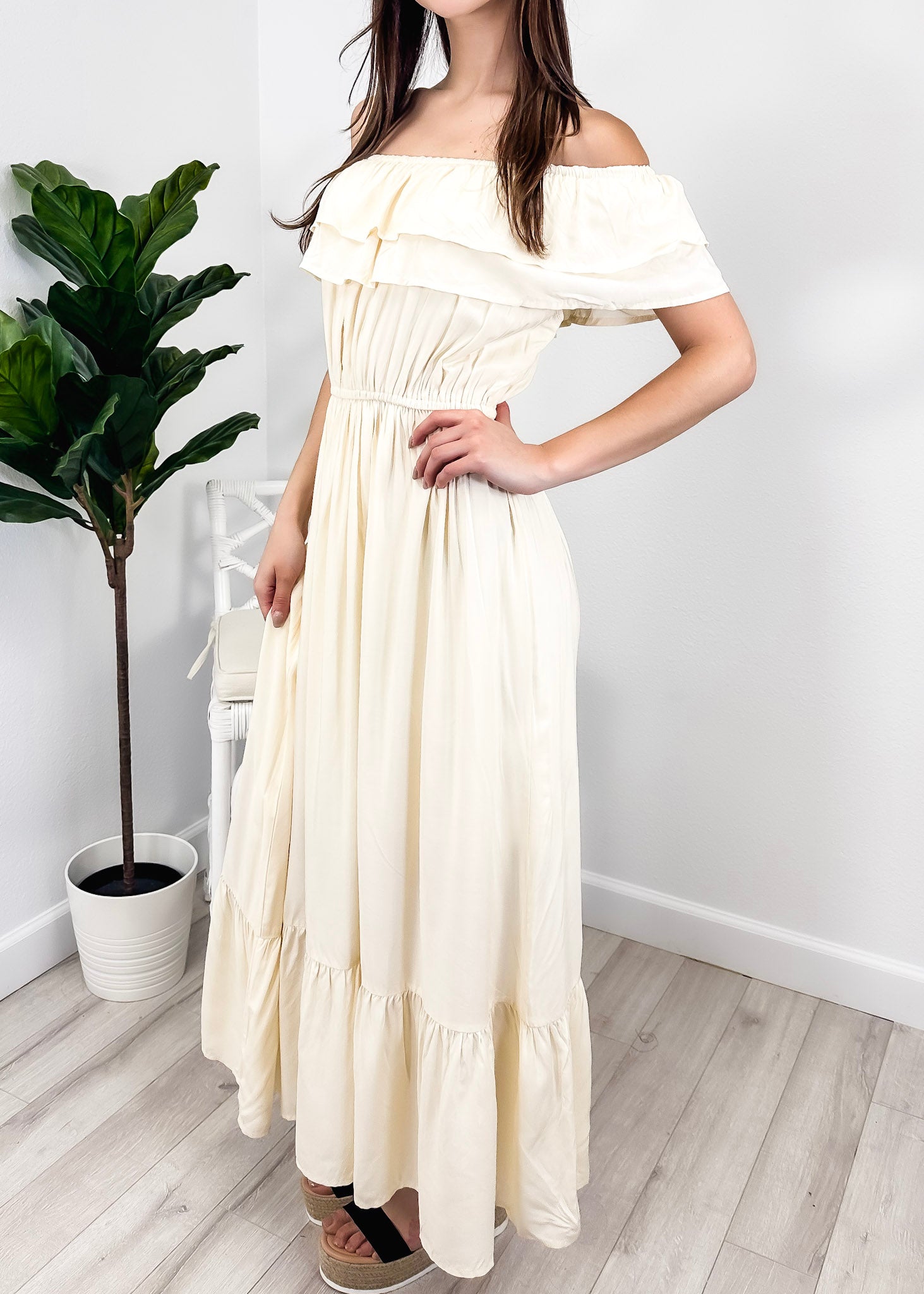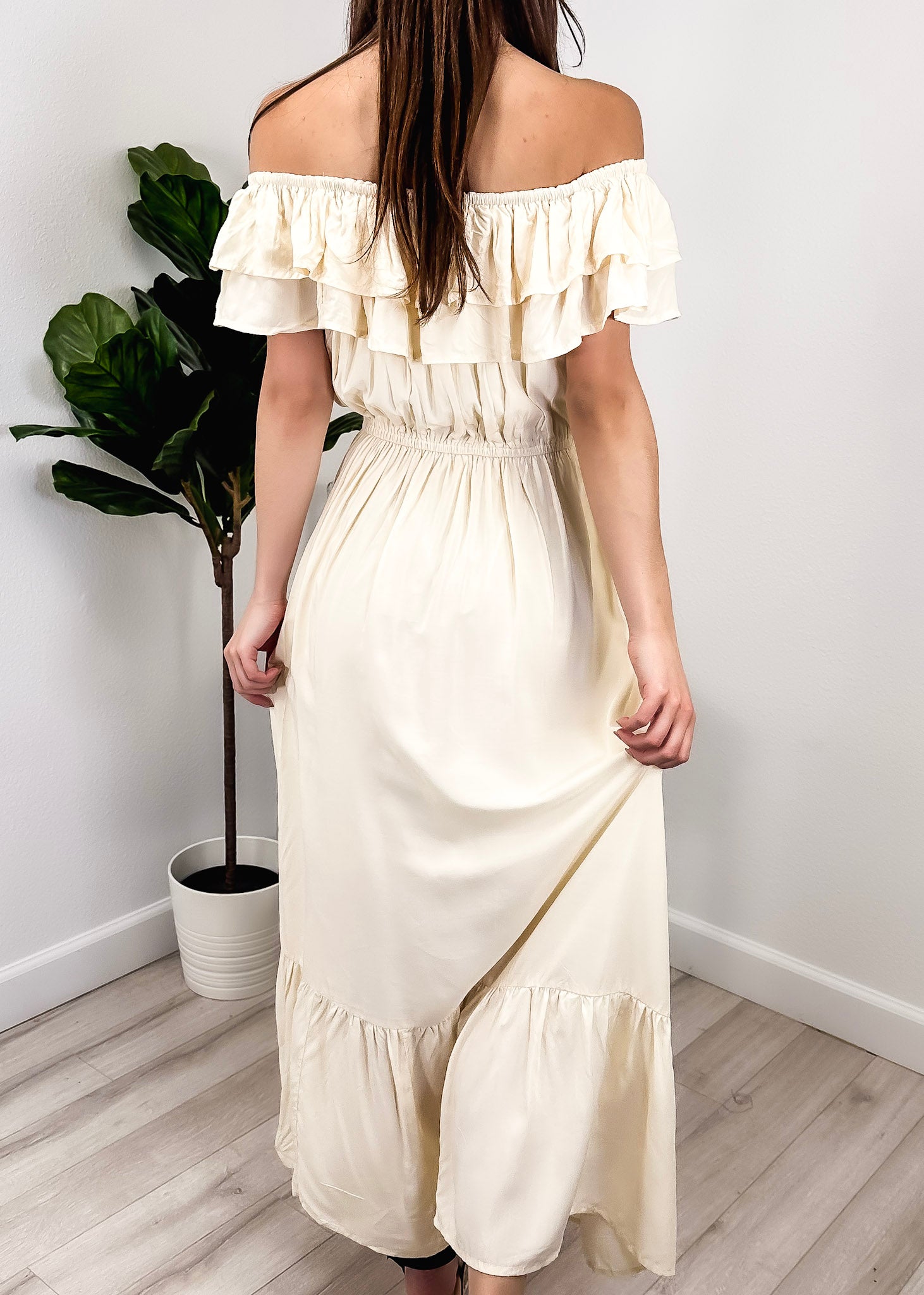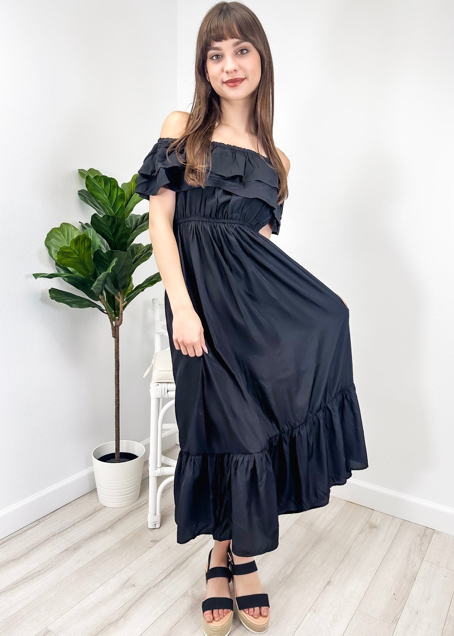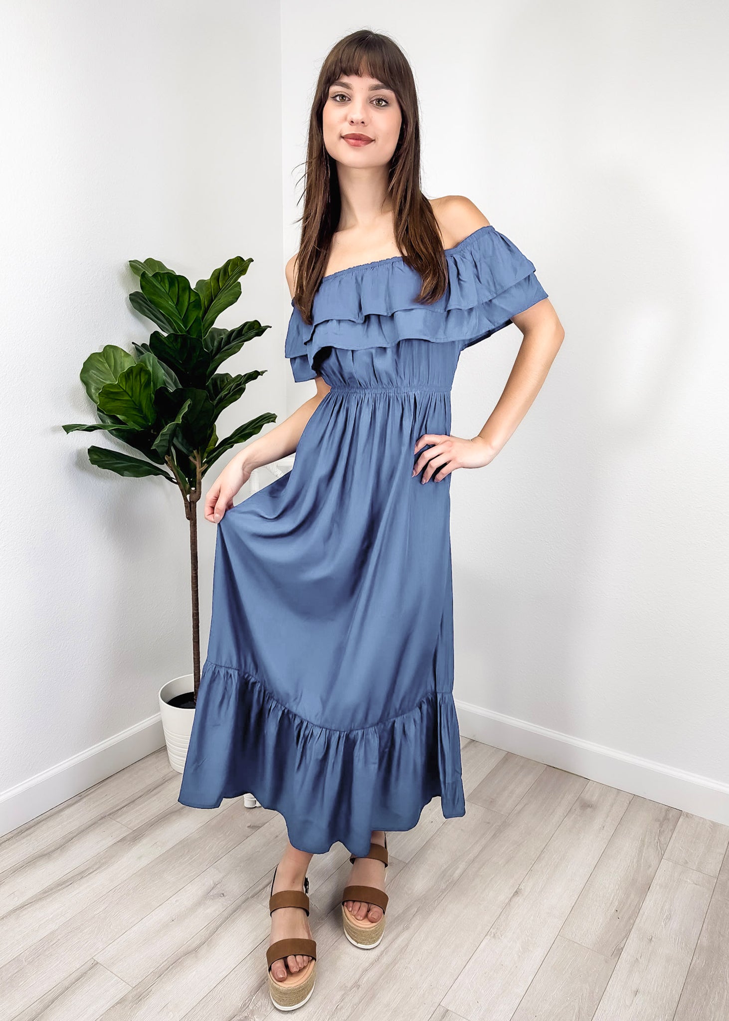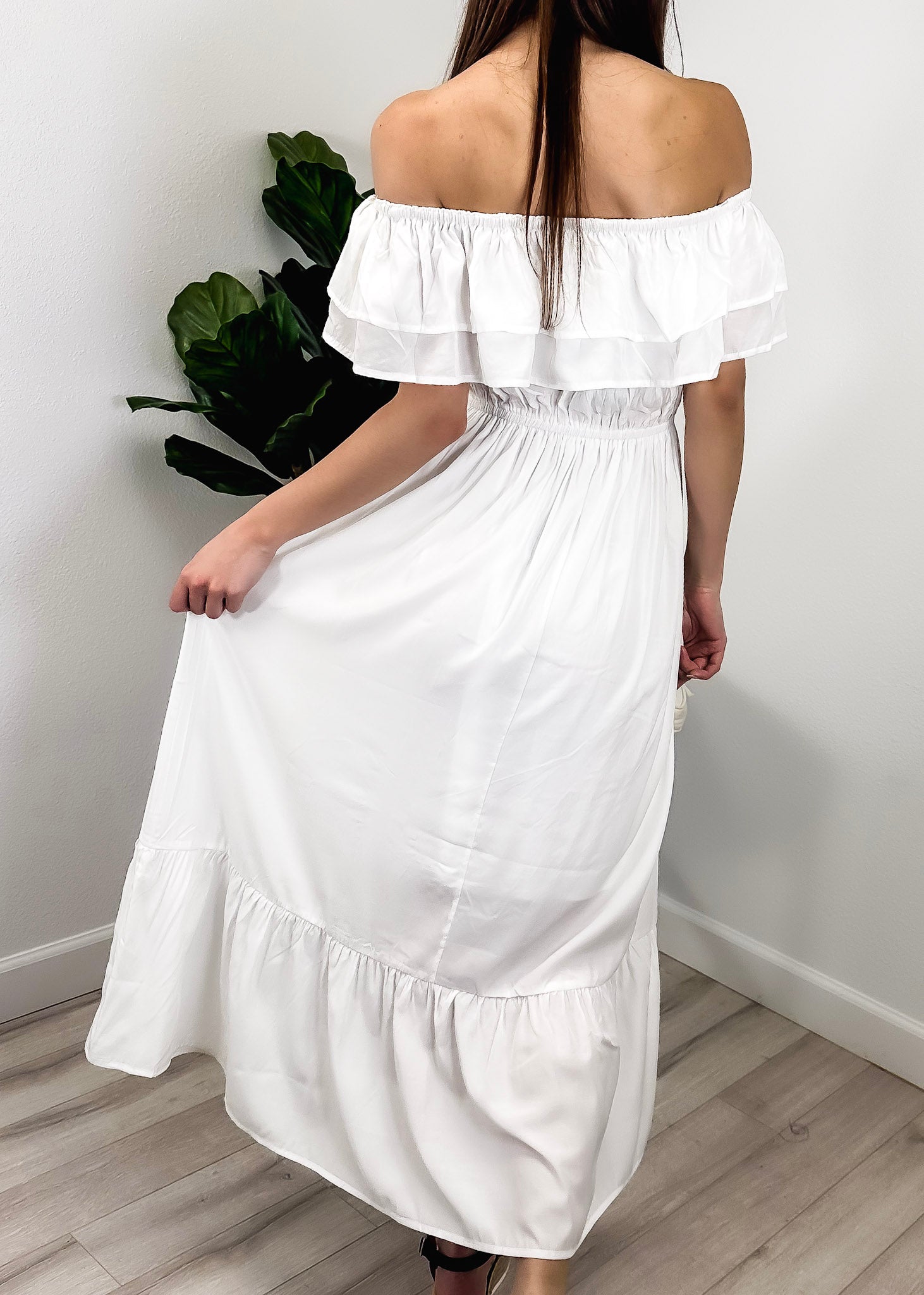 - A gorgeous long maxi dress with square neckline, accented by a ruffle fringe and a gathered stretchy waist. A versatile piece for any wardrobe.