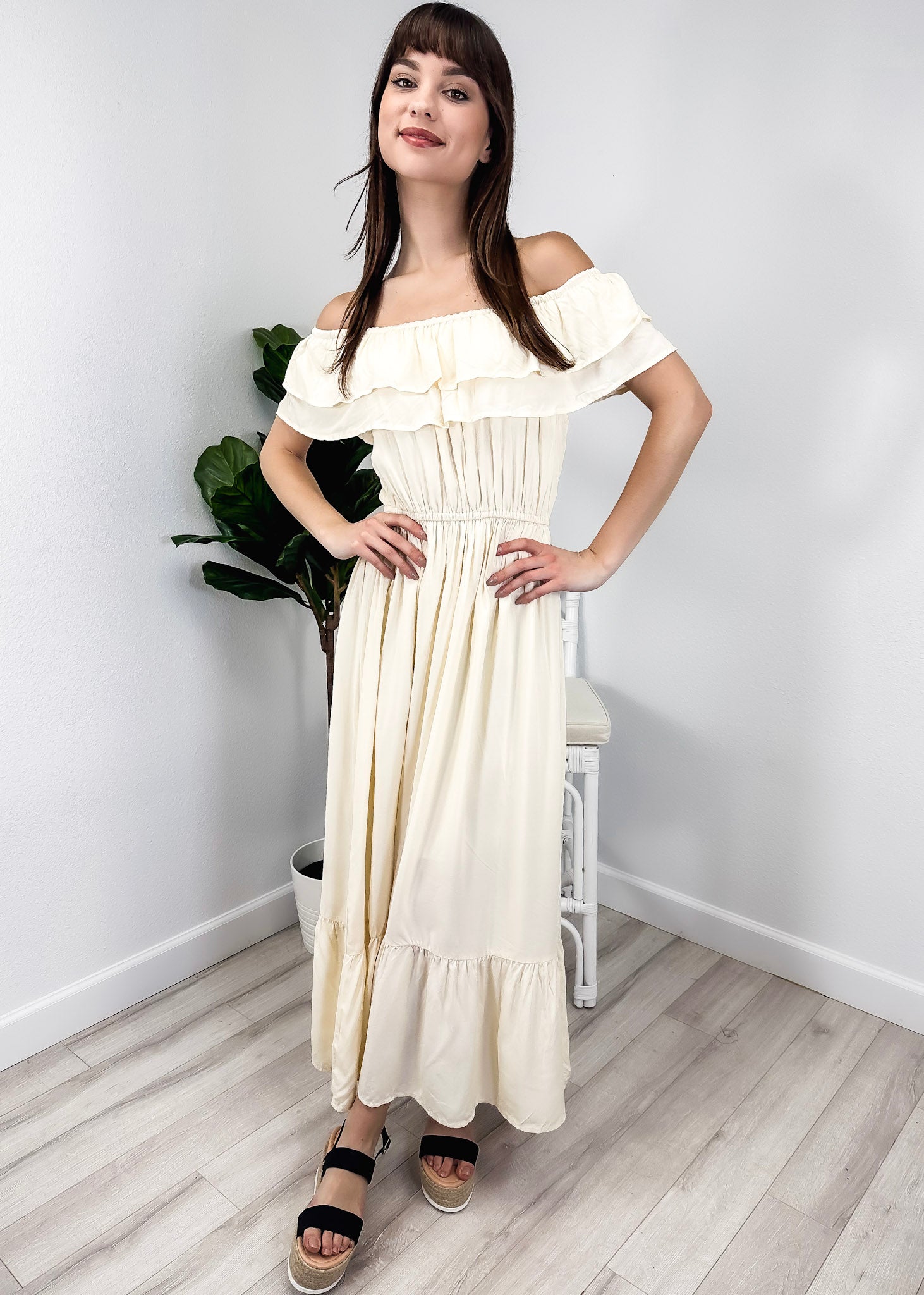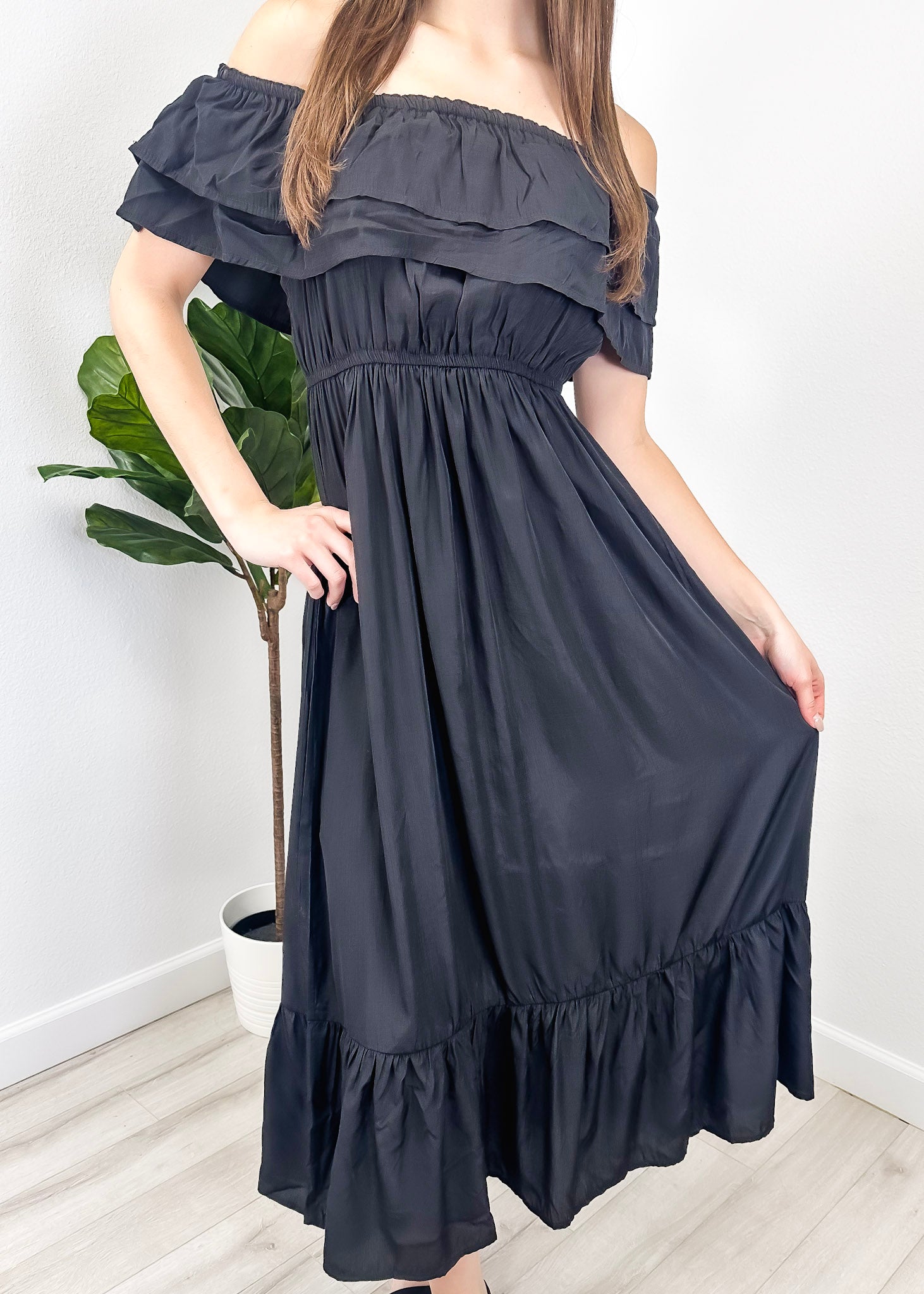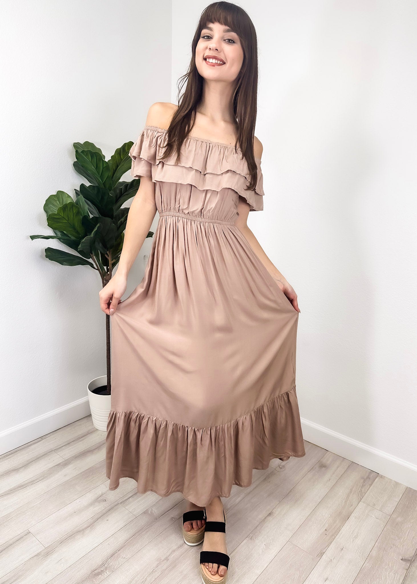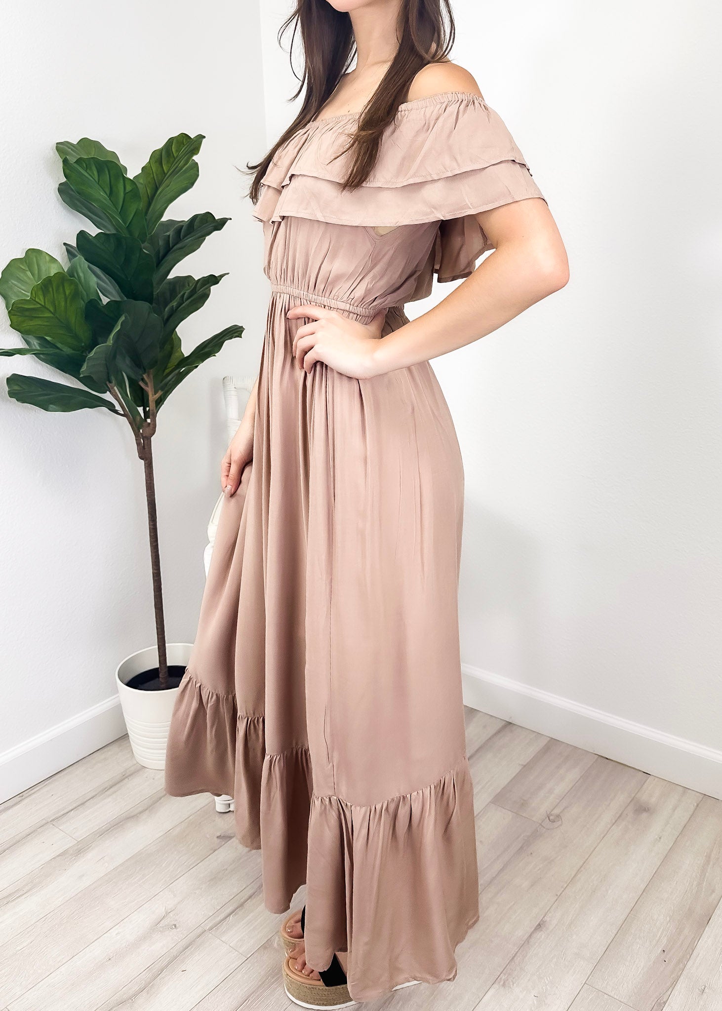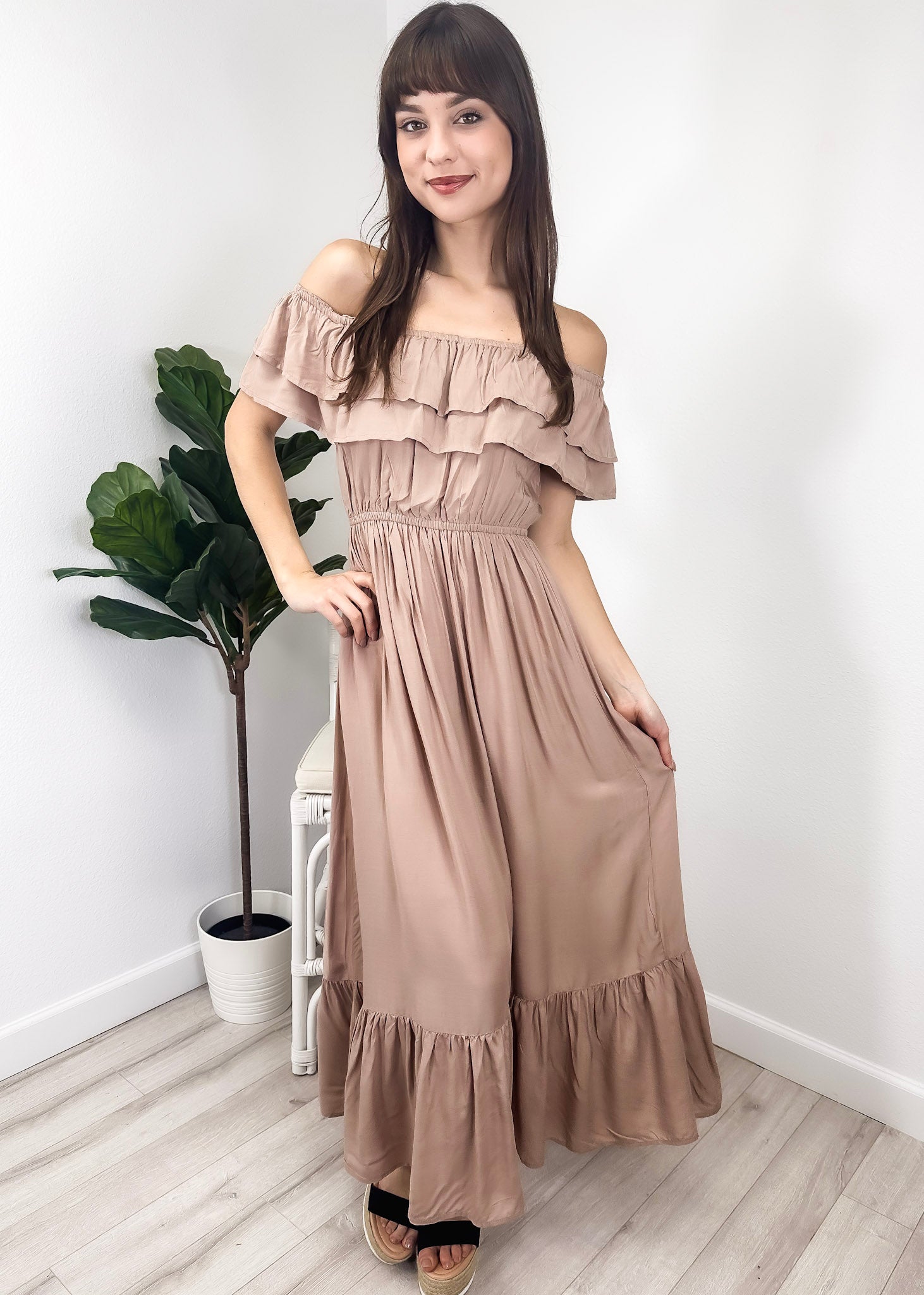 - A gorgeous long maxi dress with square neckline, accented by a ruffle fringe and a gathered stretchy waist. A versatile piece for any wardrobe.