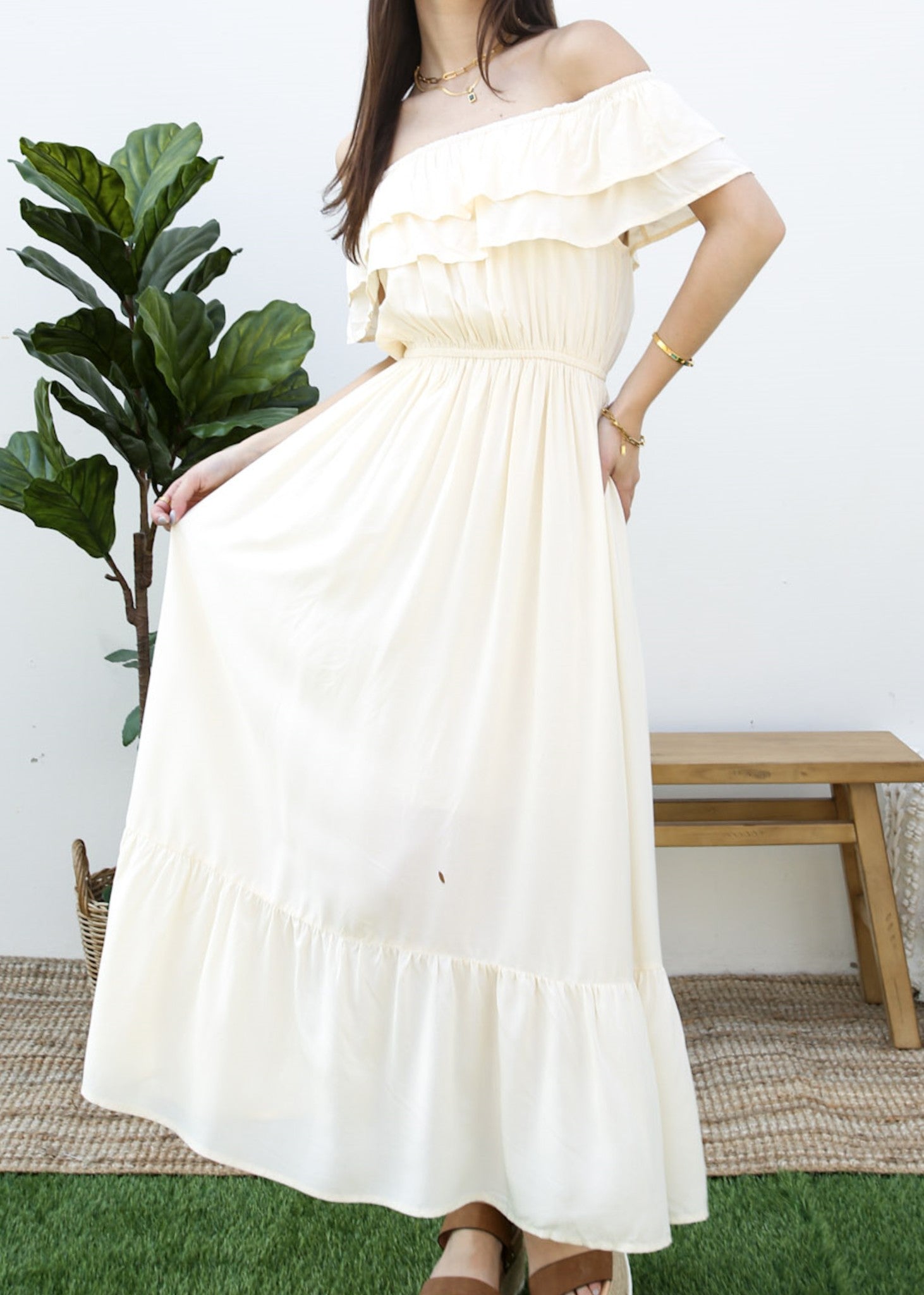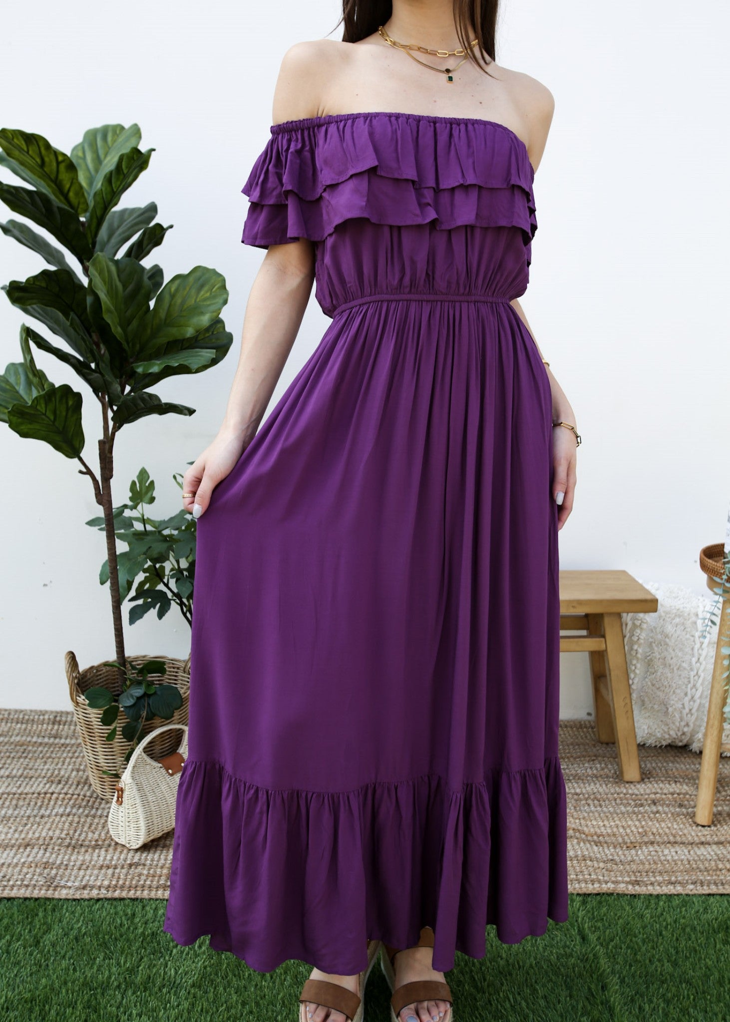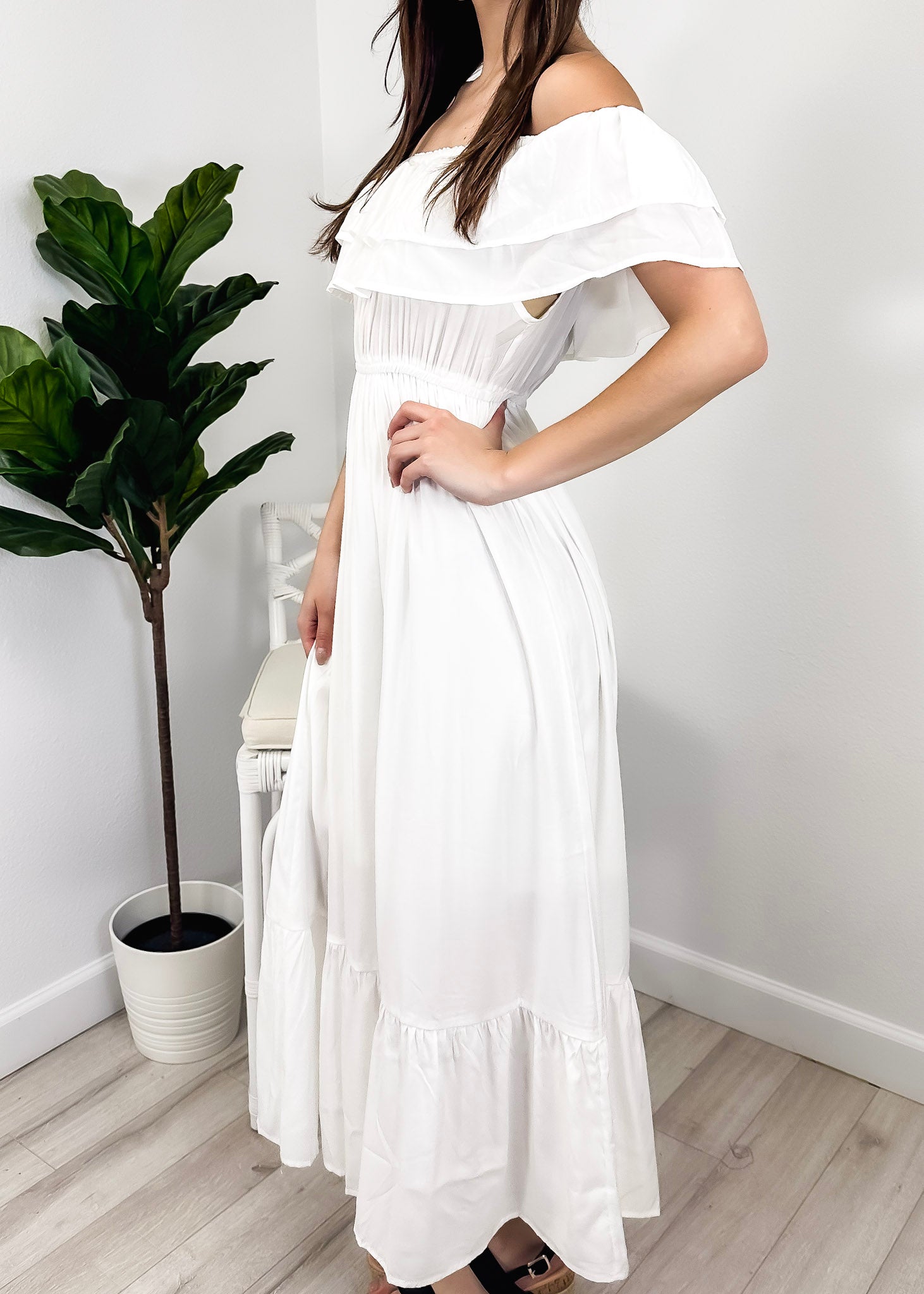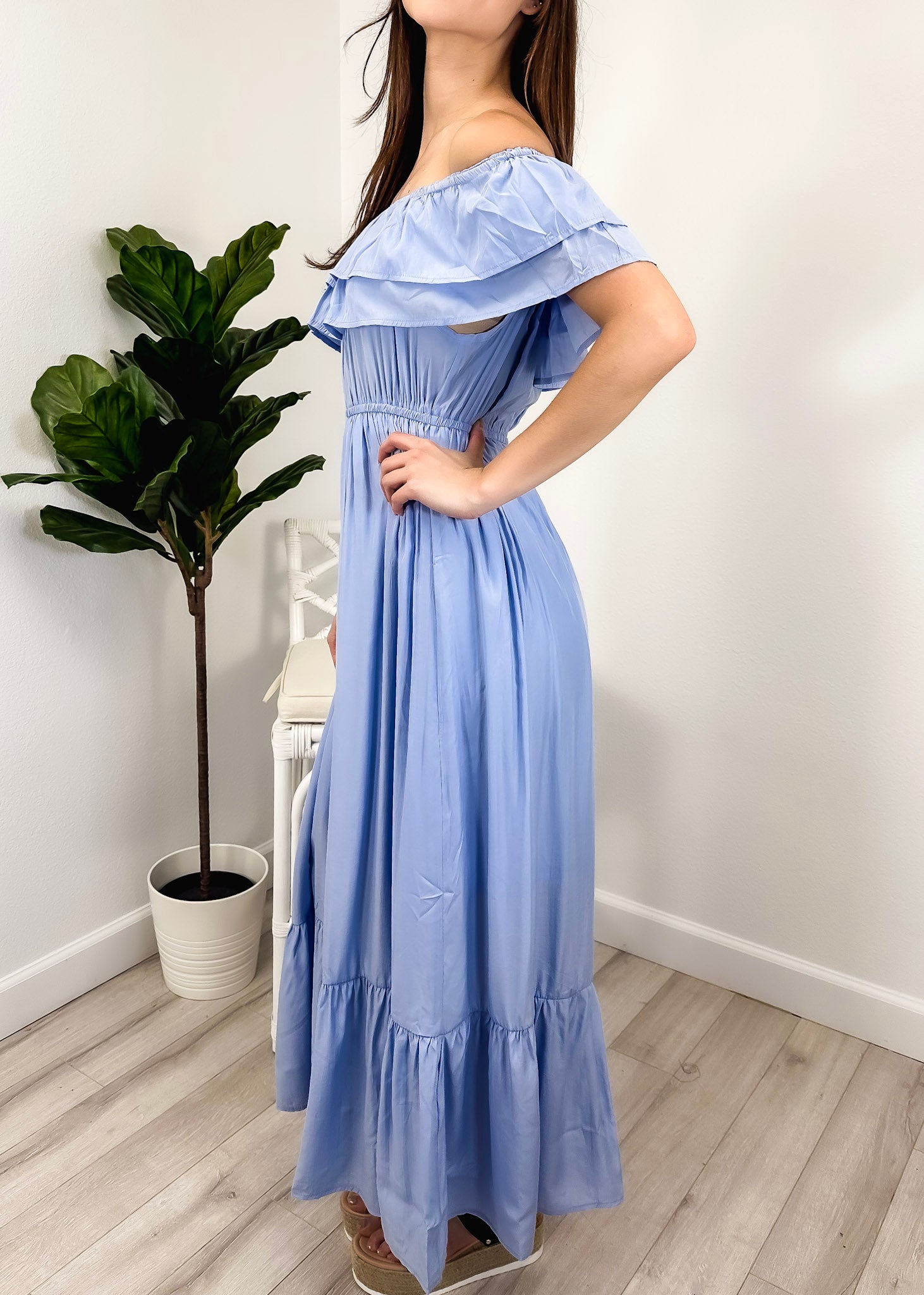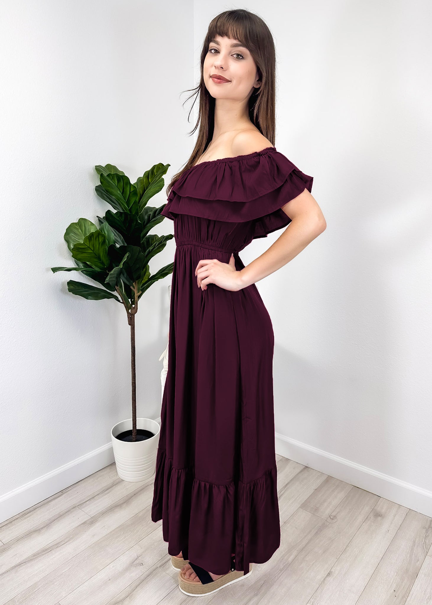 - A gorgeous long maxi dress with square neckline, accented by a ruffle fringe and a gathered stretchy waist. A versatile piece for any wardrobe.