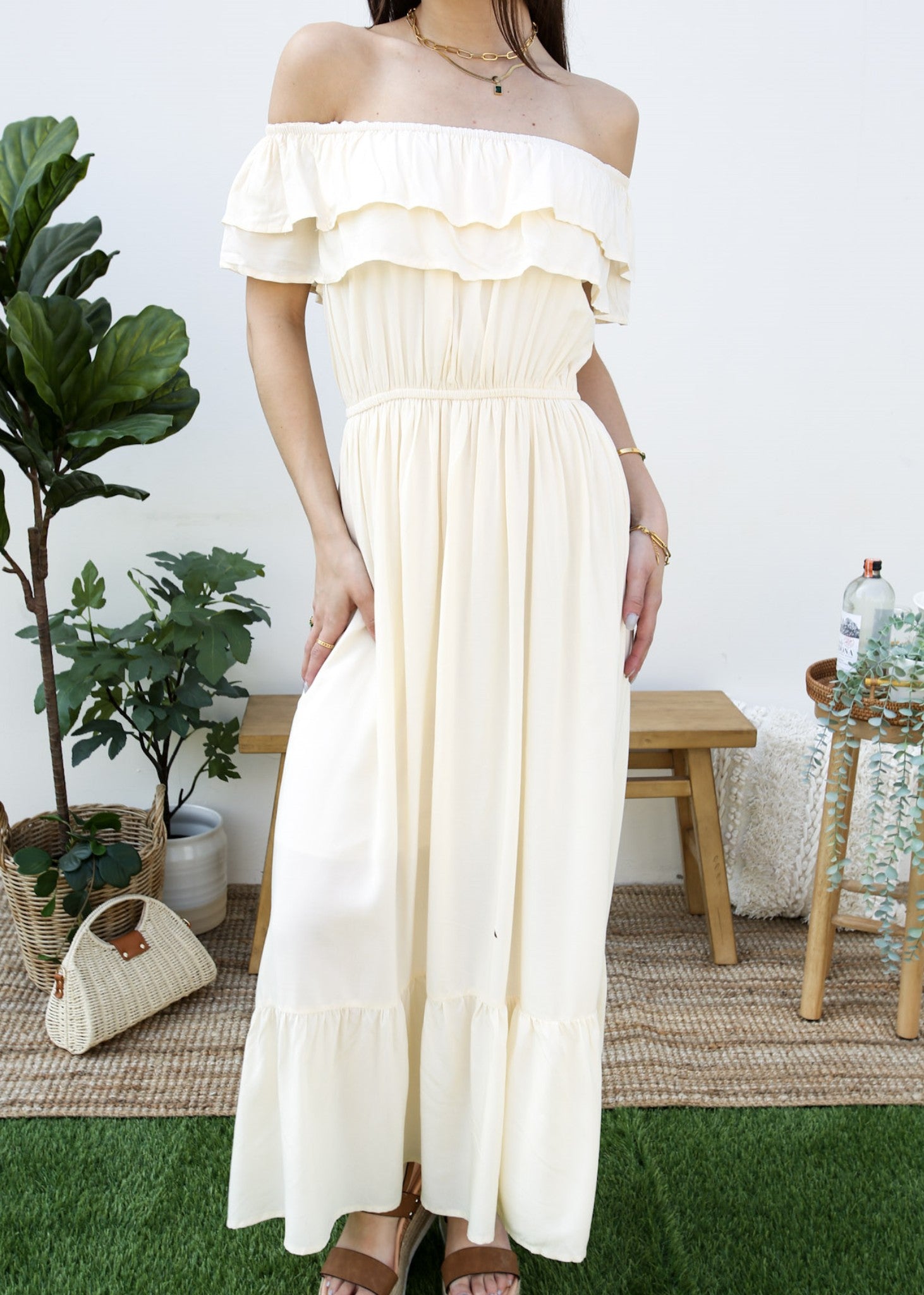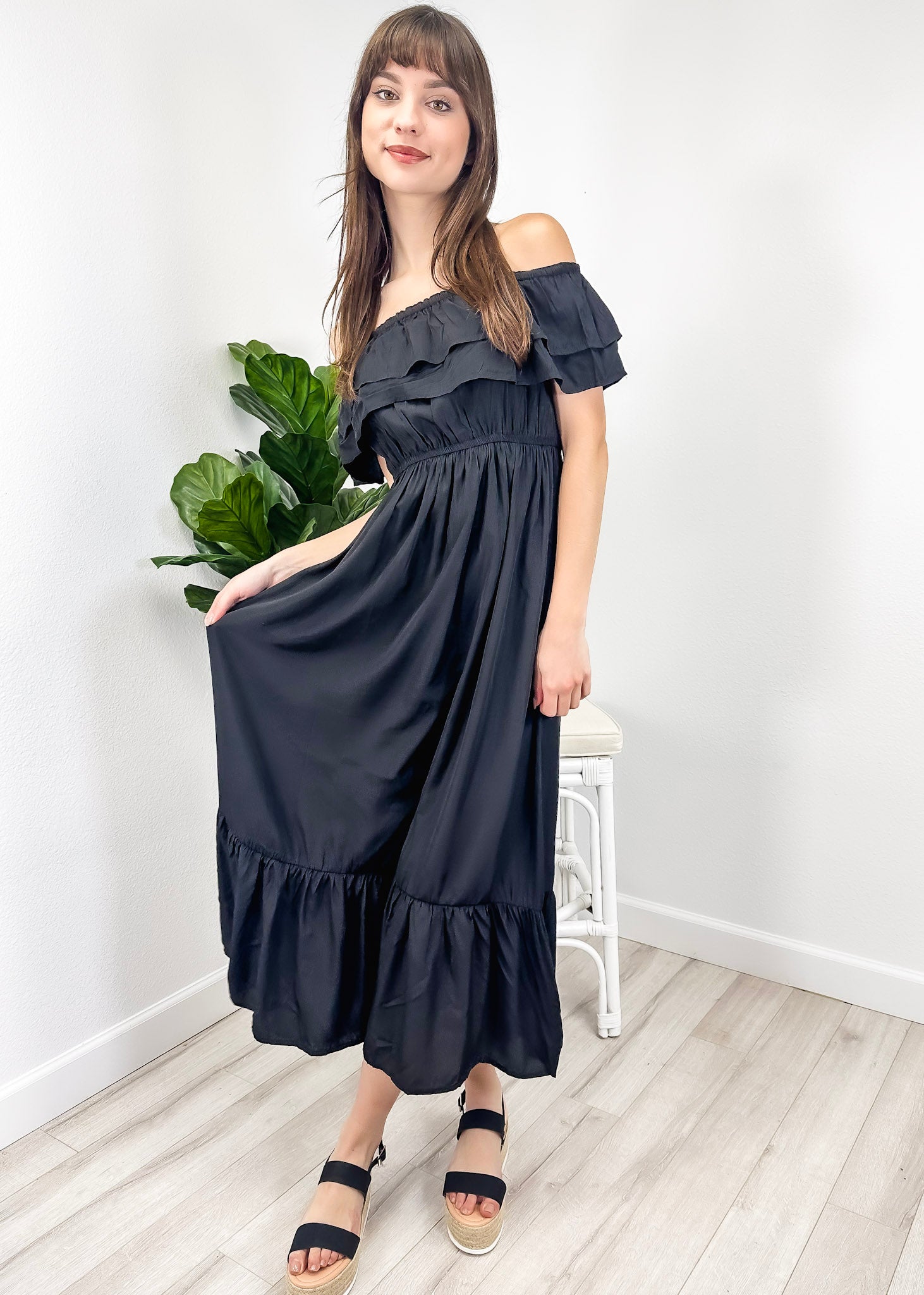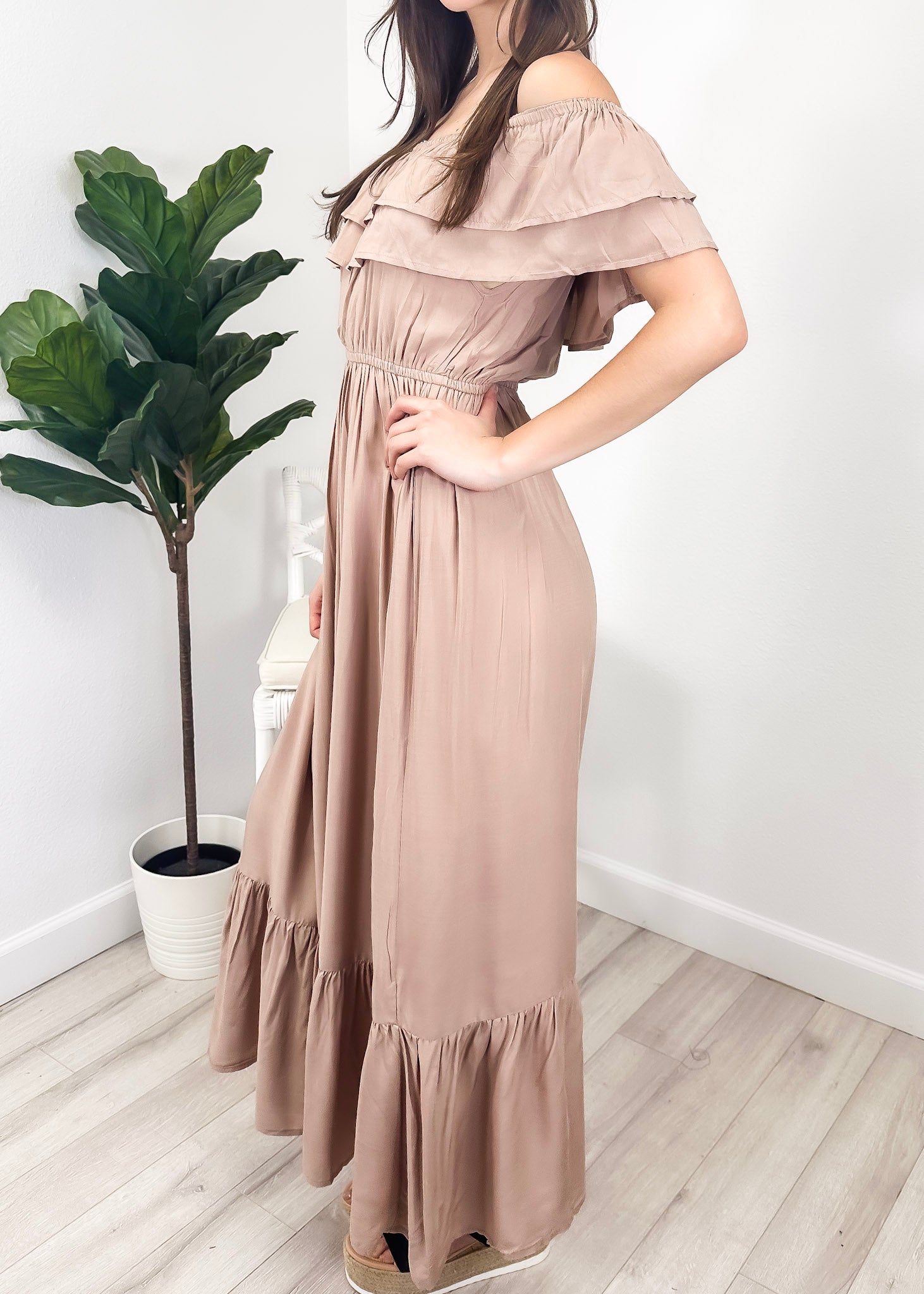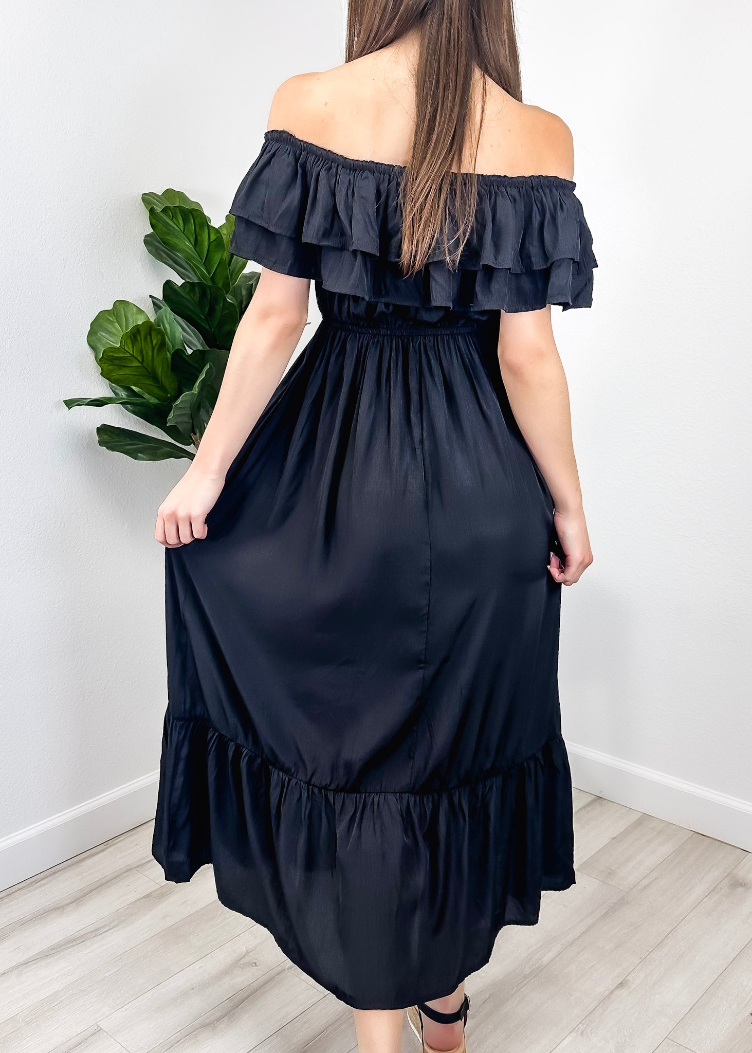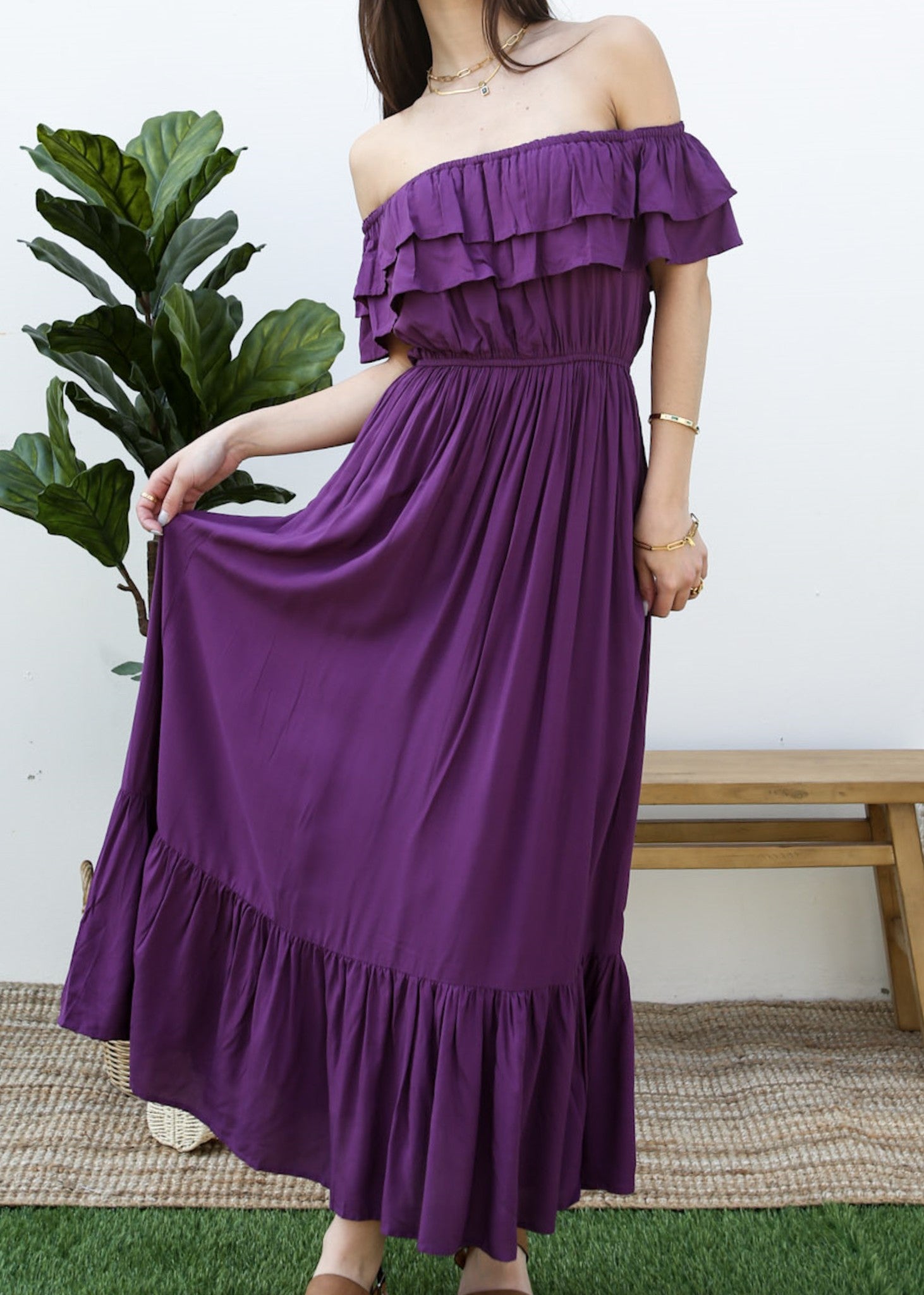 - A gorgeous long maxi dress with square neckline, accented by a ruffle fringe and a gathered stretchy waist. A versatile piece for any wardrobe.