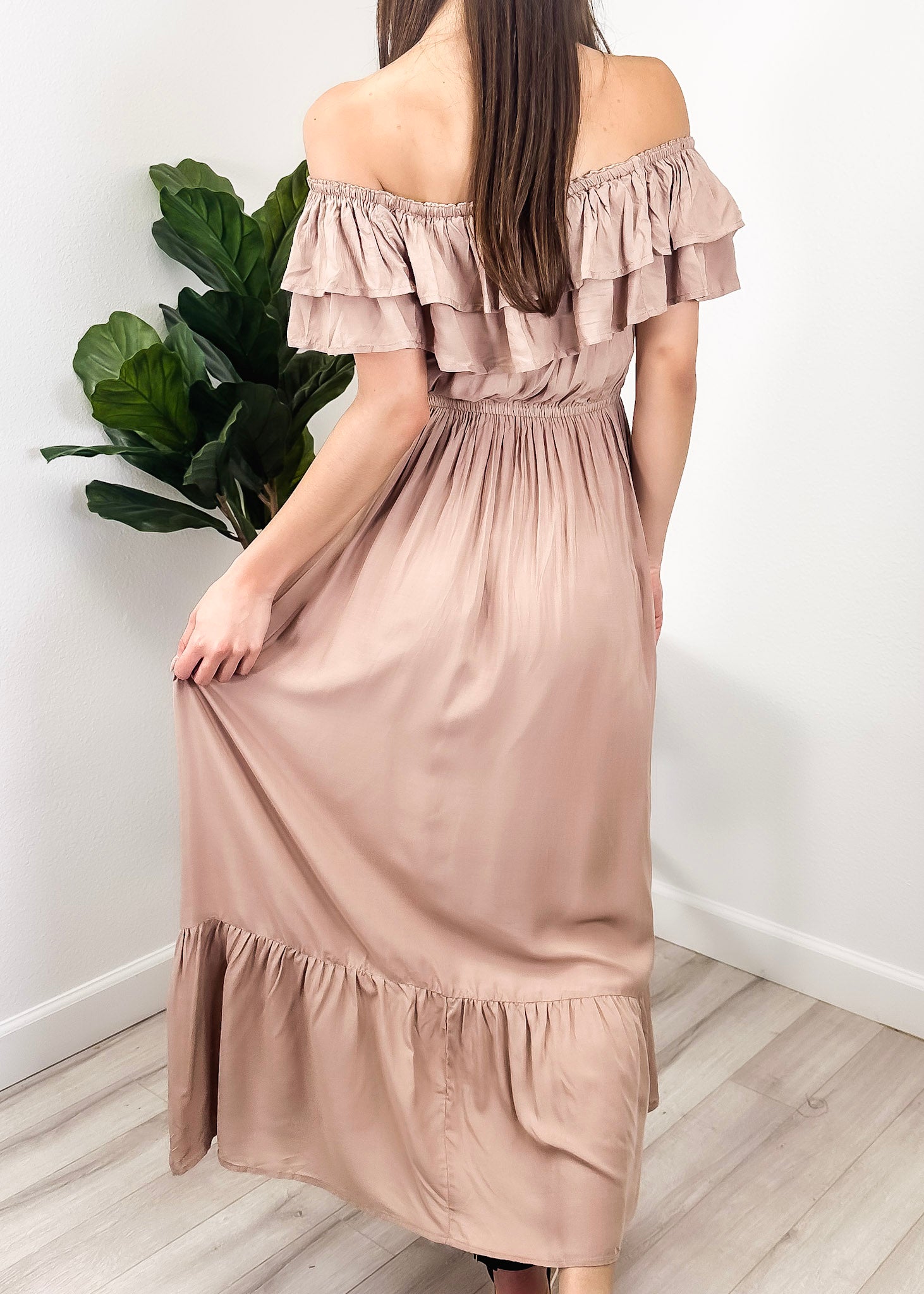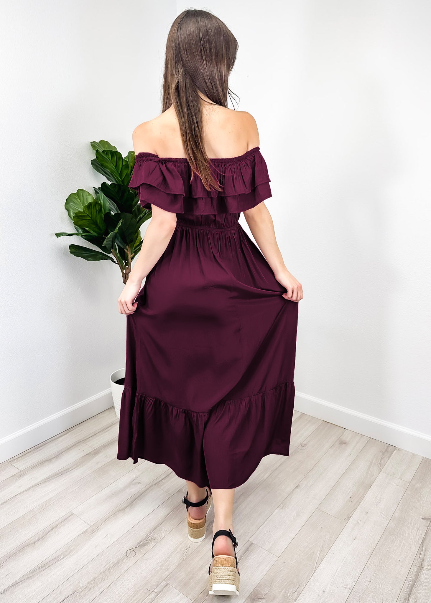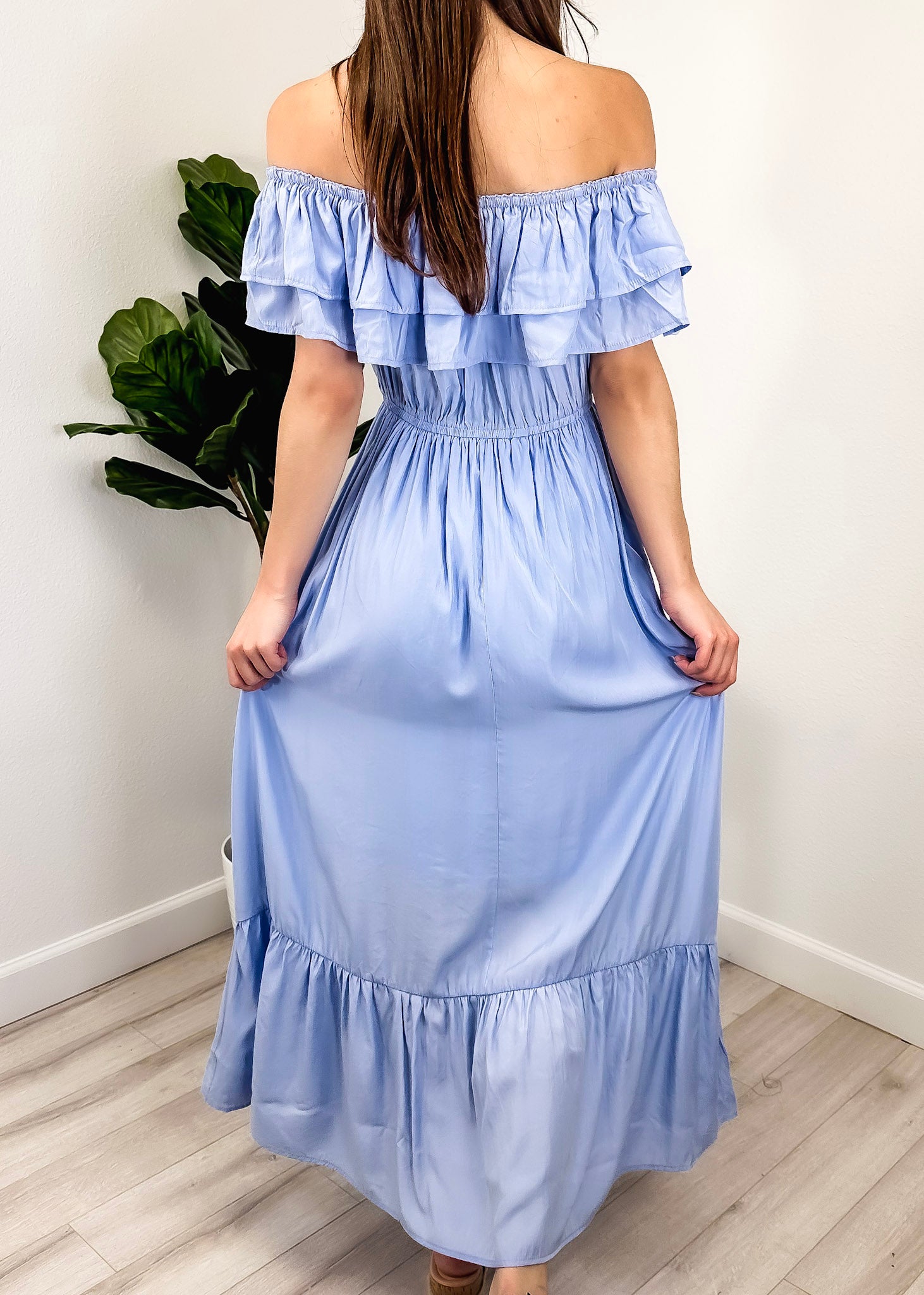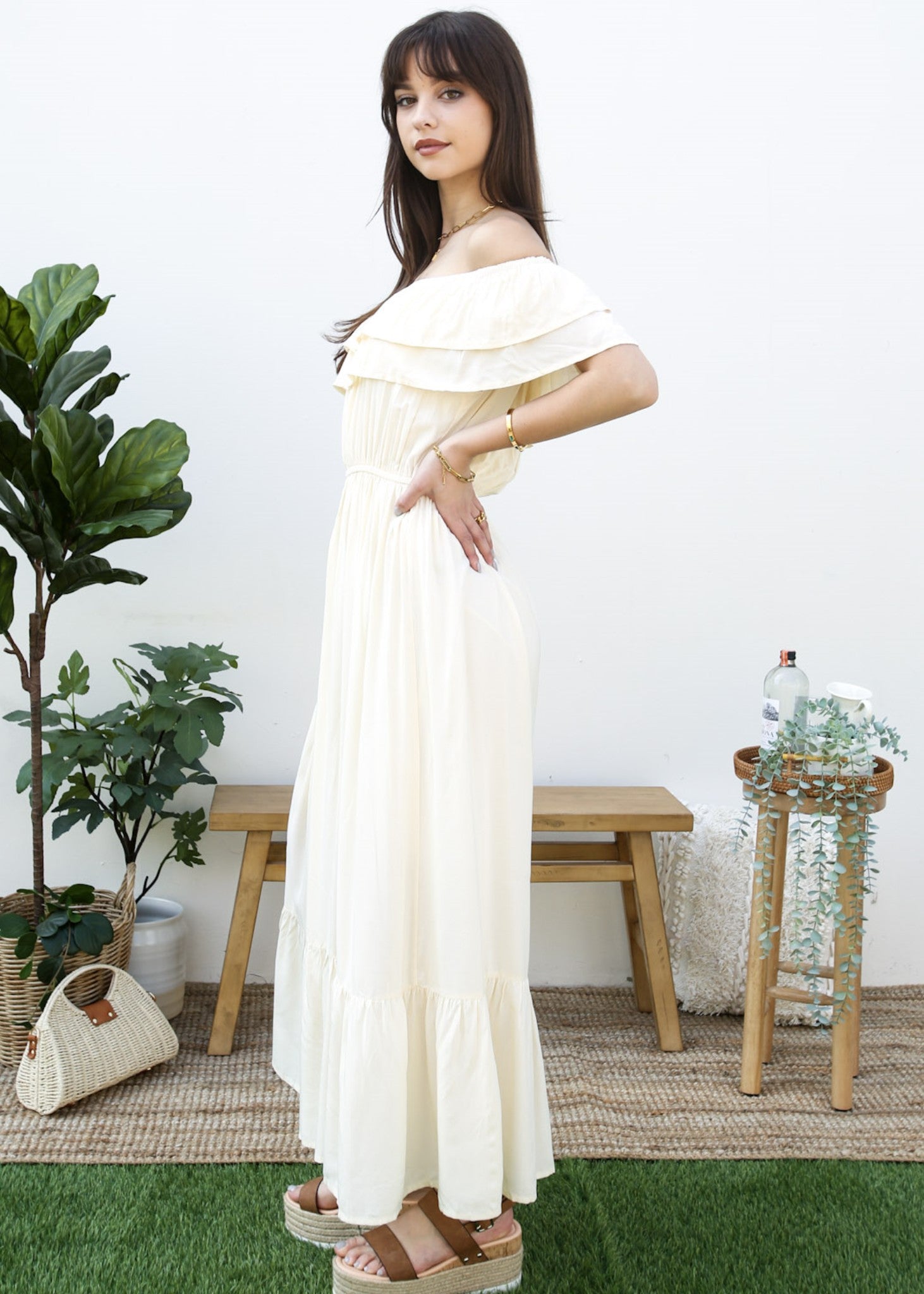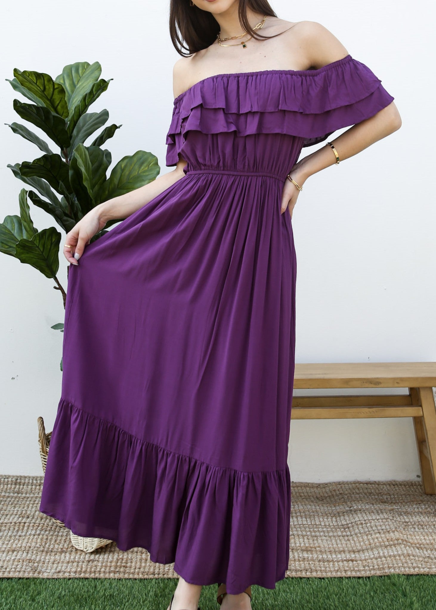 - A gorgeous long maxi dress with square neckline, accented by a ruffle fringe and a gathered stretchy waist. A versatile piece for any wardrobe.