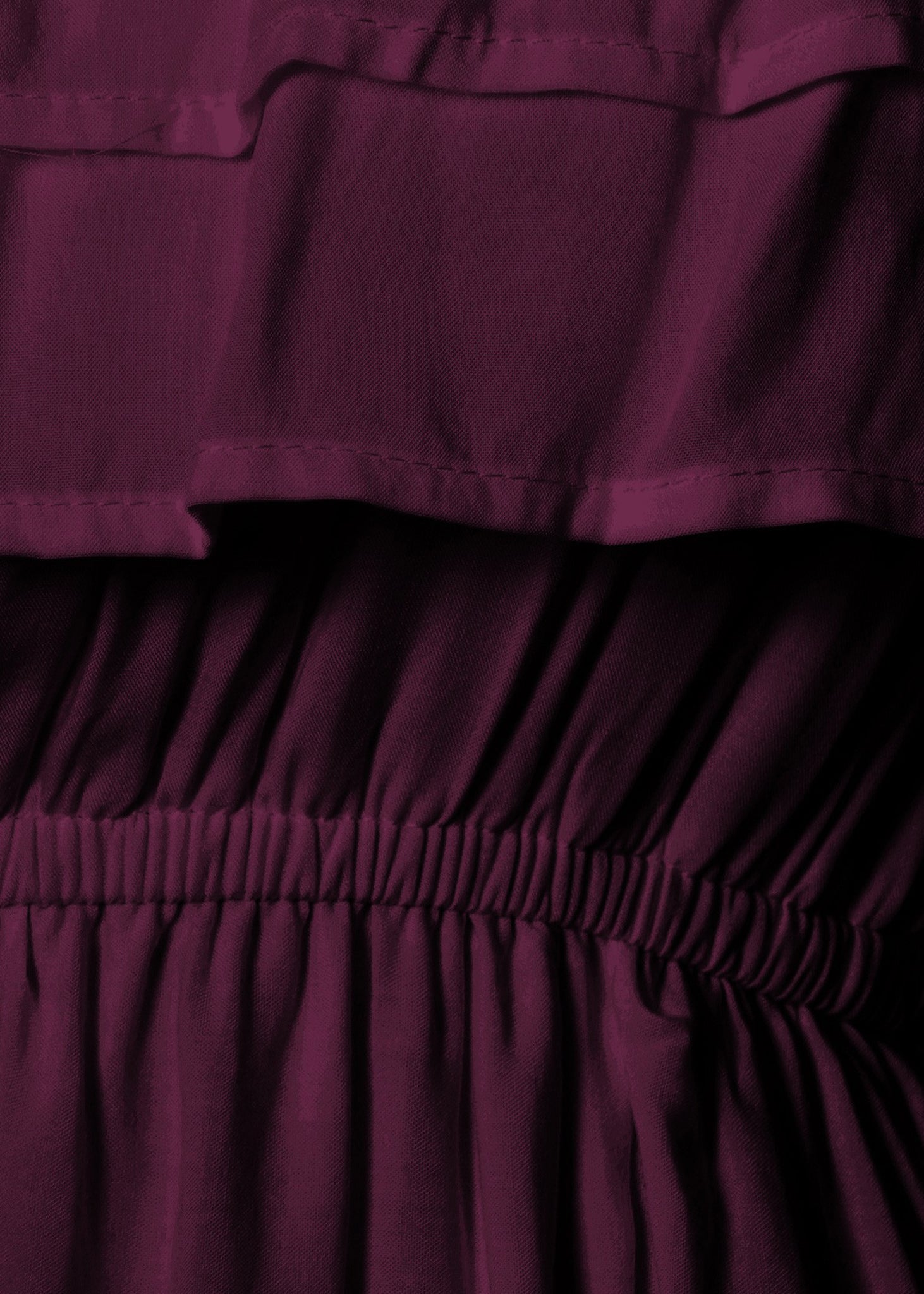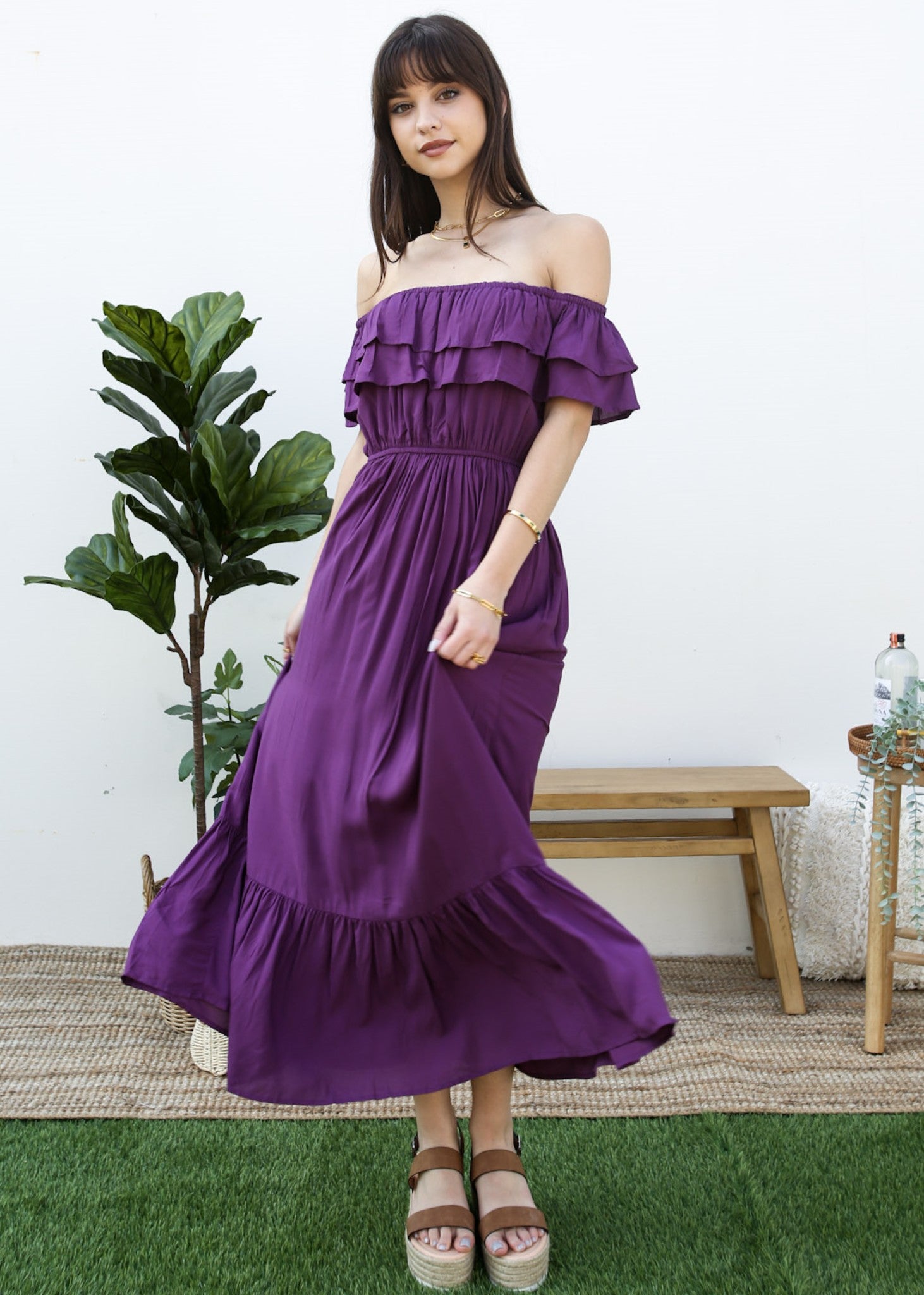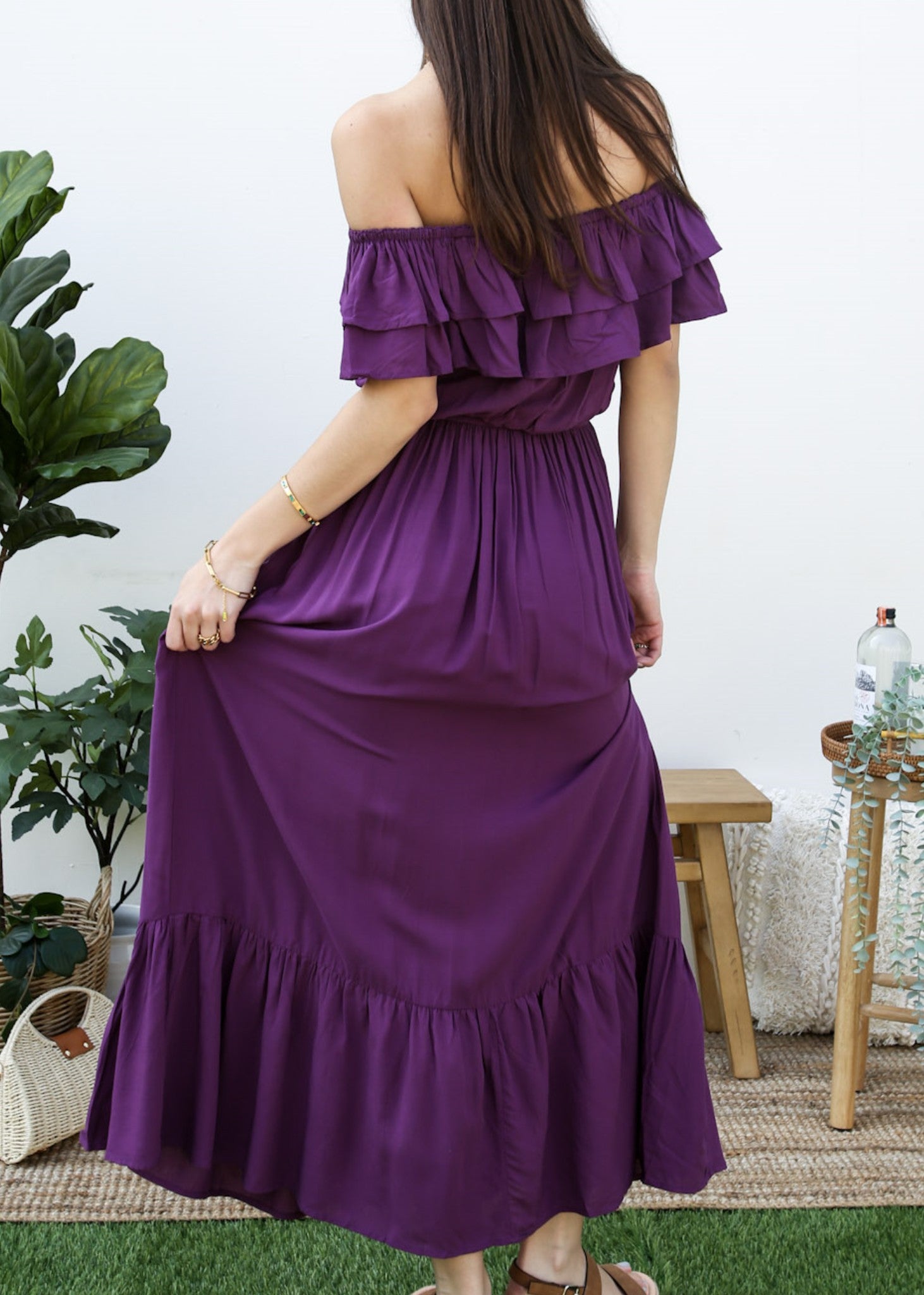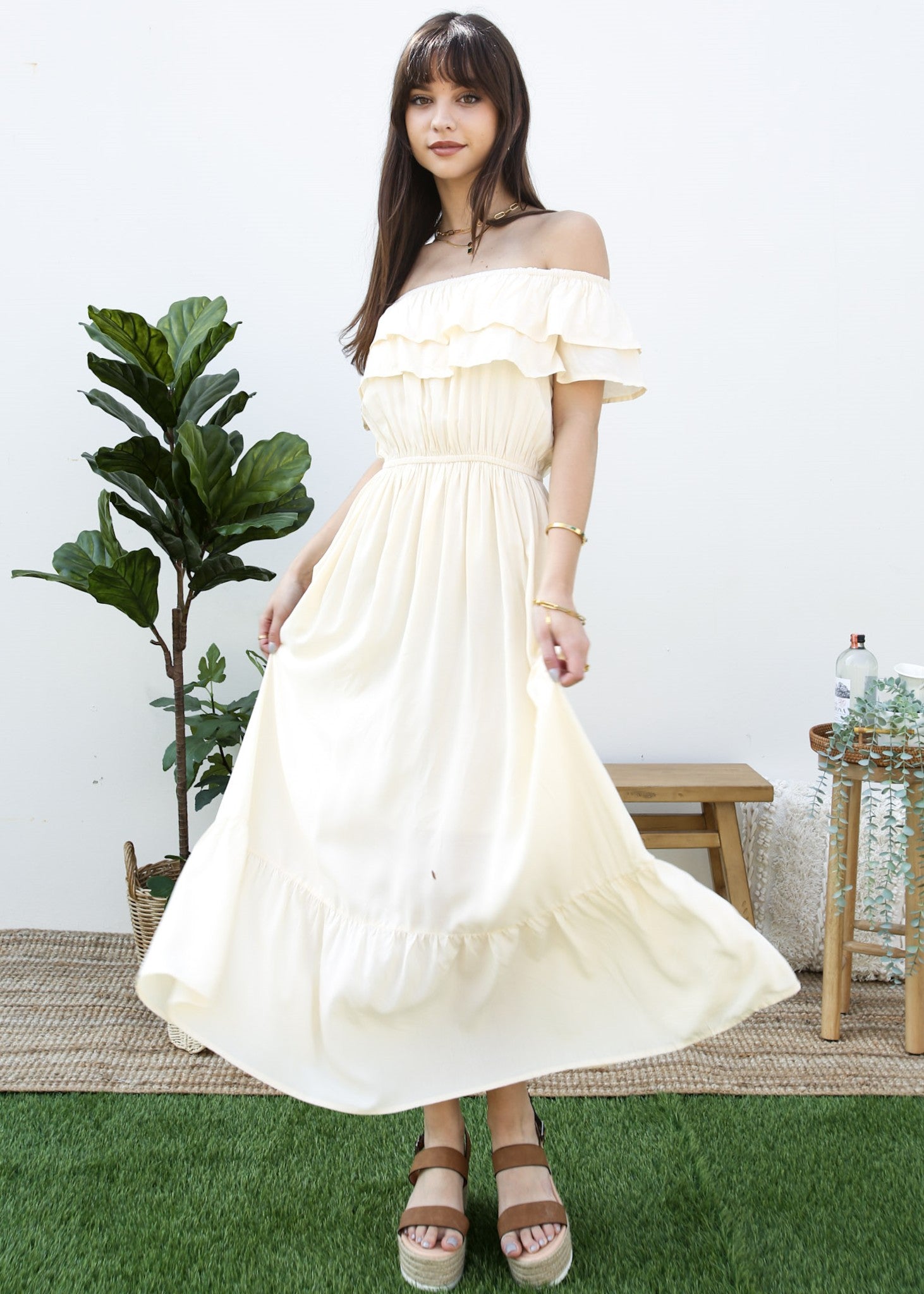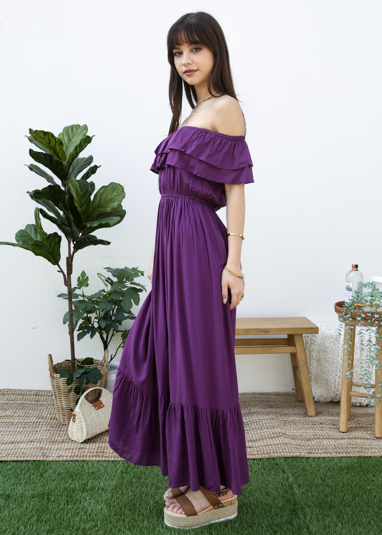 - A gorgeous long maxi dress with square neckline, accented by a ruffle fringe and a gathered stretchy waist. A versatile piece for any wardrobe.