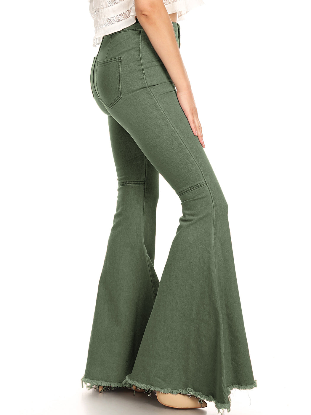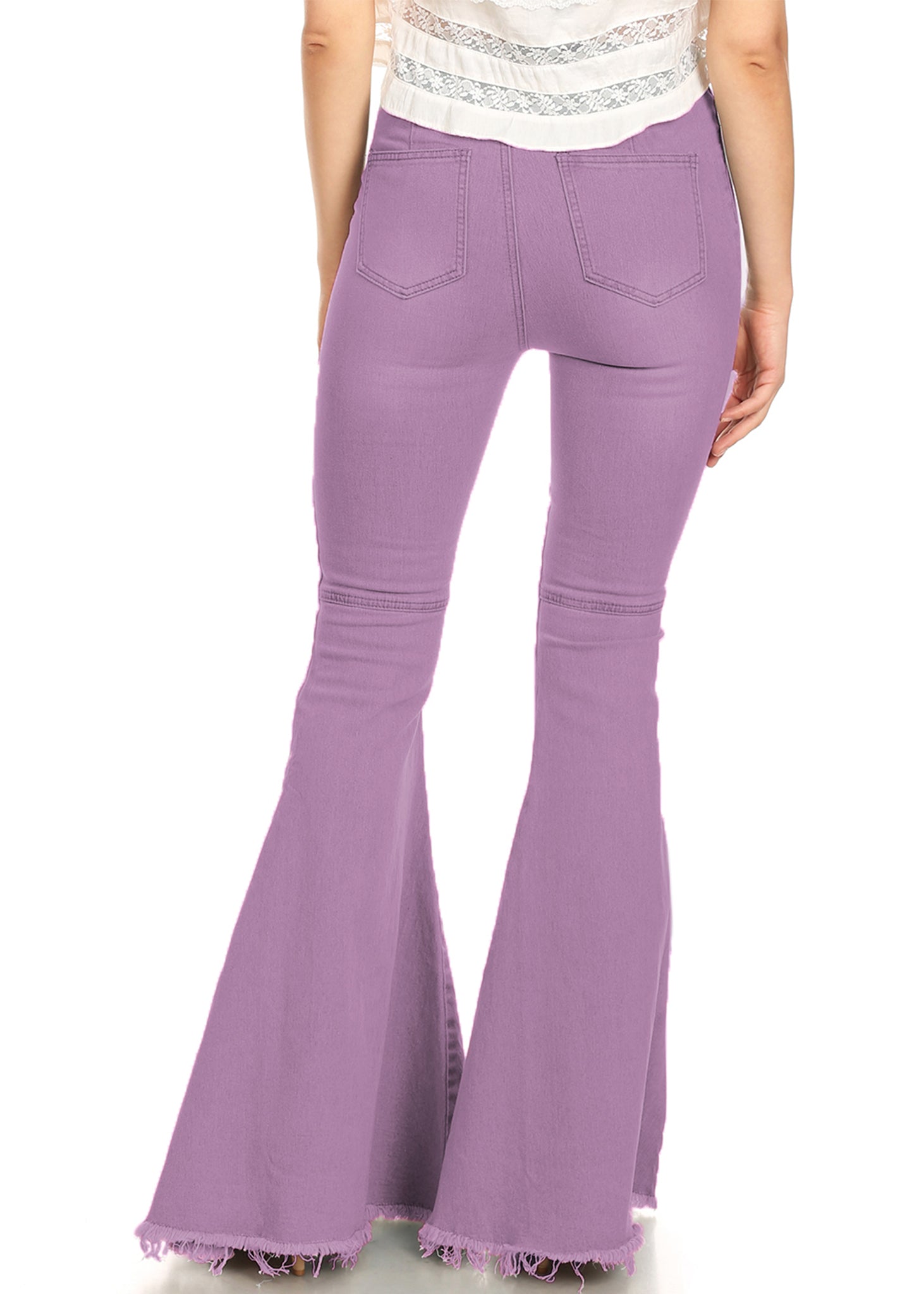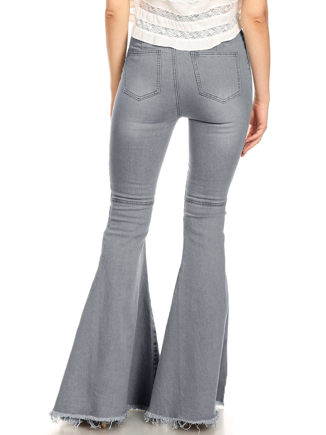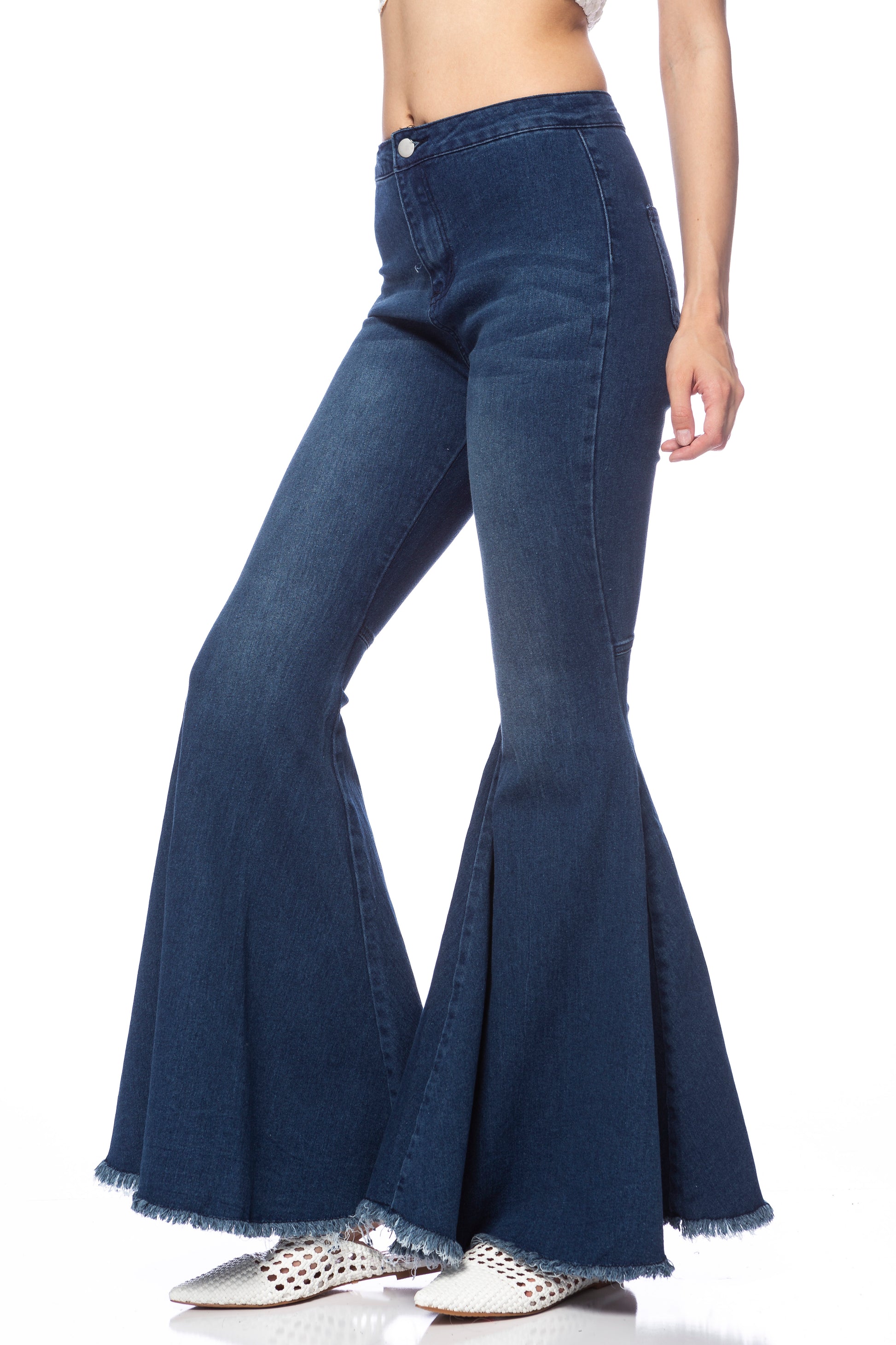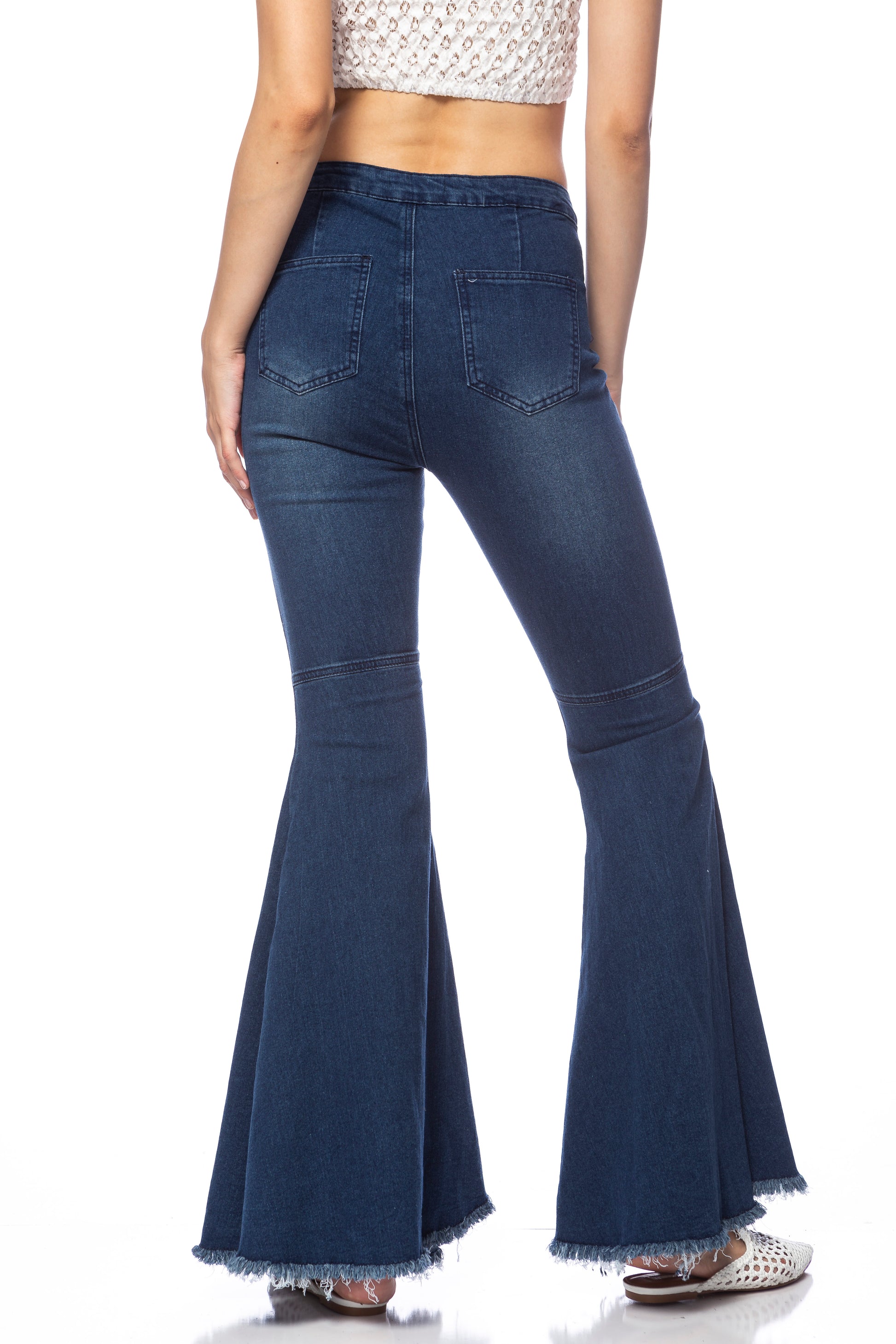 - RETRO, DETAILED BELL BOTTOMS. Amazing full length jeans that hug every curve perfectly, and show off your legs by making them appear longer. The bottom is a wide leg flare that is a relaxed fit. Does contain two back pockets and fraying at the bottoms hem.