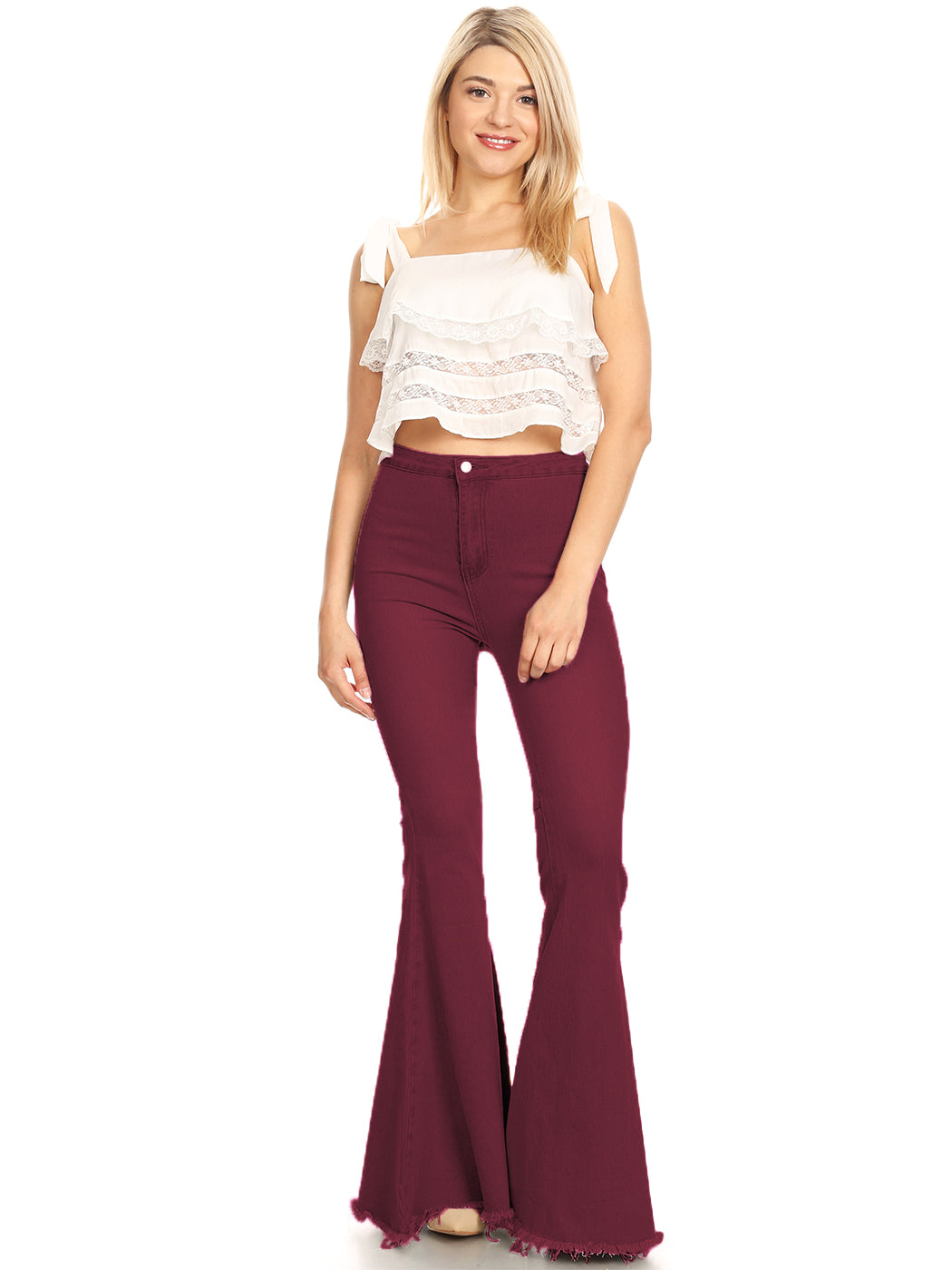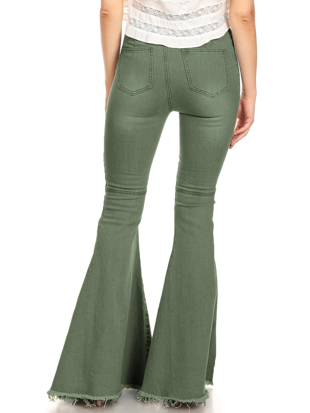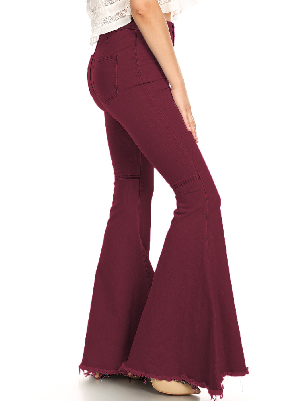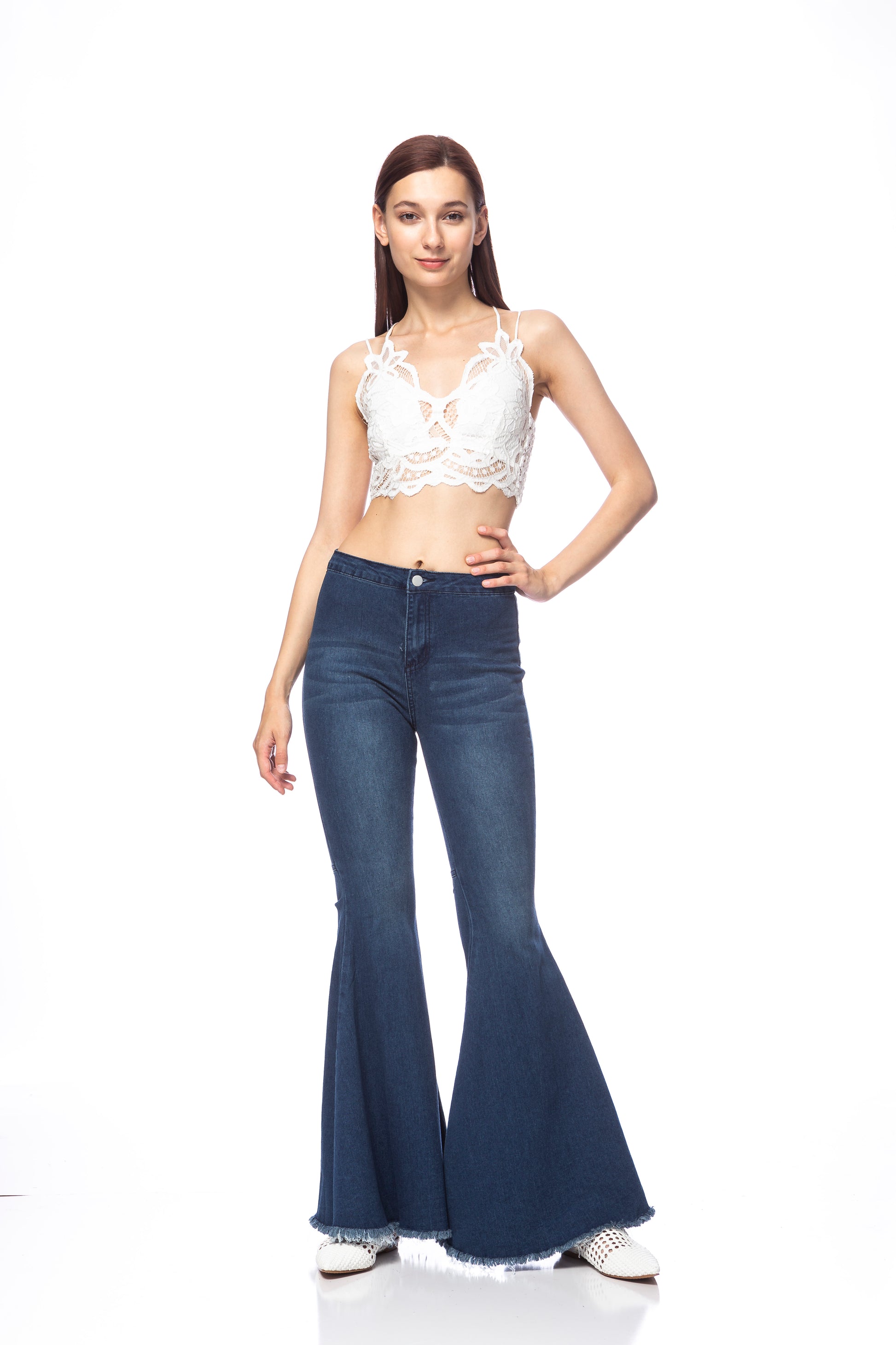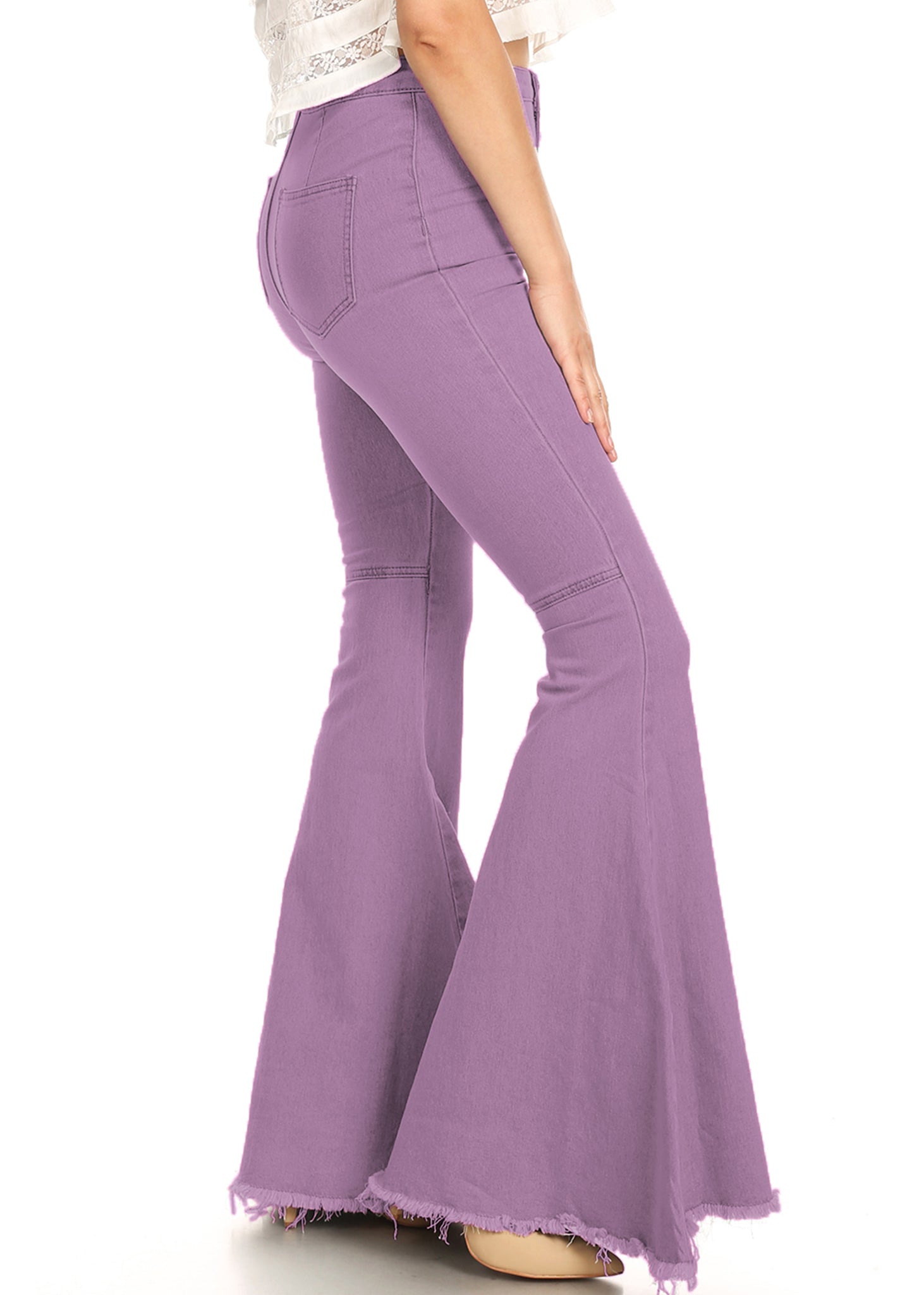 - RETRO, DETAILED BELL BOTTOMS. Amazing full length jeans that hug every curve perfectly, and show off your legs by making them appear longer. The bottom is a wide leg flare that is a relaxed fit. Does contain two back pockets and fraying at the bottoms hem.