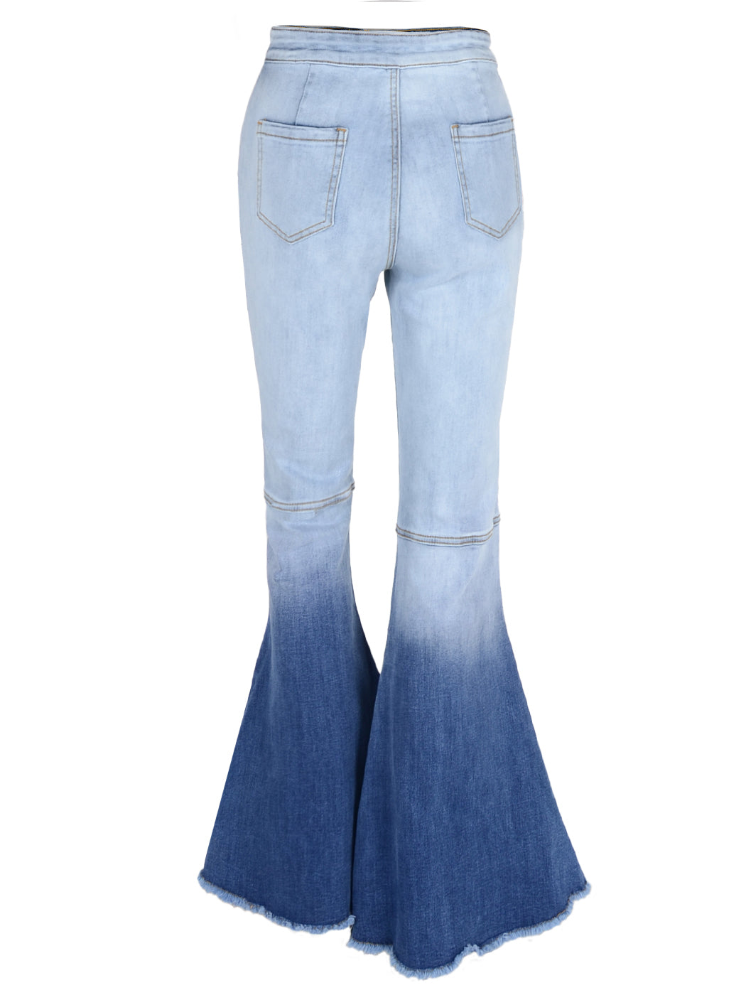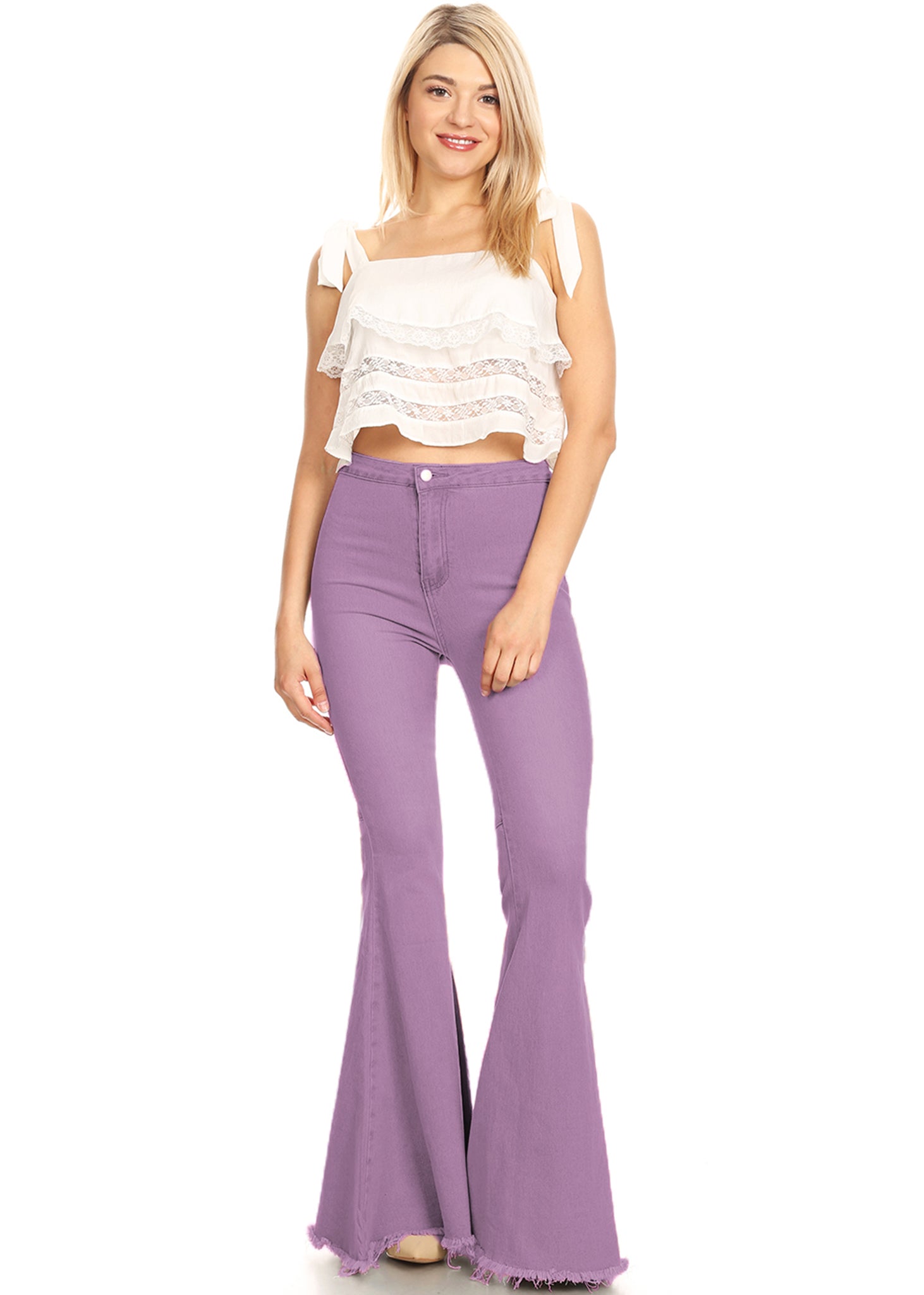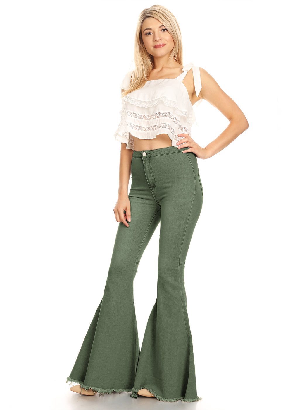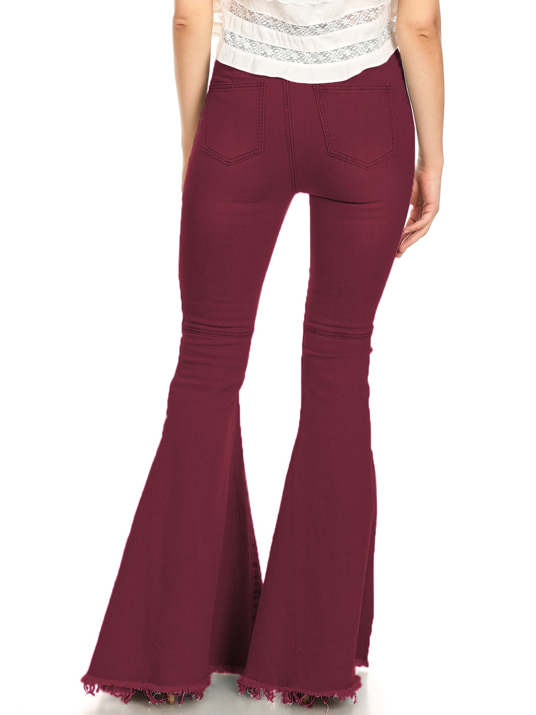 - RETRO, DETAILED BELL BOTTOMS. Amazing full length jeans that hug every curve perfectly, and show off your legs by making them appear longer. The bottom is a wide leg flare that is a relaxed fit. Does contain two back pockets and fraying at the bottoms hem.
