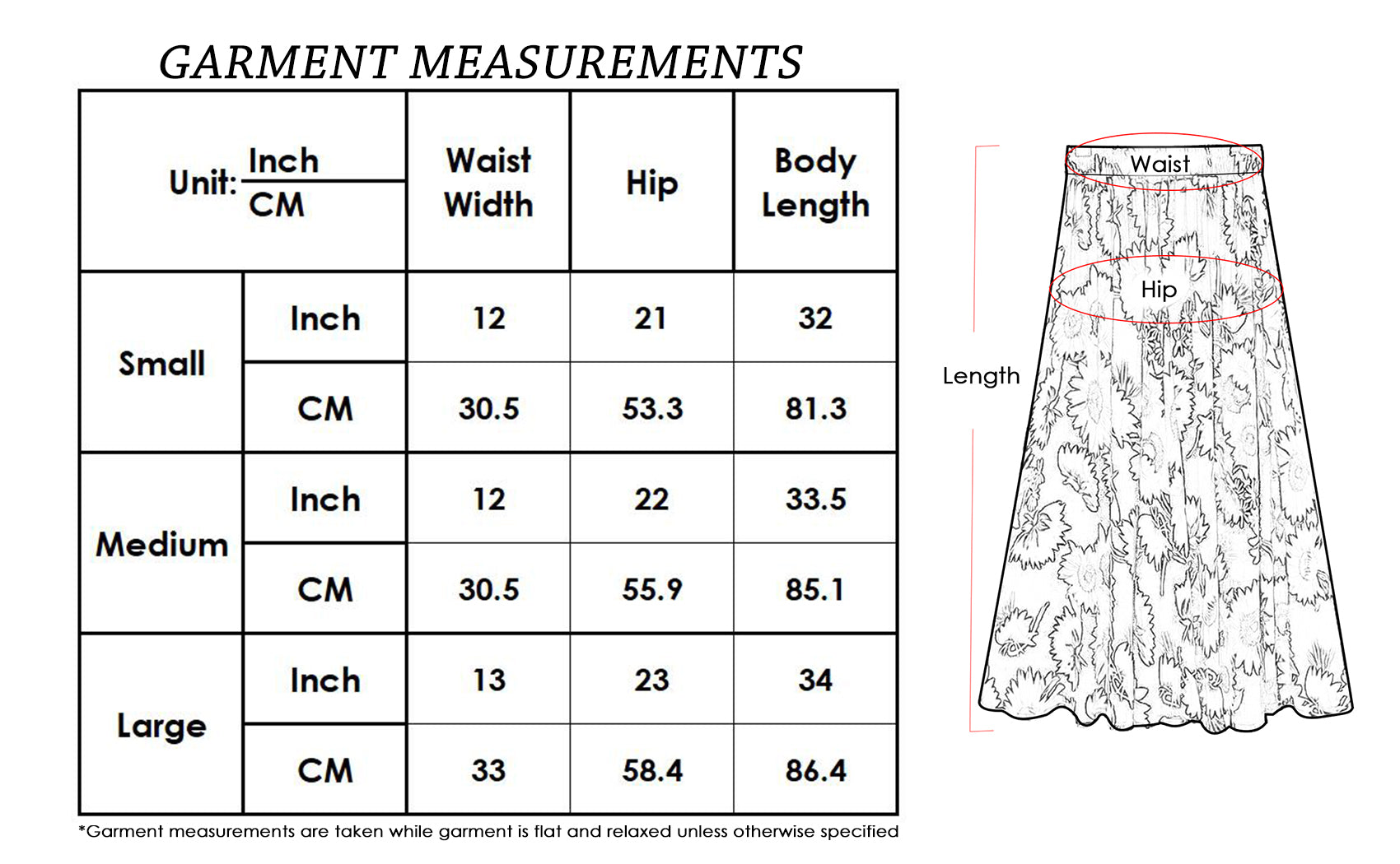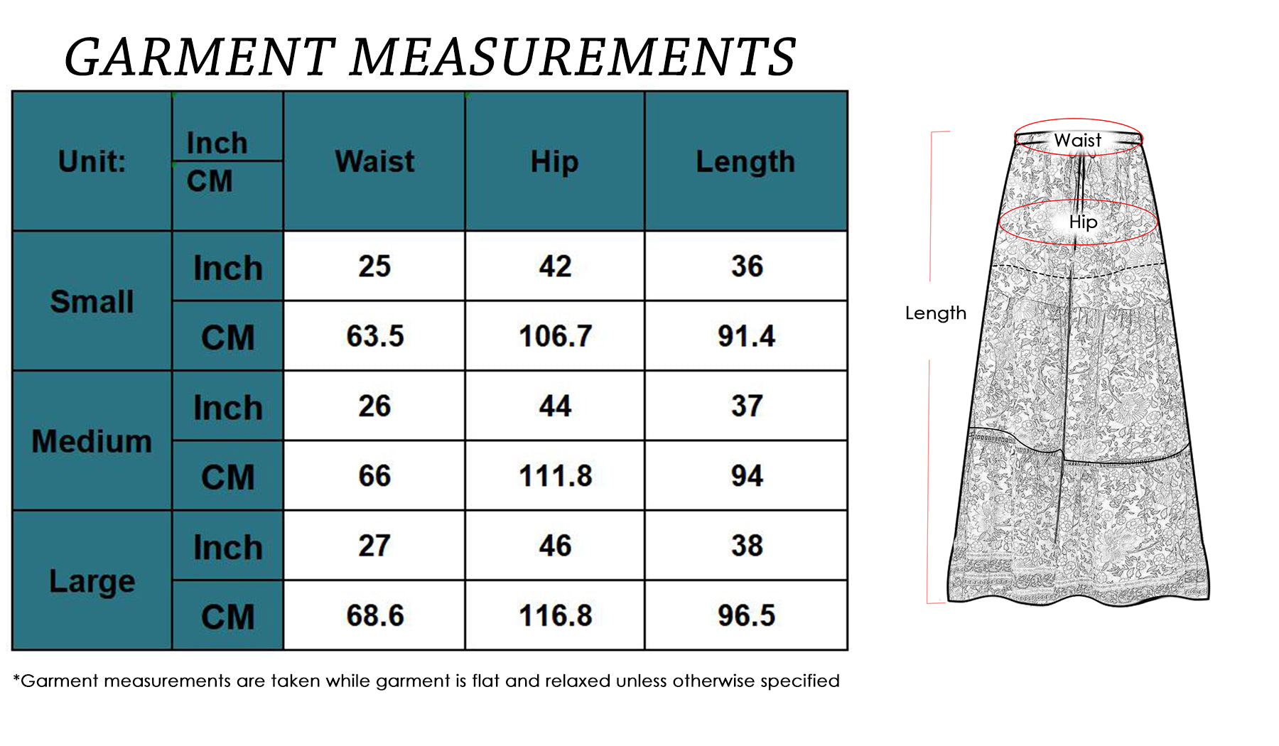 - COMFORTABLE BOHEMIAN SKIRT- Made of 100% rayon this skirt is comfortable and cool to wear all day long. There is an elastic waist band for comfort and adjusting.
