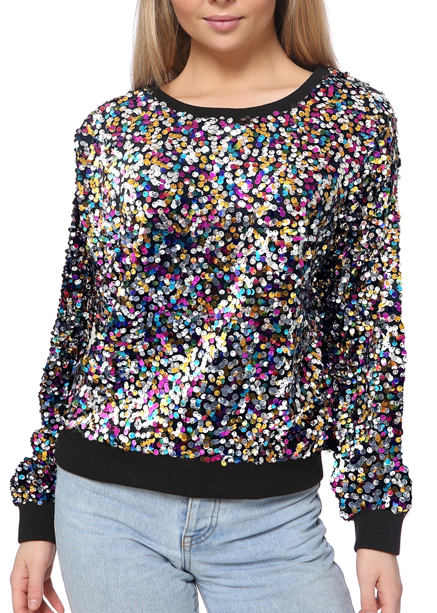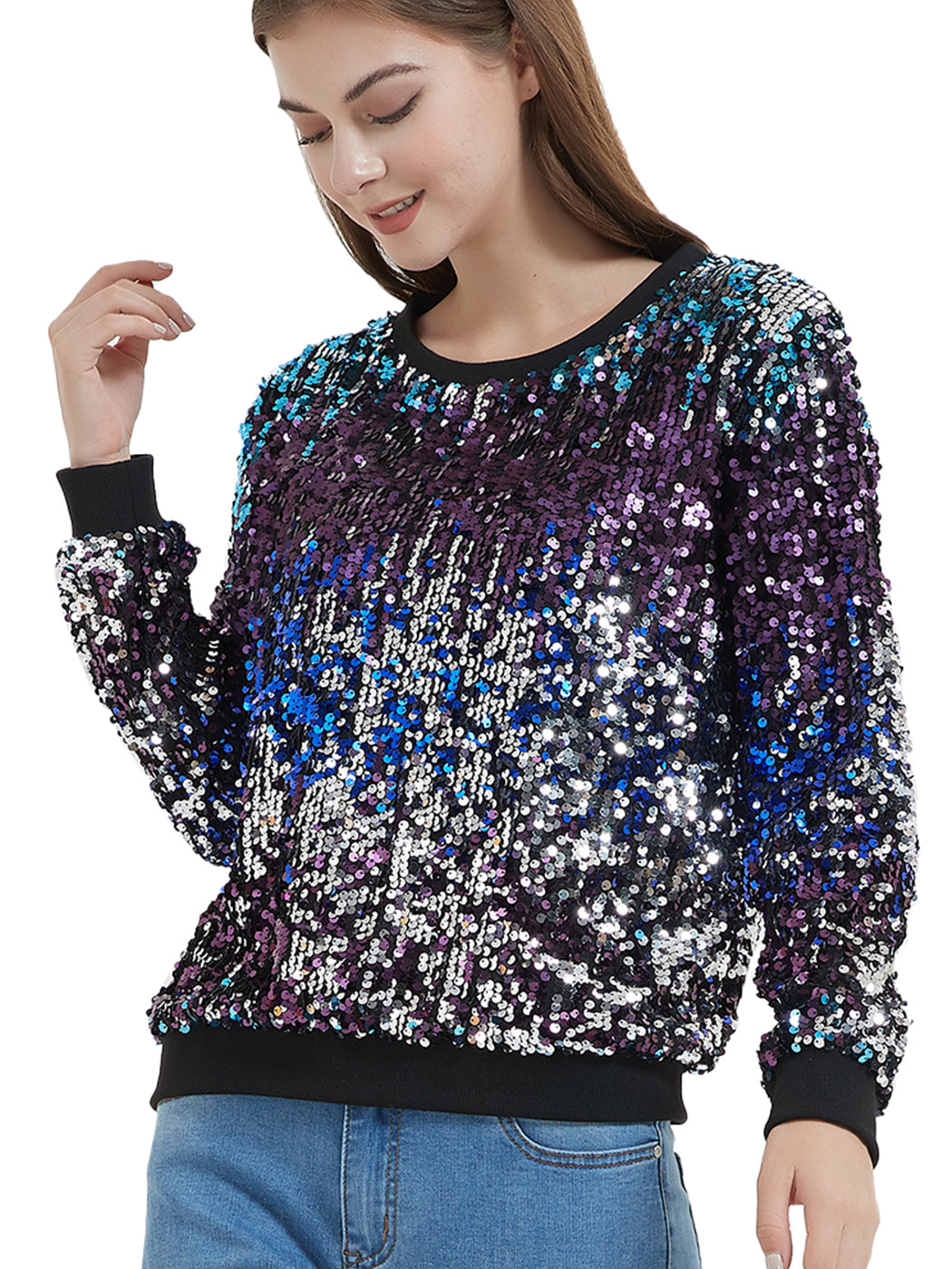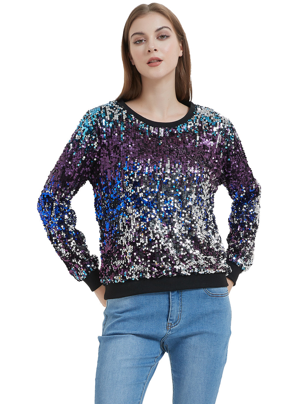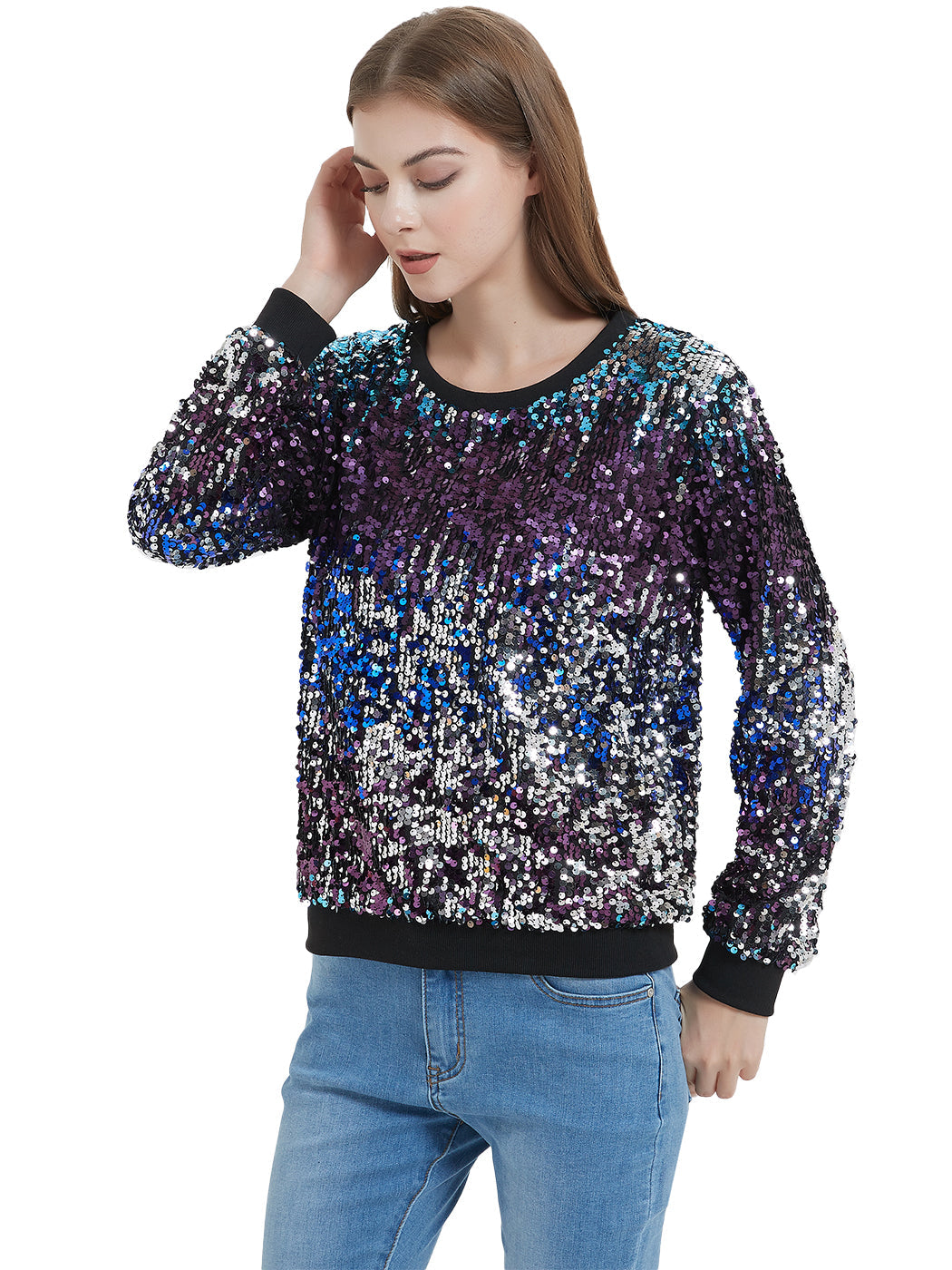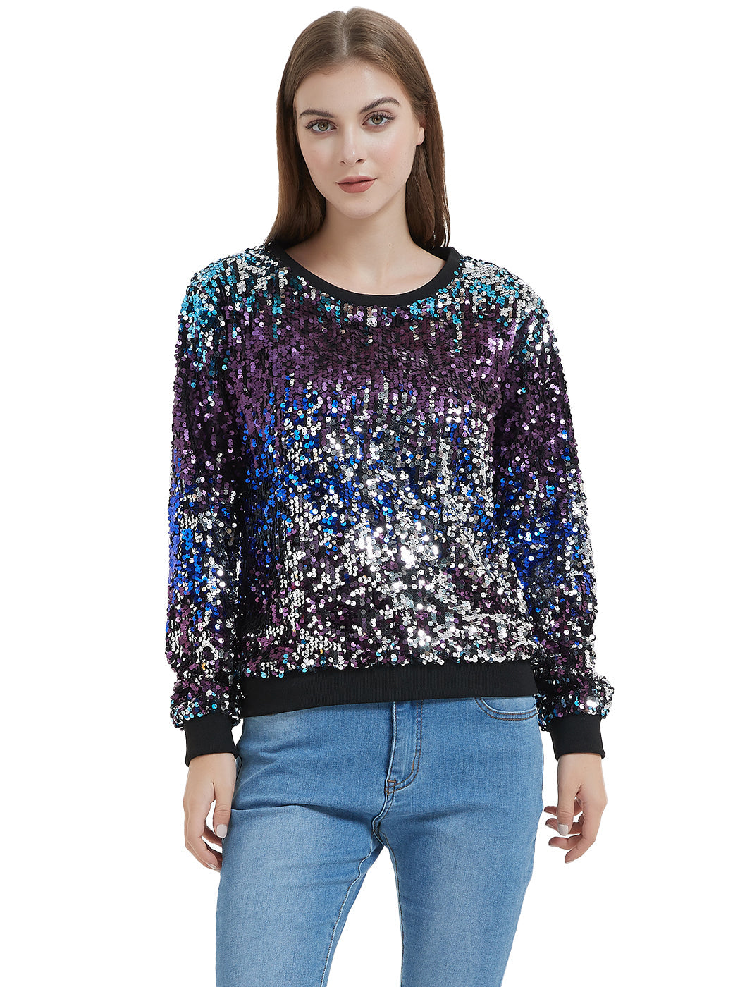 Sequin Sweatshirt Round Neck Top Long Sleeve Ribbed Cuffs Outerwear