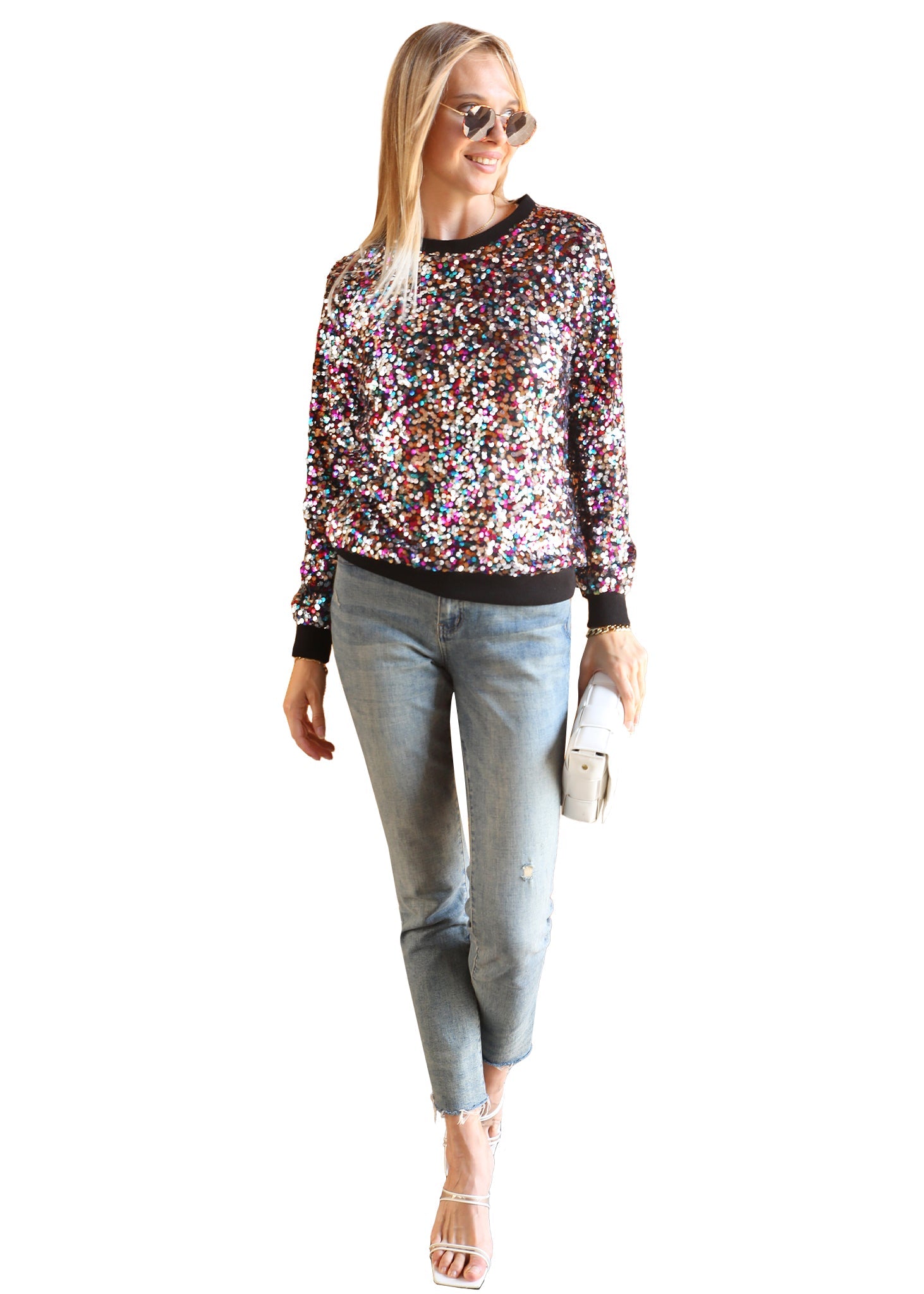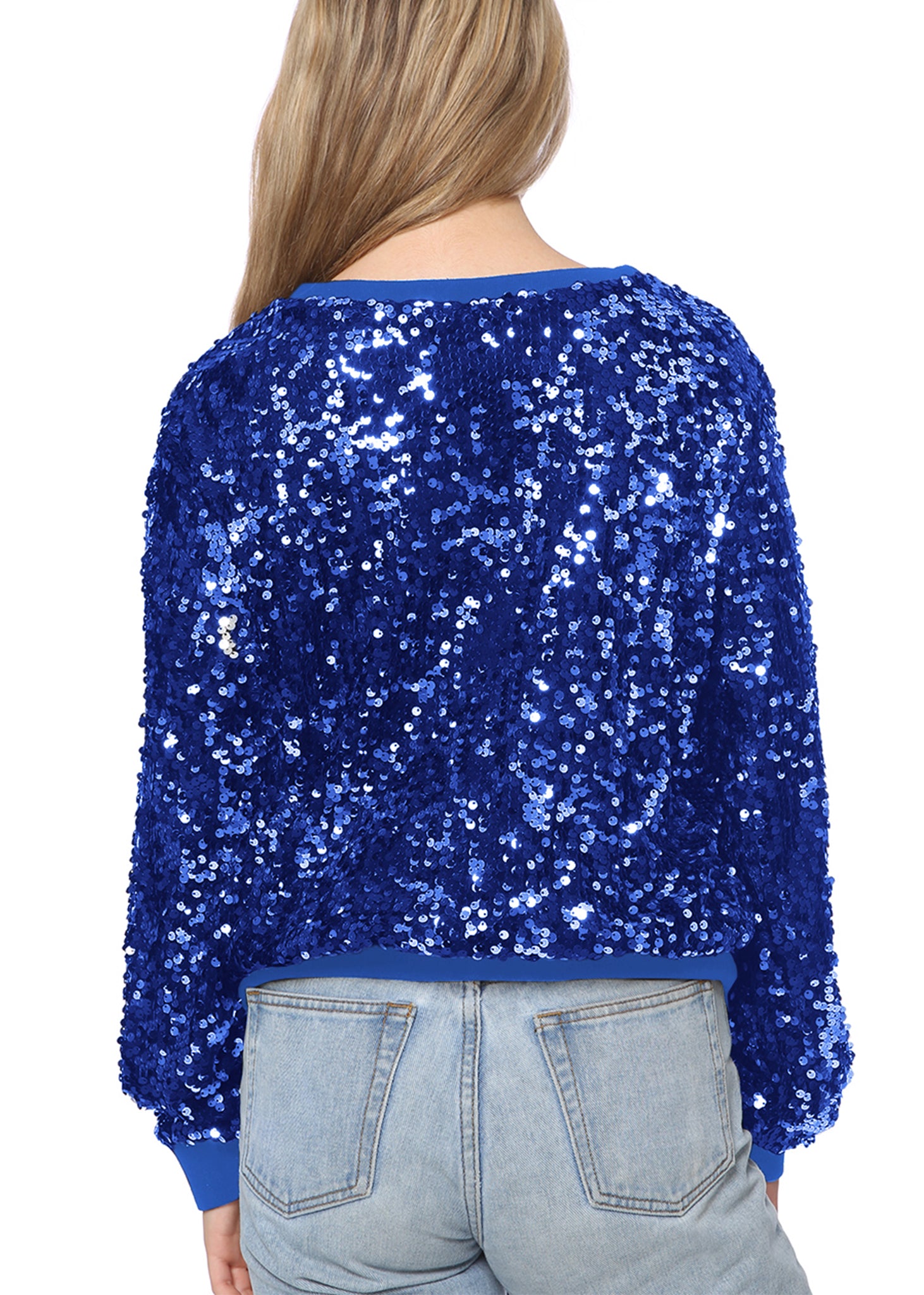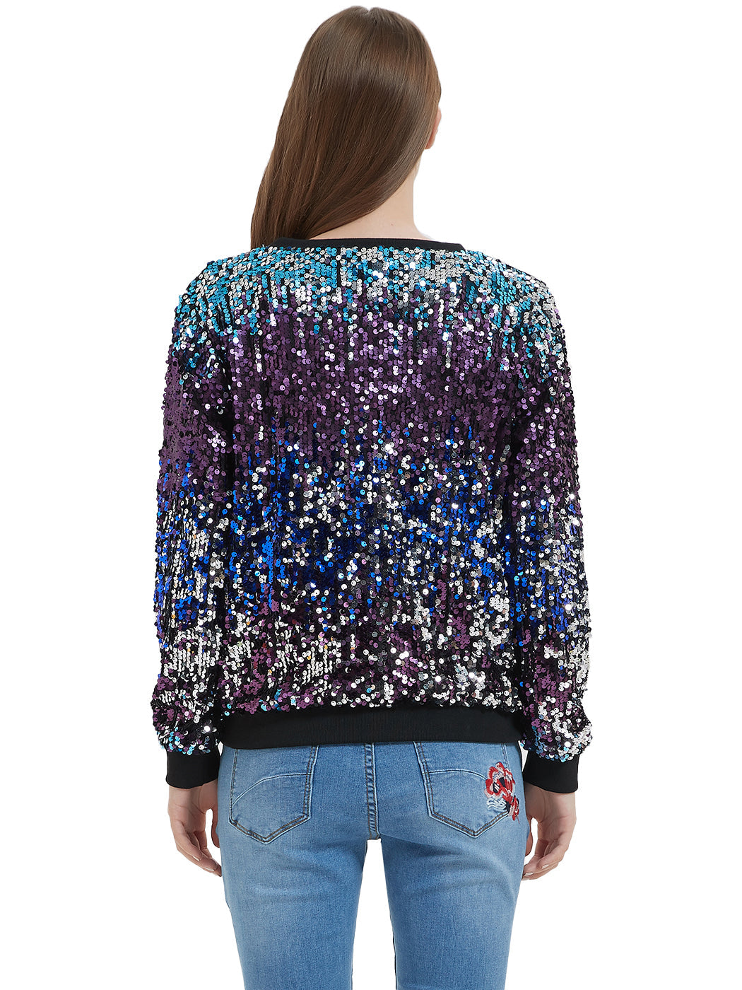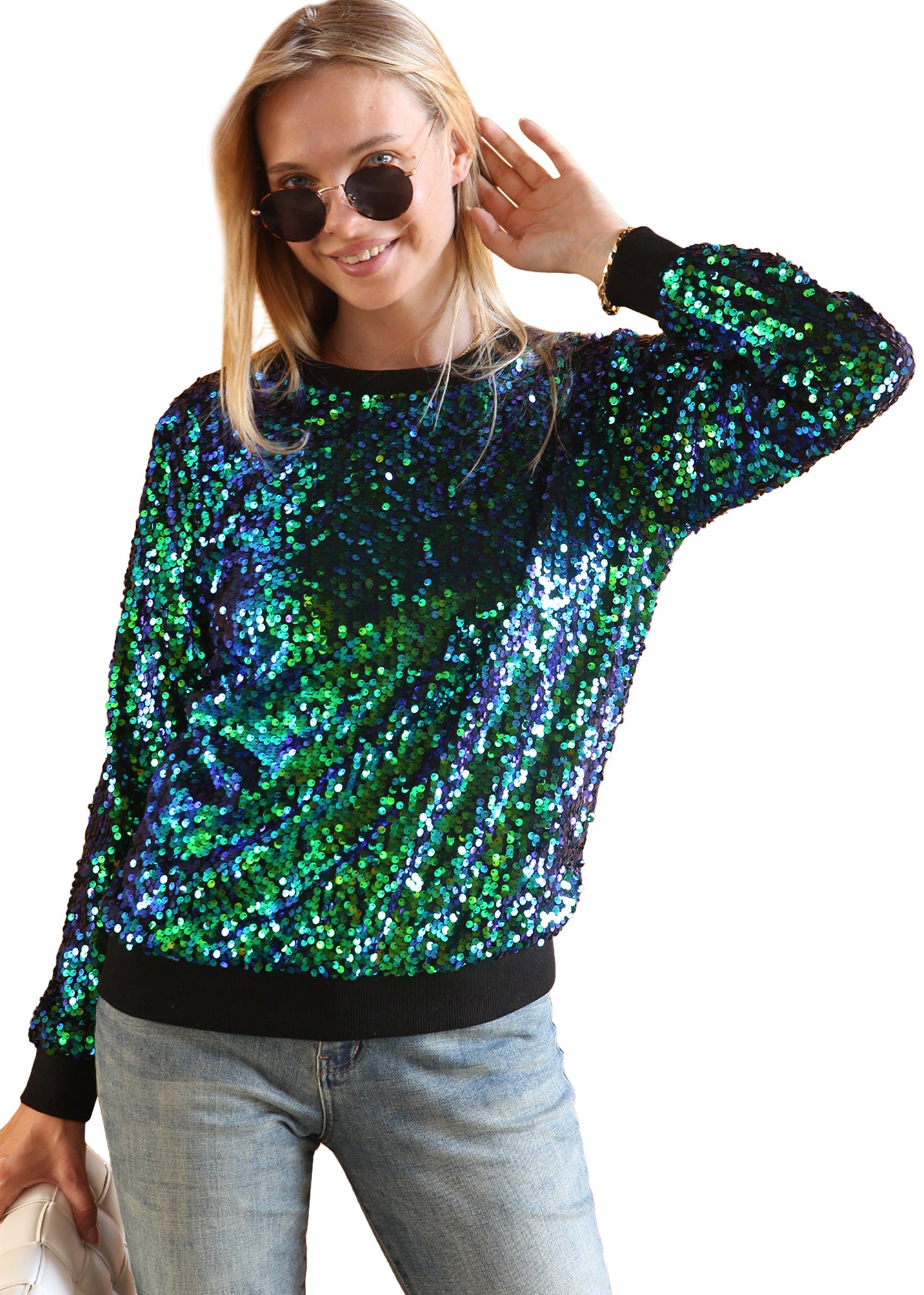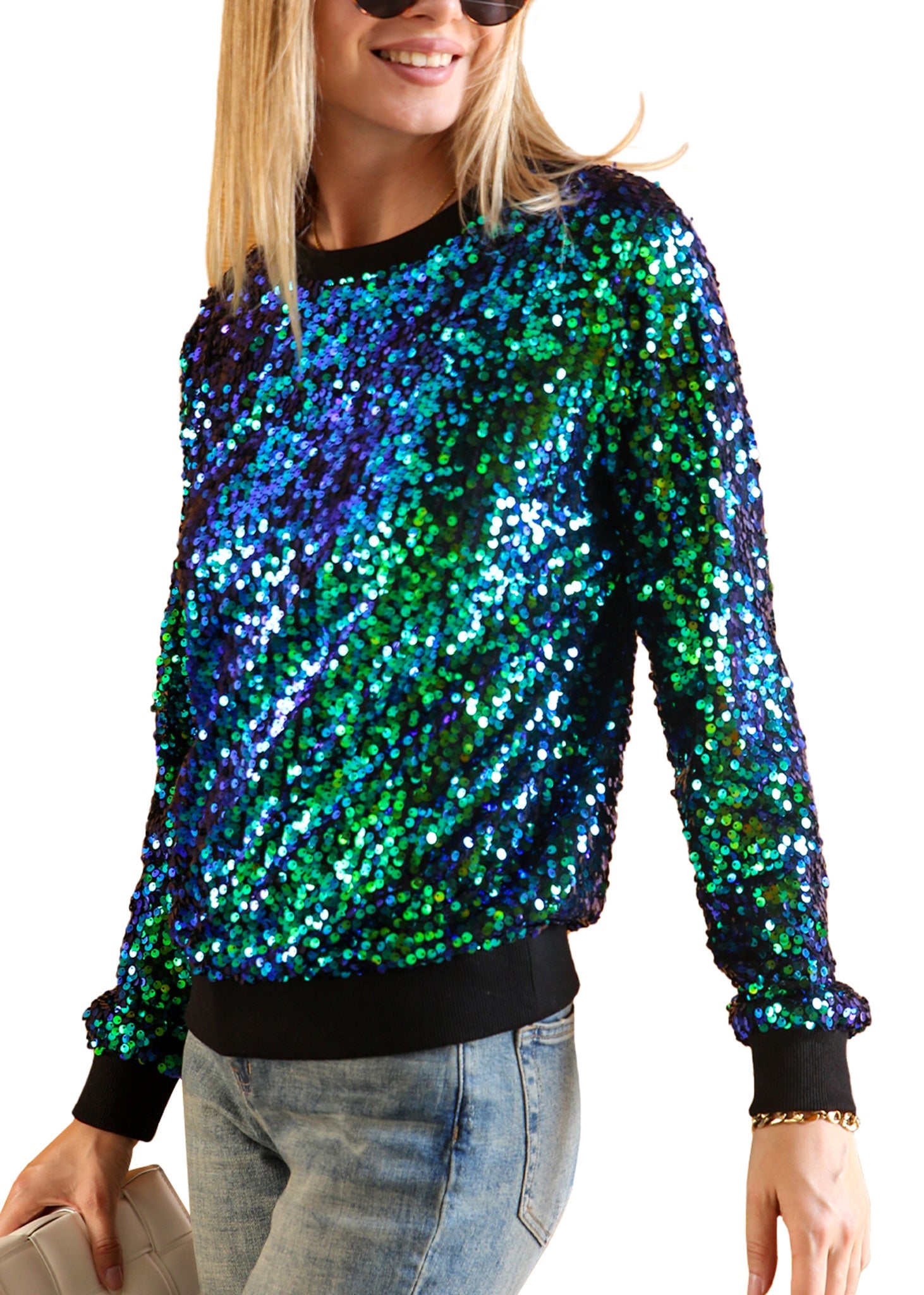 Sequin Sweatshirt Round Neck Top Long Sleeve Ribbed Cuffs Outerwear