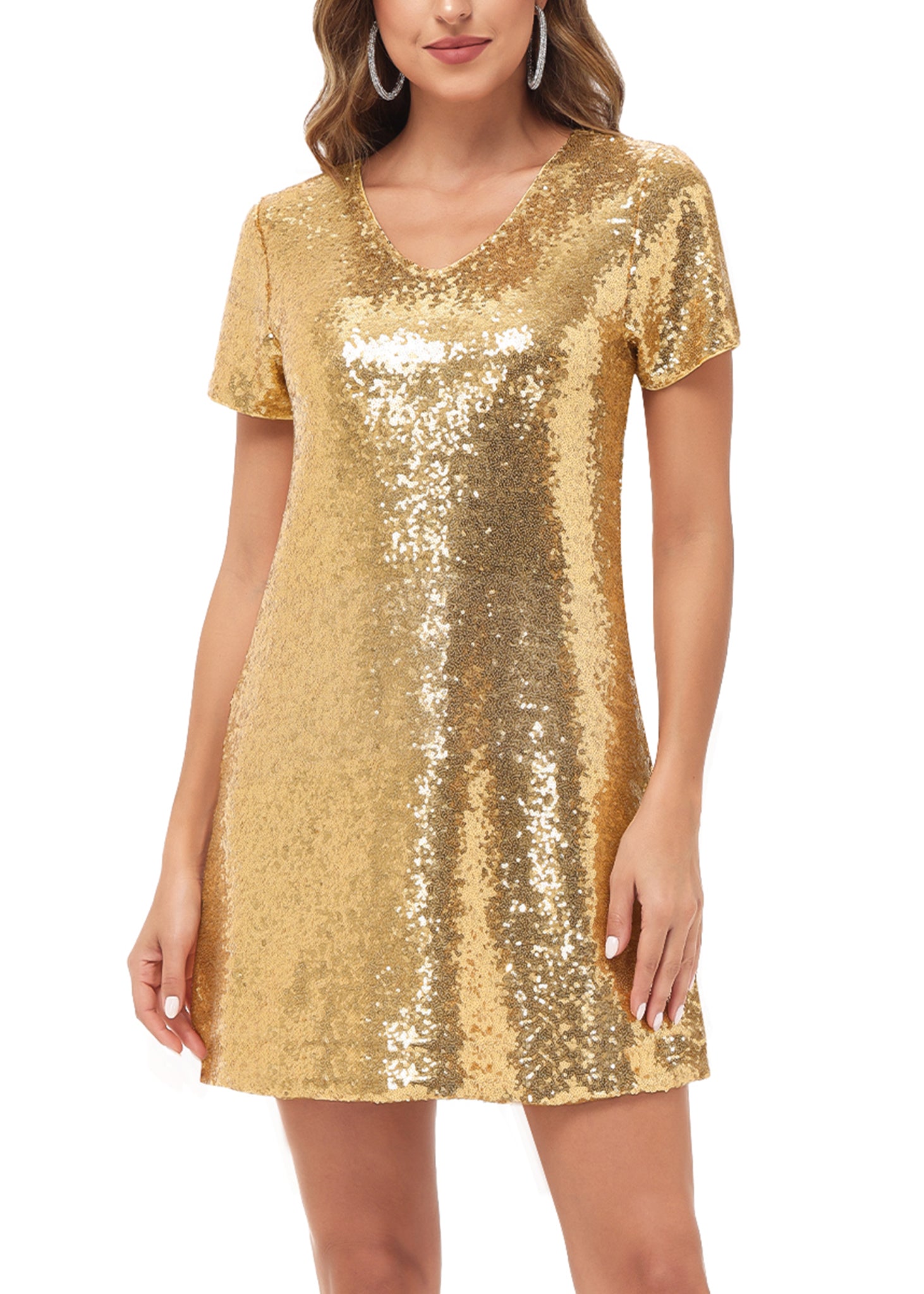 - SHINE BRIGHT LIKE A DIAMOND - This gorgeous party dress features a v-shape neckline, short sleeves, and of course sequins. A glamorous twist on the t-shirt dress that we all love.