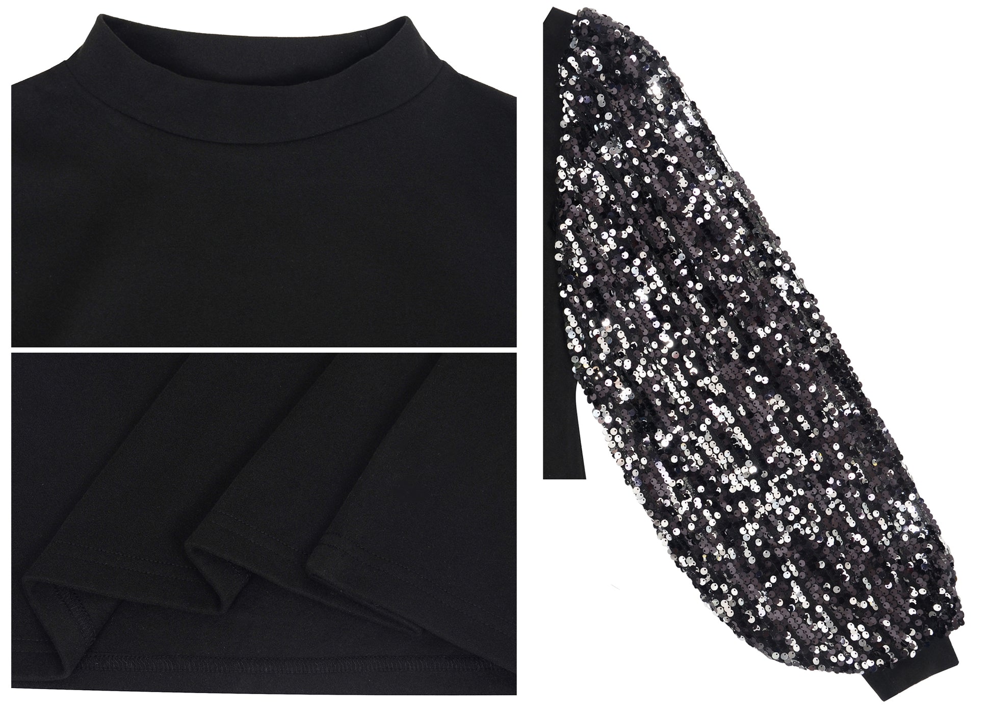 - CONFETTI SEQUINS - This funky top has sequin balloon sleeves that resemble colorful and vibrant confetti! The bodice is simple yet elegant, it fits close to the body giving you a lovely silhouette. It also has a mock neckline which gives you that regal look.
