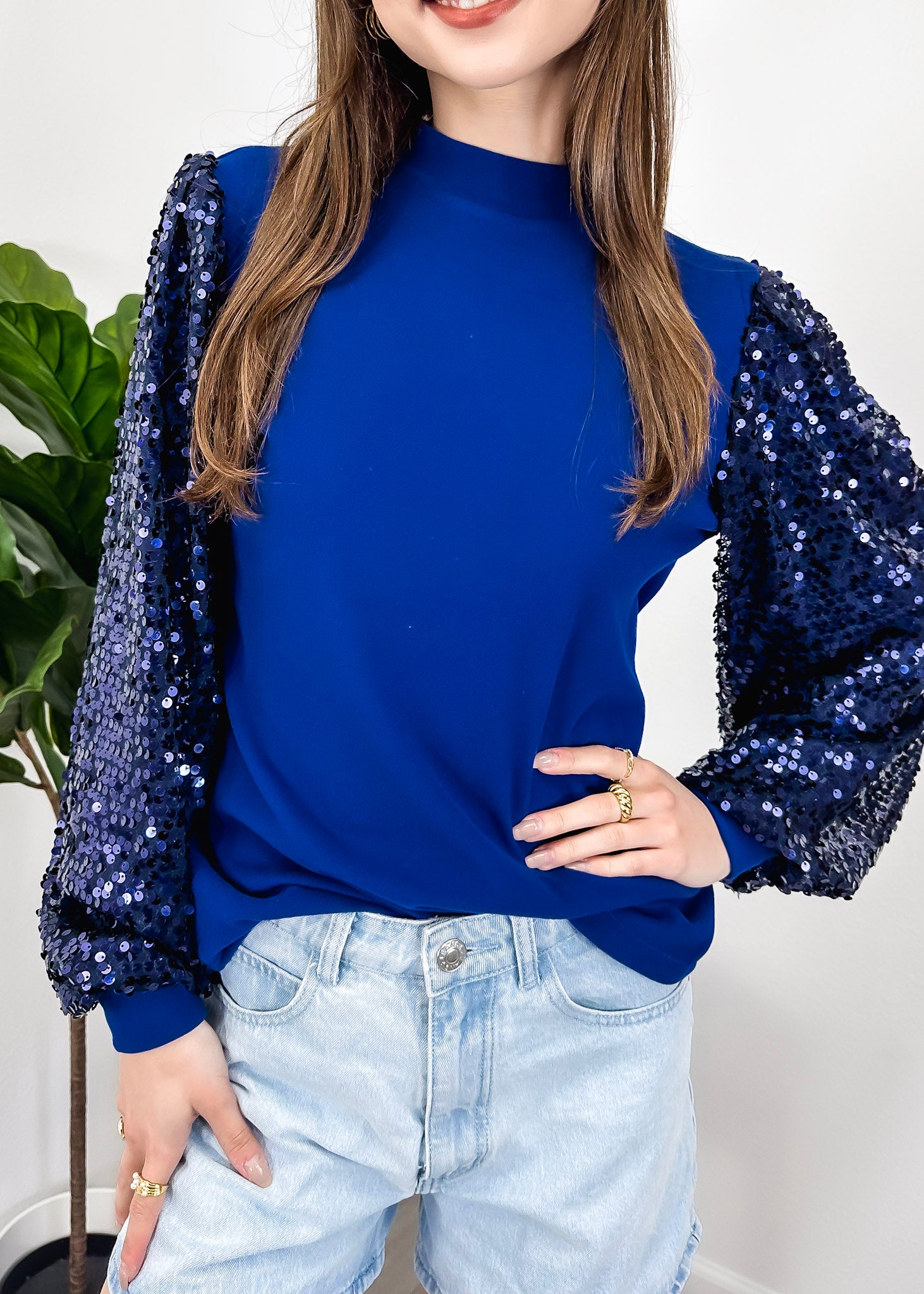 Sequin Balloon Long Sleeve Mock Neck Pullover