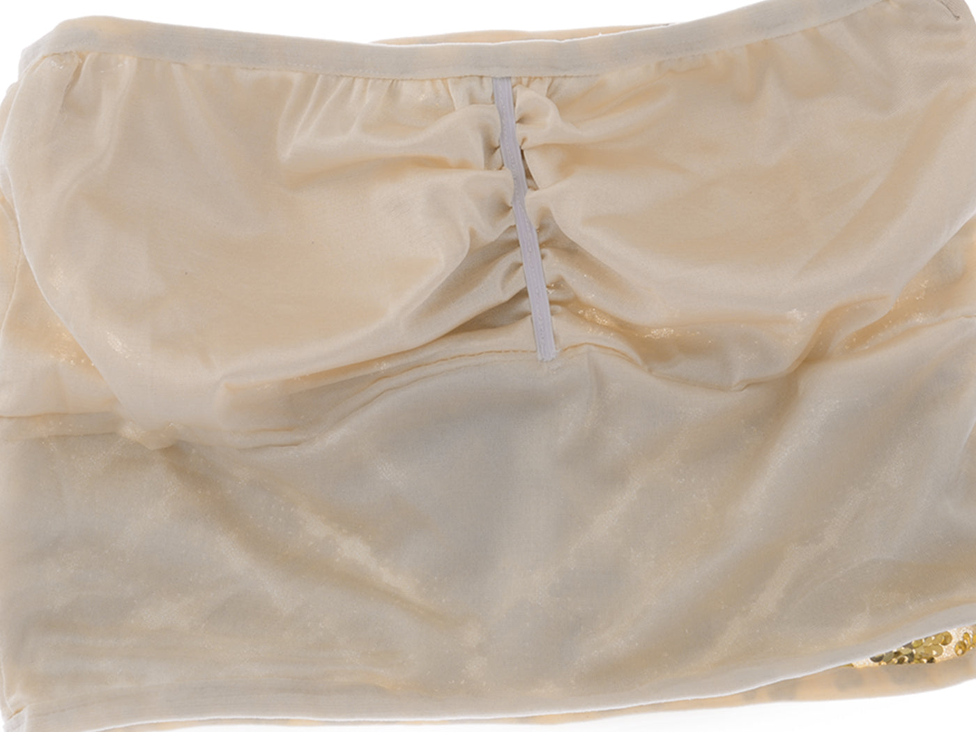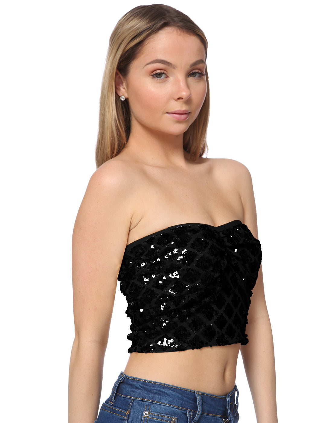 - FEATURES. Strapless, off shoulder, full sequin over tube top, stretchy chest wrap party blouse, sexy crop top, cute bra design. Easy to pair it with skirt or shorts.