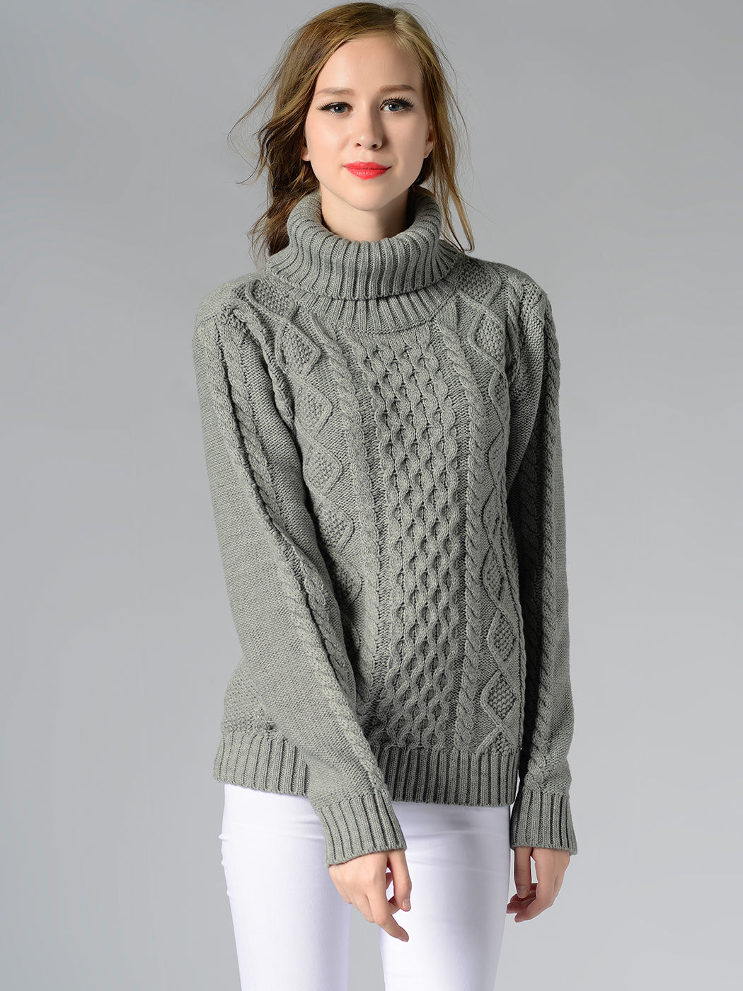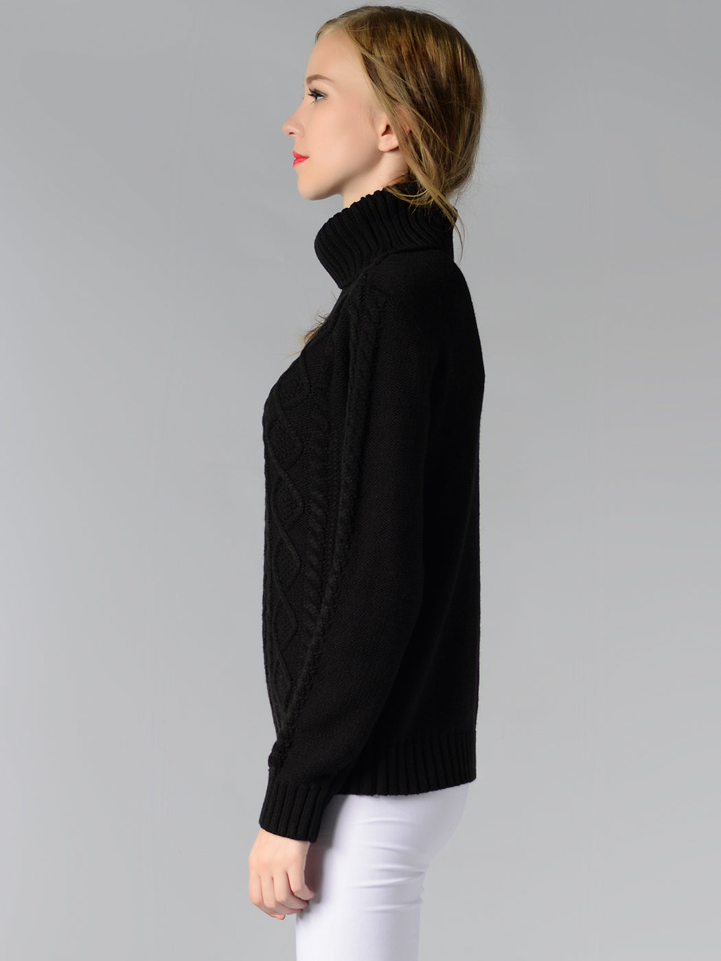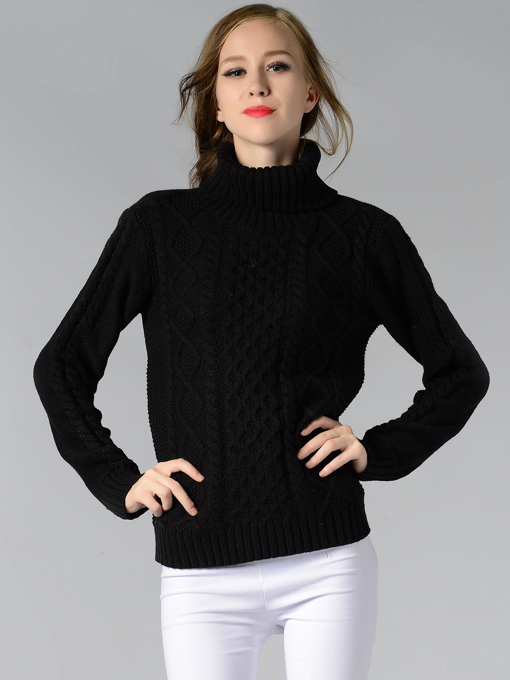 Cable Knit Turtle Neck Stretch Long Sleeve Pullover Sweater