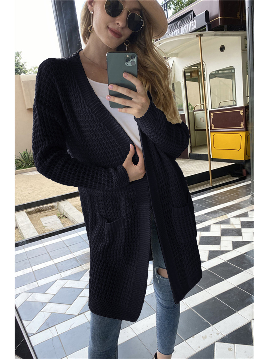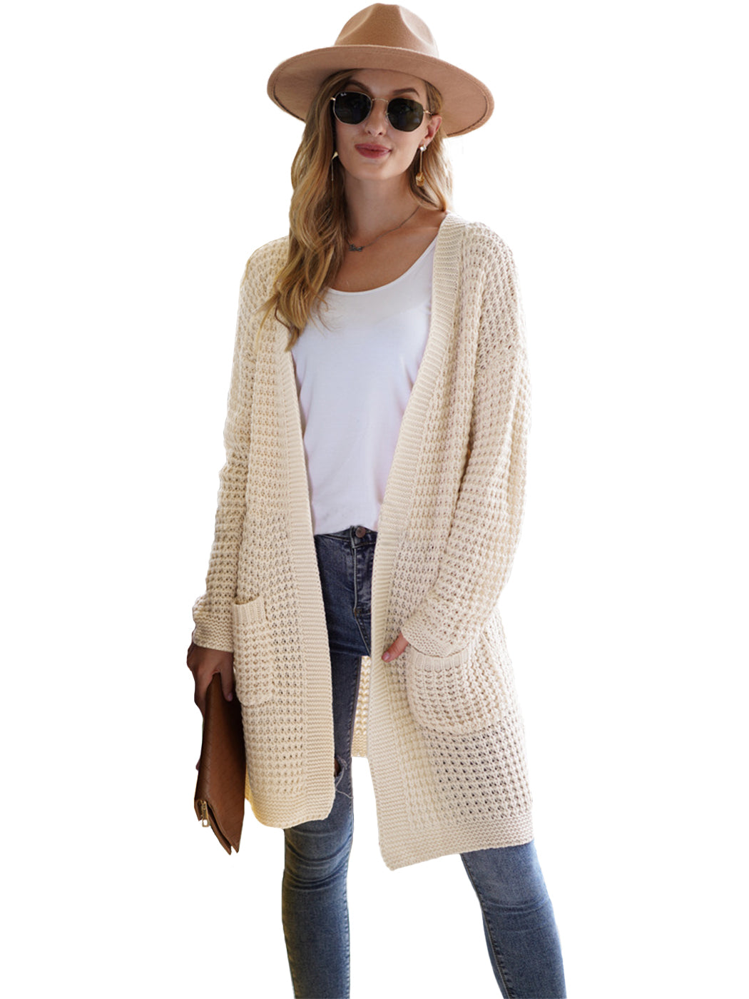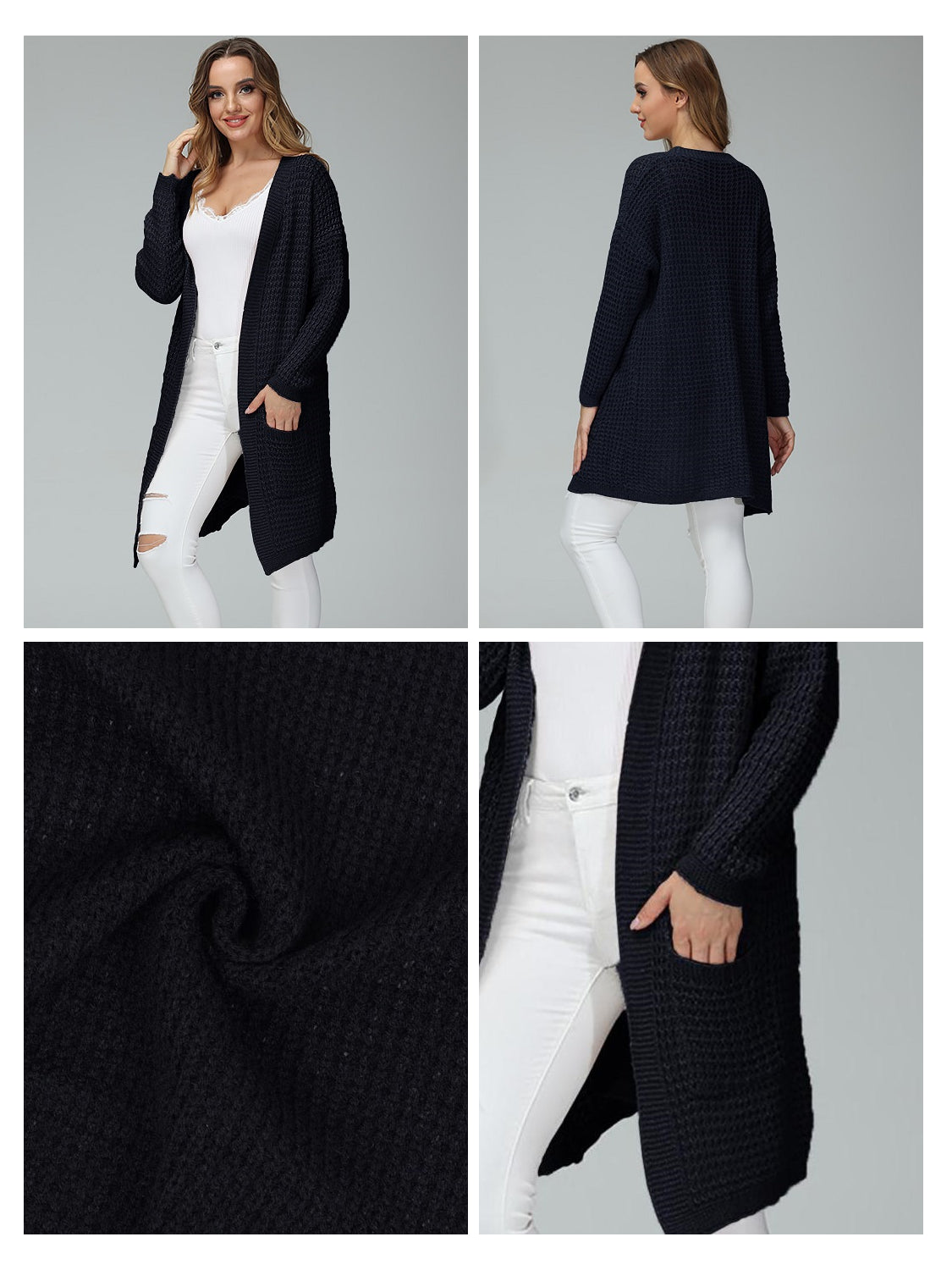 FEATURES: Open front, long sleeve, two pockets, drop shoulder, elastic cuffs, below hip length, waffle knit detailed, simple design, basic cardigan.