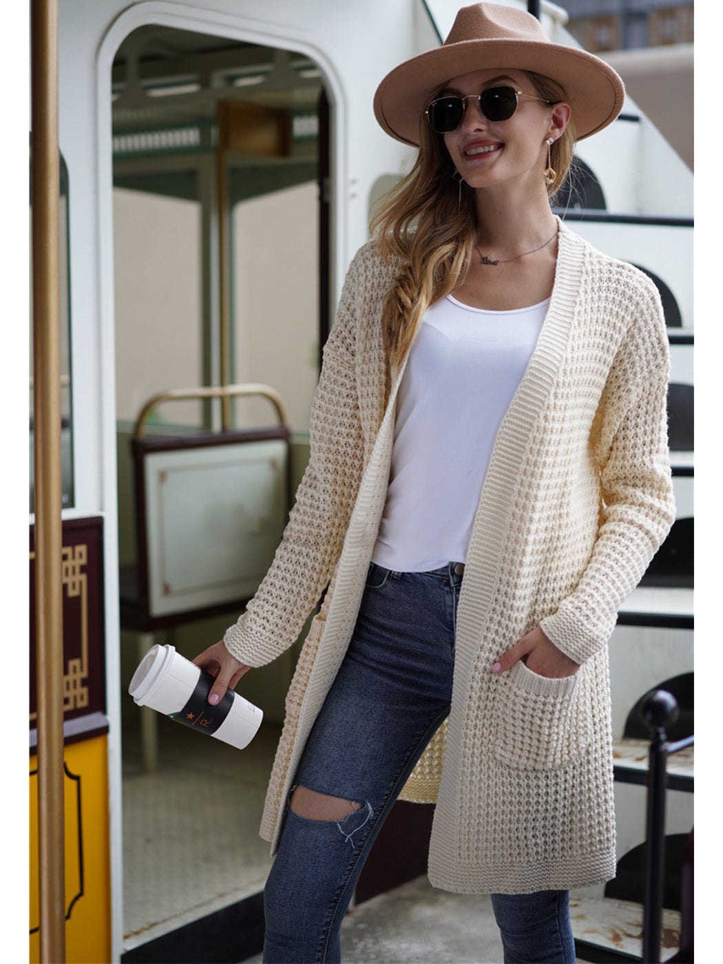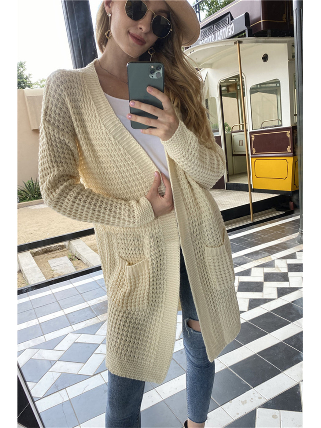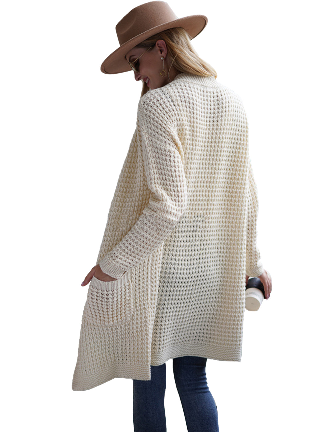 FEATURES: Open front, long sleeve, two pockets, drop shoulder, elastic cuffs, below hip length, waffle knit detailed, simple design, basic cardigan.
