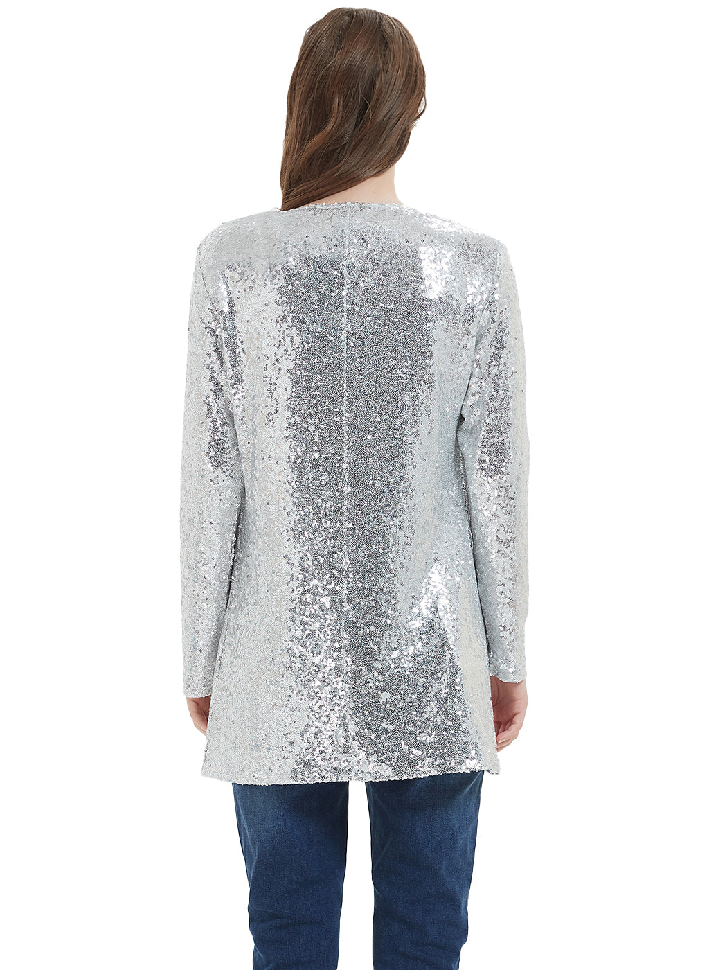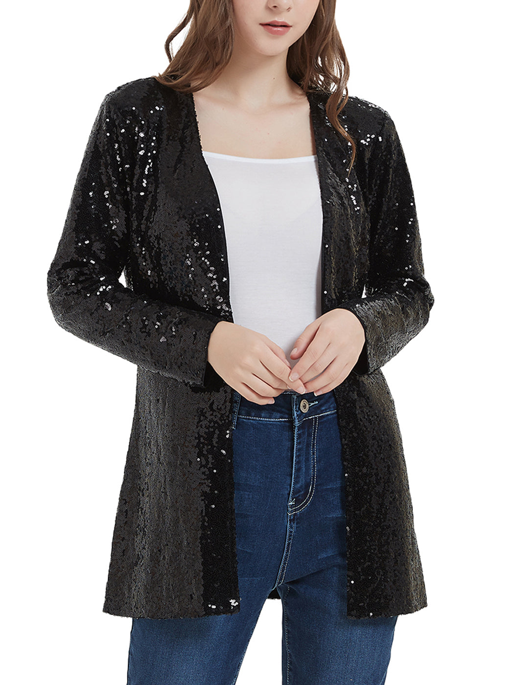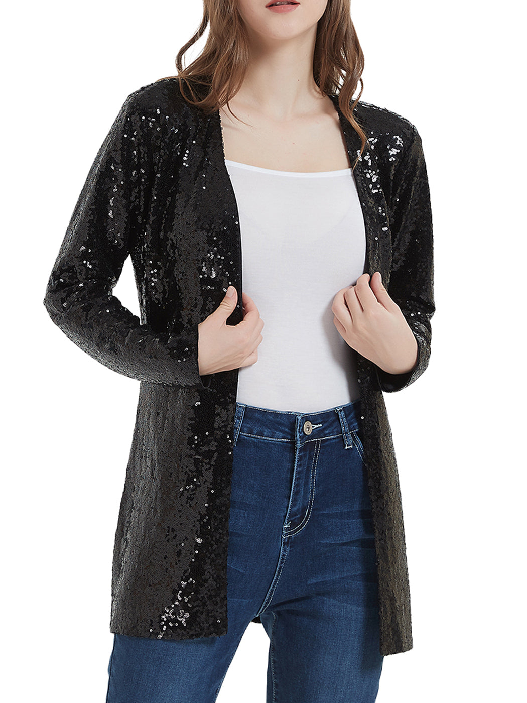 Feature -- Blazer jacket for women featuring allover sequins, long sleeve cardigan , V neck , loose,open front ,No pockets,This jacket creates a polished elegant look.