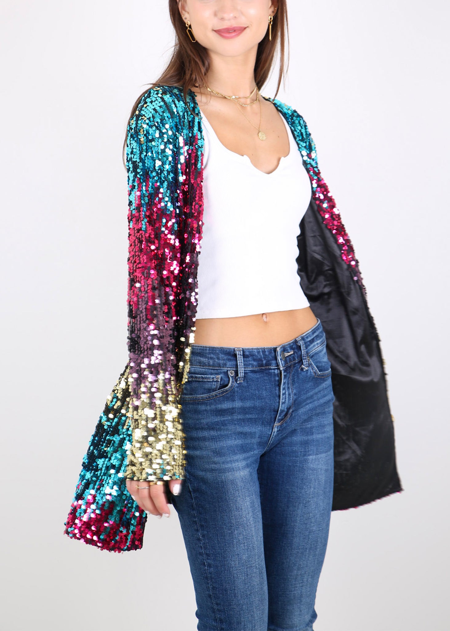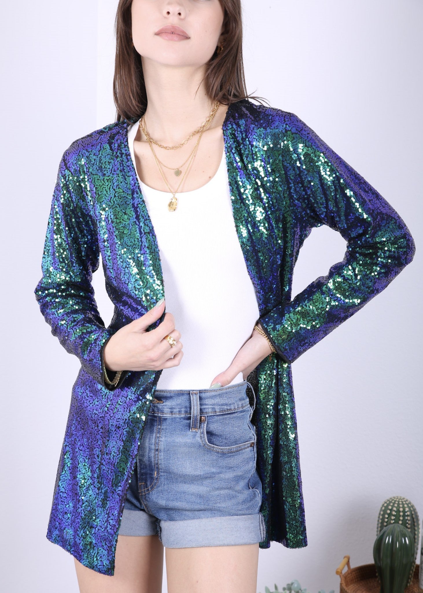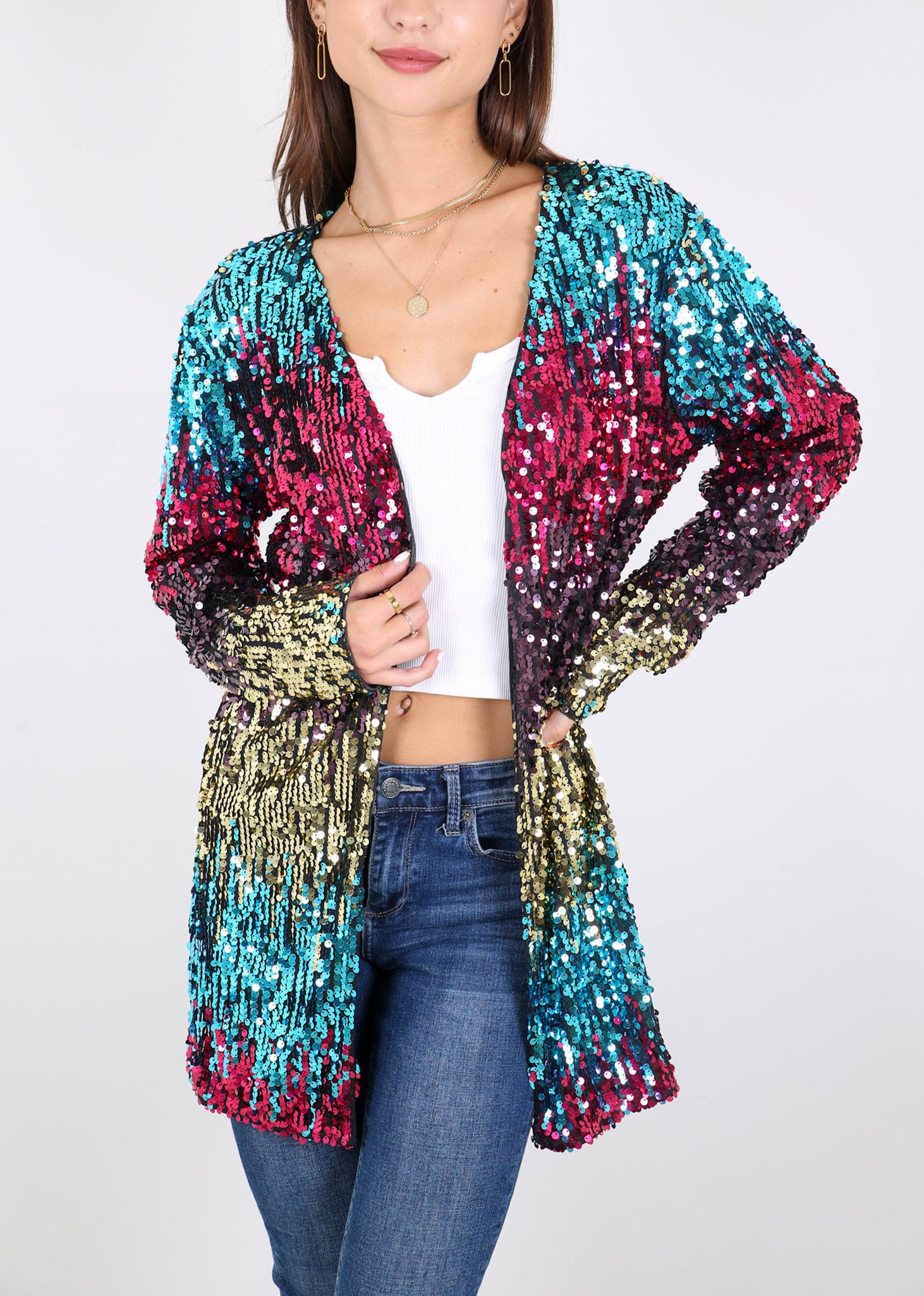 Feature -- Blazer jacket for women featuring allover sequins, long sleeve cardigan , V neck , loose,open front ,No pockets,This jacket creates a polished elegant look.