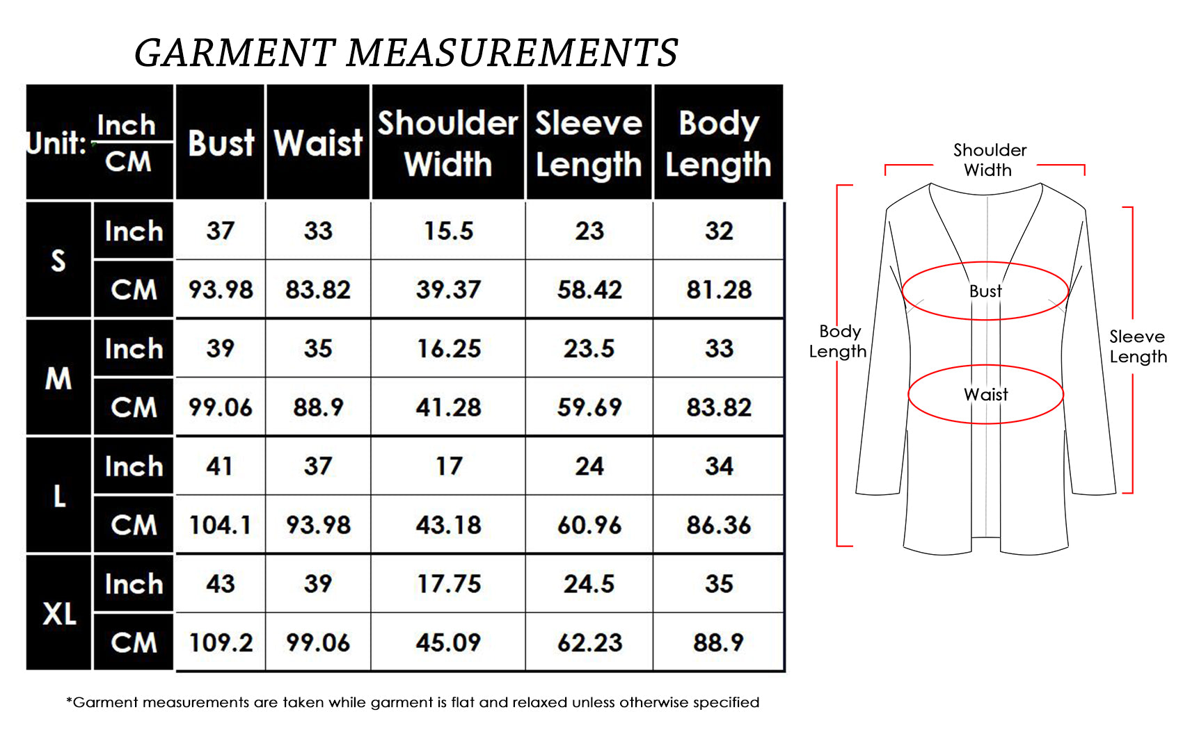 Sizeing -- Model wearing small size.Please refer to the garment measurement chart in the photos for help when choosing a size. If you have any questions regarding size and fit, please do not hesitate to contact us and our style experts can help guide you.