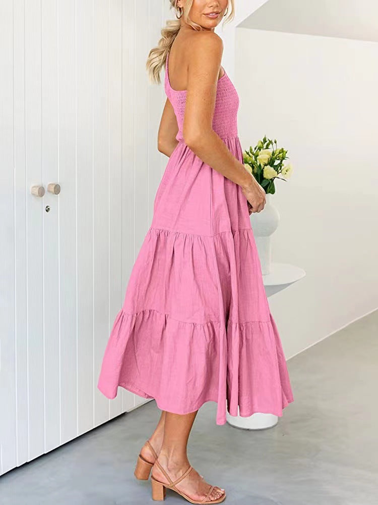 - MUST-HAVE DRESS - This stunning sleeveless midi dress has a trending slashed neckline emphasised by asymmetrical shoulder straps, the empire waistline along with midi length can hide your belly and hip, make you to looks more slender.