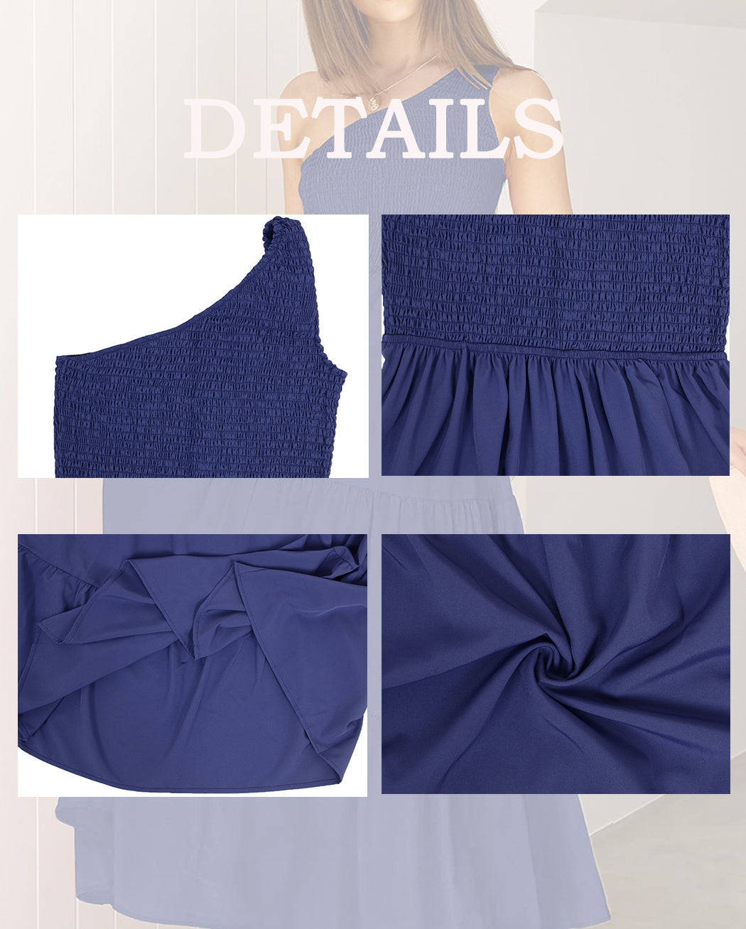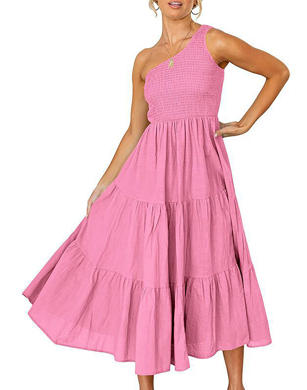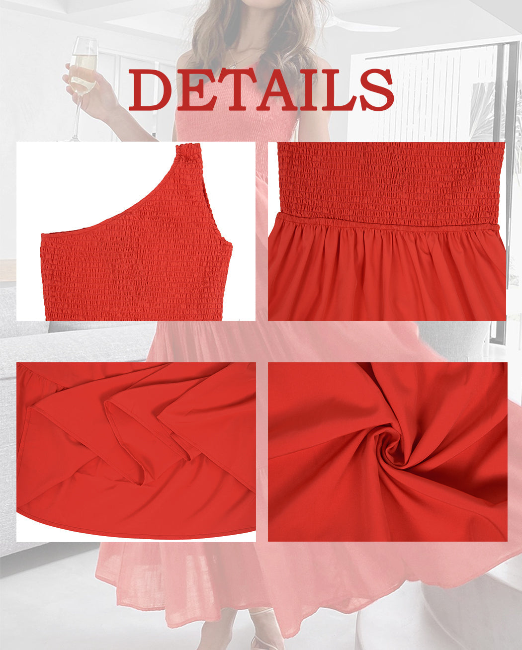 - MATERIAL - Summer one shoulder maxi dress is made of 95%Polyester,5%Spandex, stretchy, lightweight and swing, not sheer, not cling, flowy, comfortable for all season.