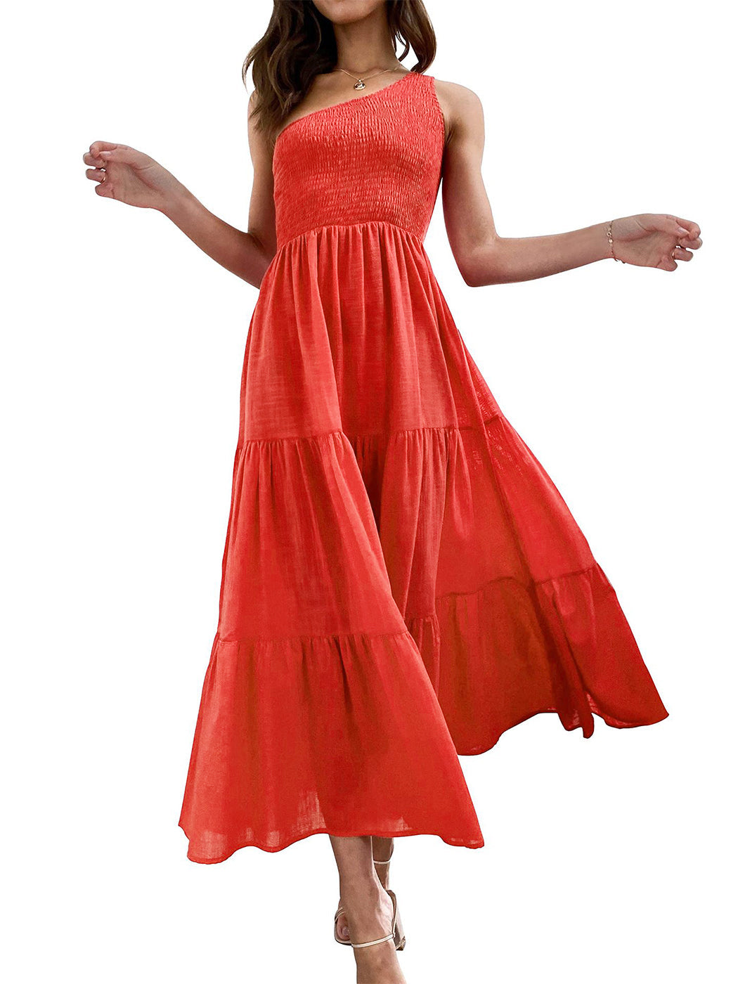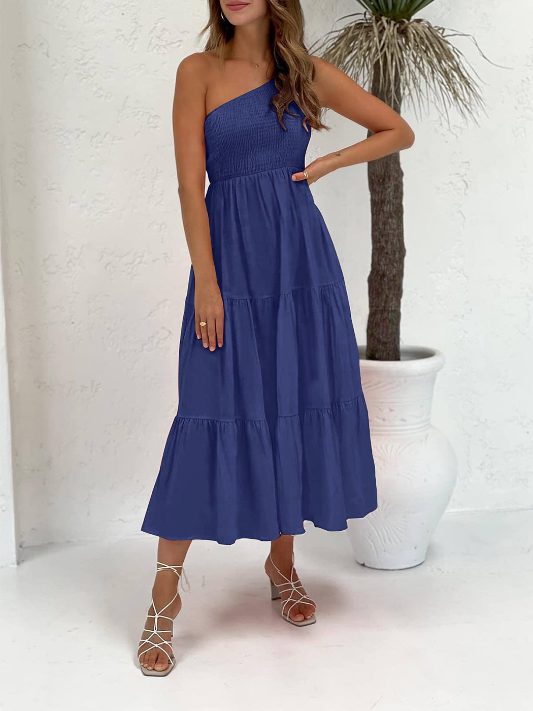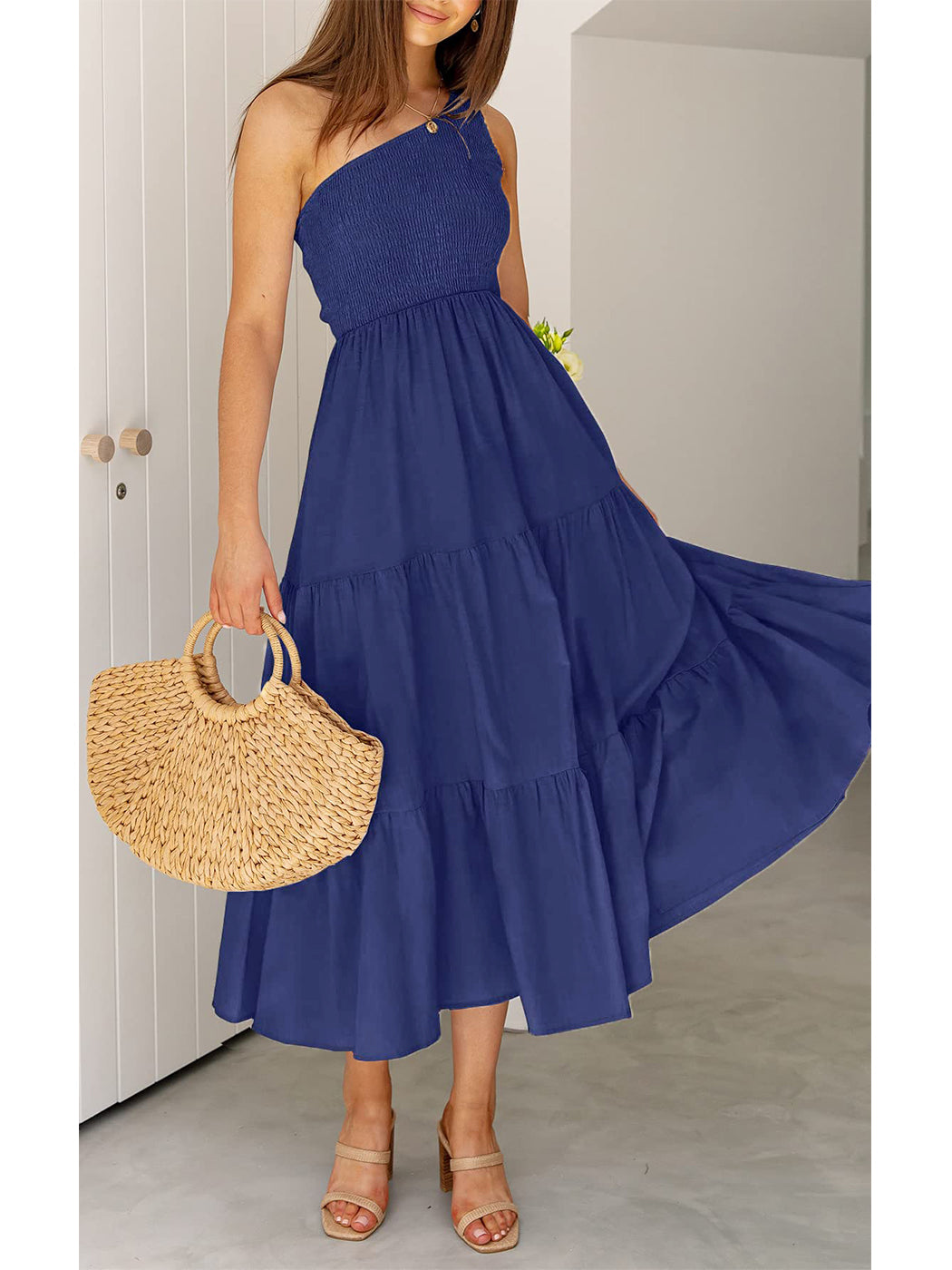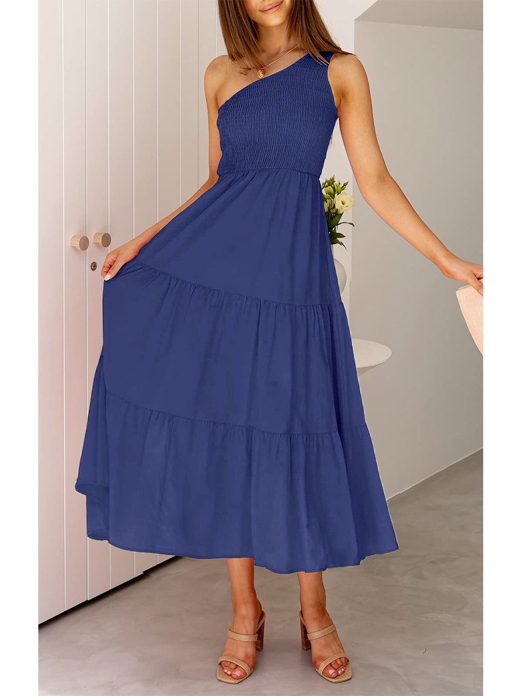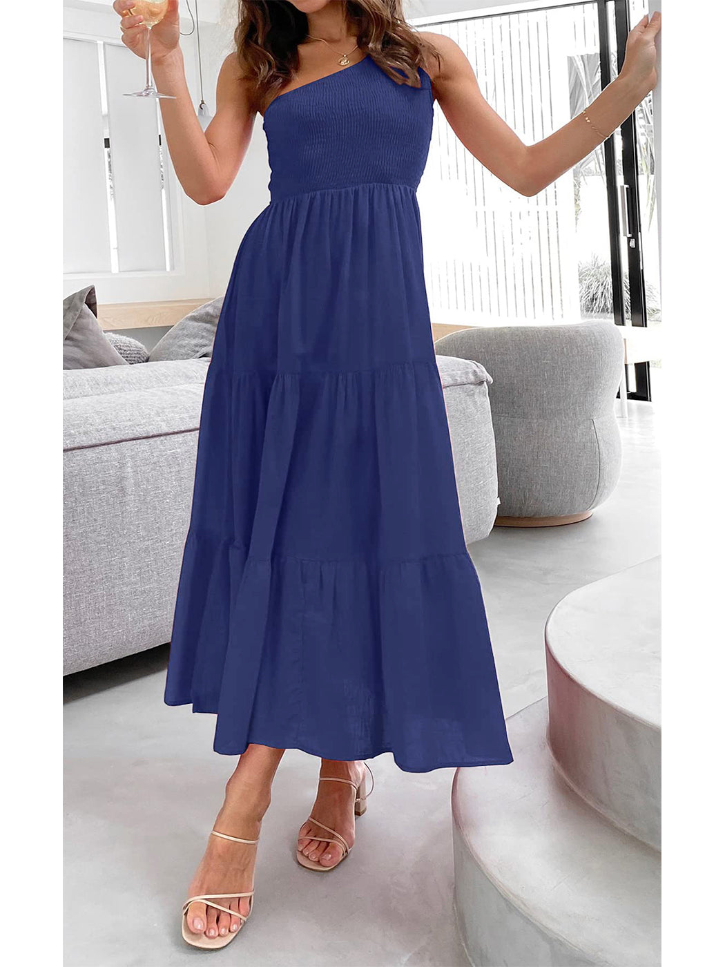 - FEATURES - The off shoulder maxi dress is the perfect blend of sophistication and romance. Featuring gorgeous one-shoulder design, elastic shirred bust, classic solid color, sexy open back, A-line style, high waist, with a flowy tiered hem.