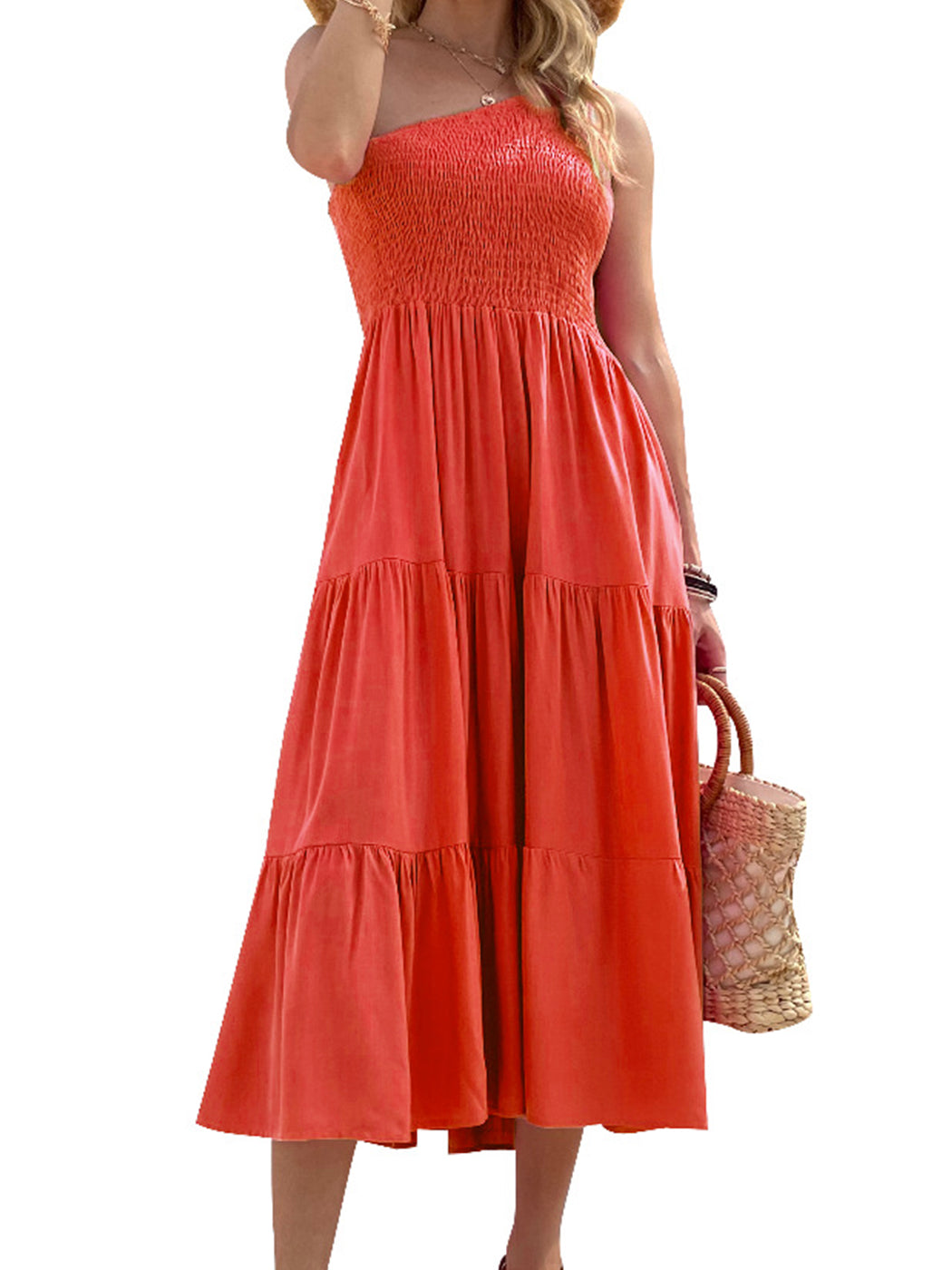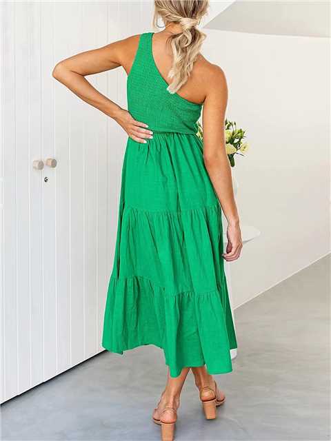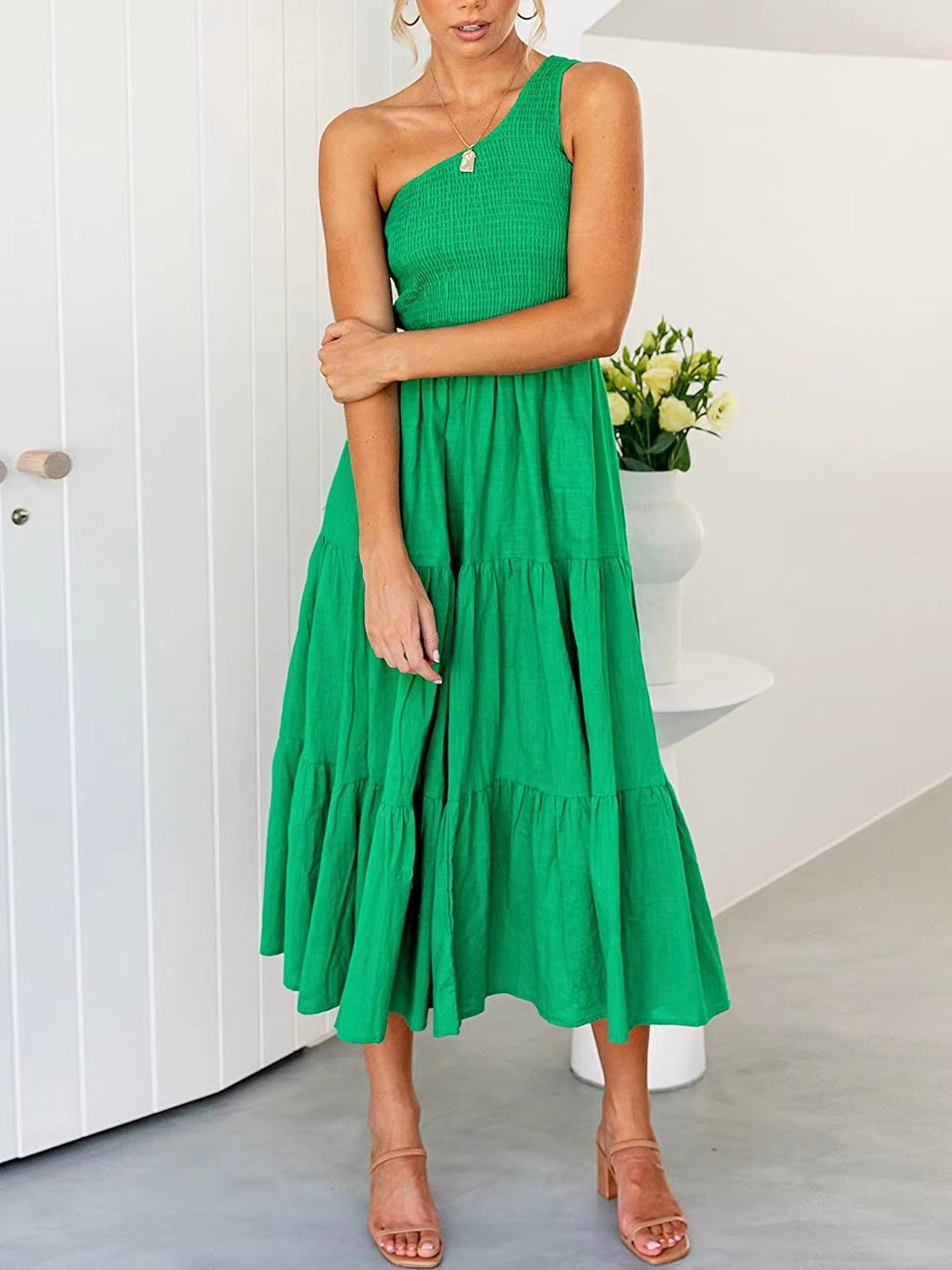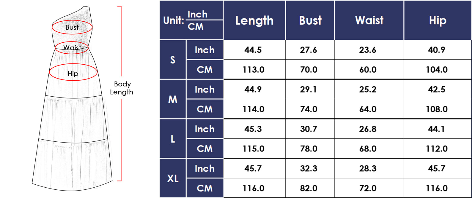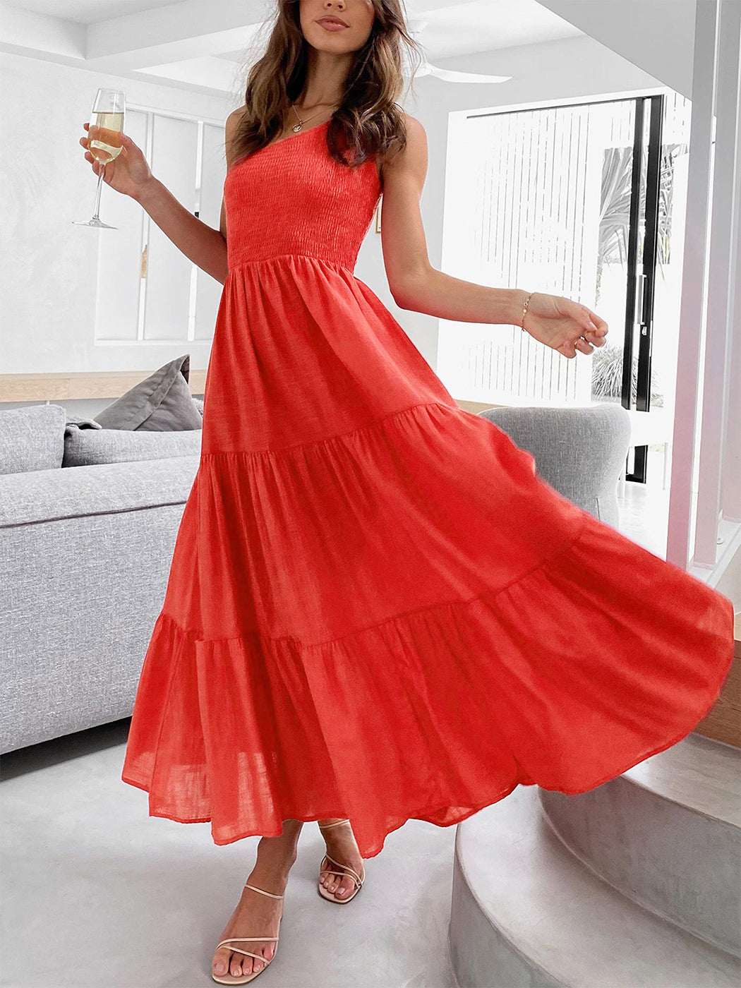 - FEATURES - The off shoulder maxi dress is the perfect blend of sophistication and romance. Featuring gorgeous one-shoulder design, elastic shirred bust, classic solid color, sexy open back, A-line style, high waist, with a flowy tiered hem.