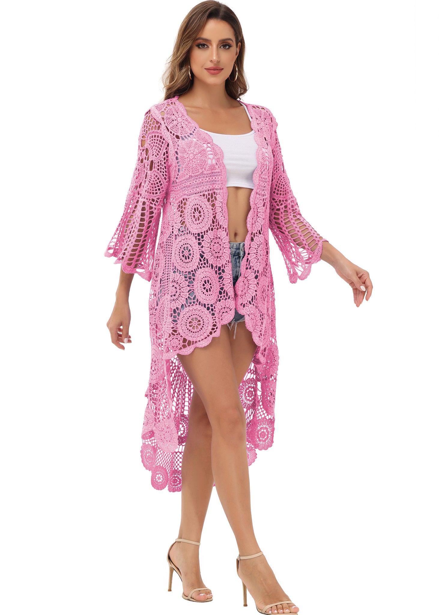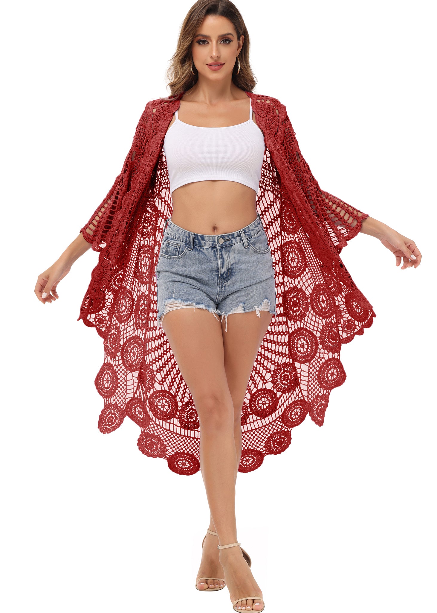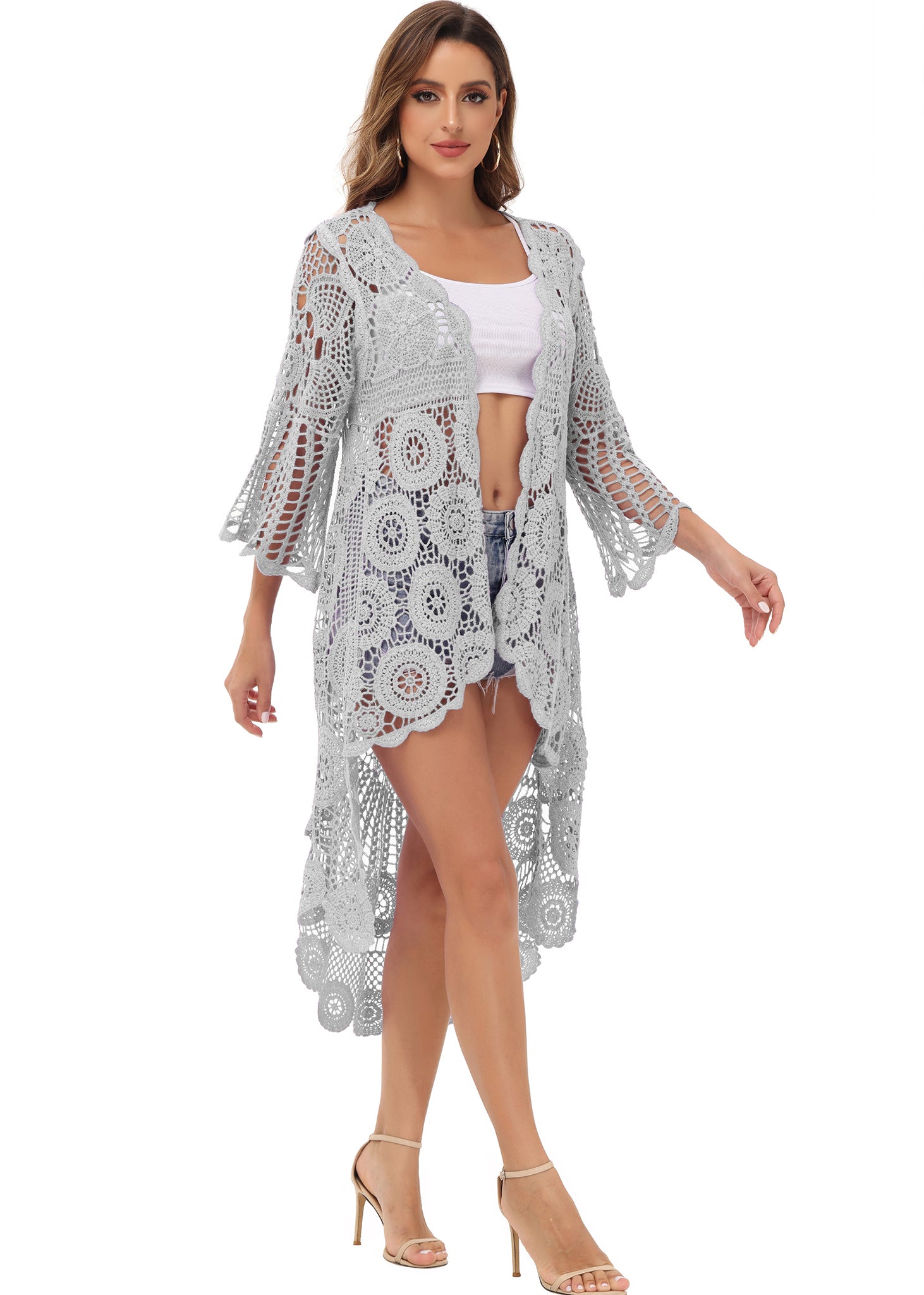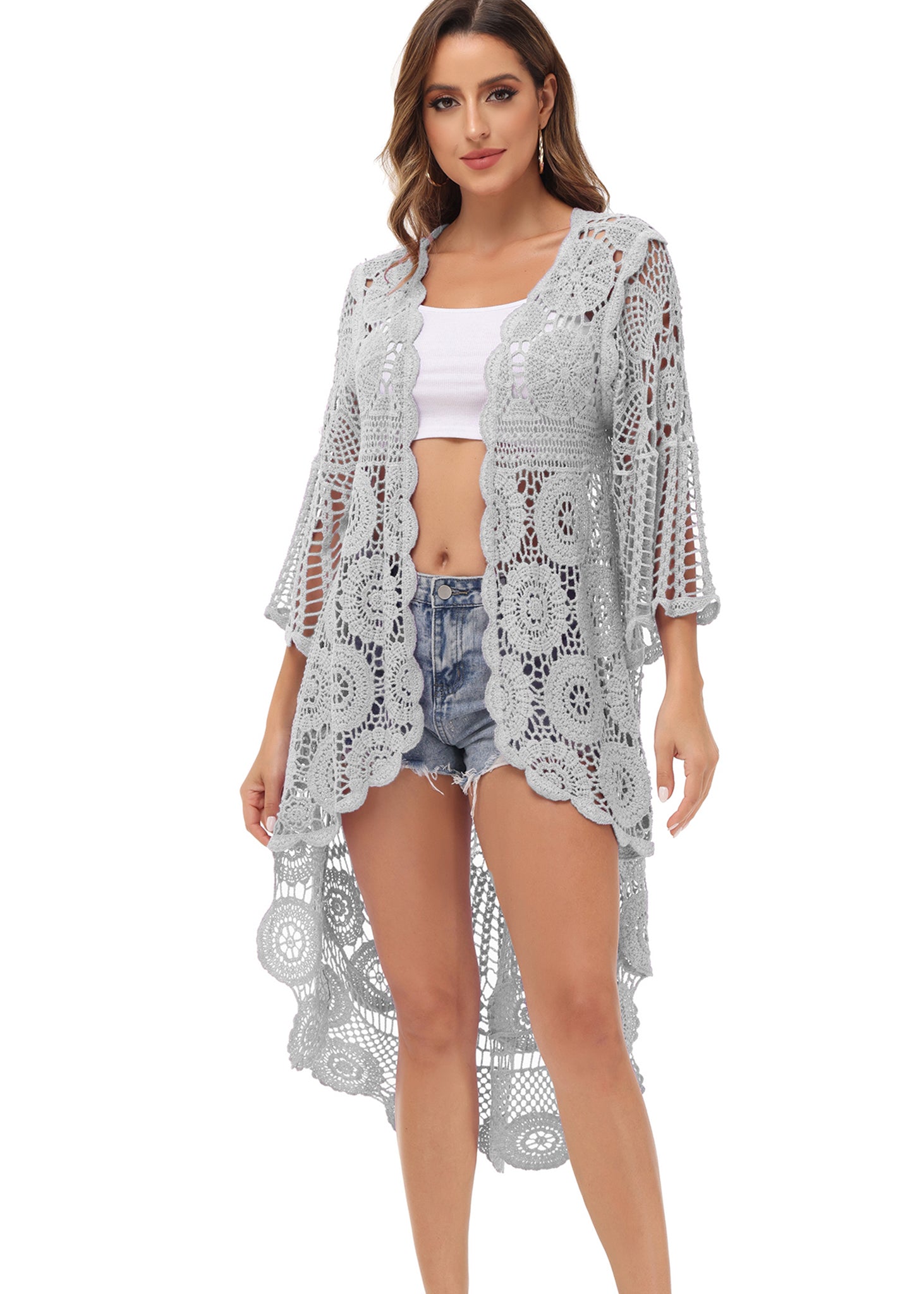 - UNIQUE DESIGN -- Lightweight open front short sleeve cover up cardigan featuring cut out flower lace design.This bohemian, floral detailed style cardigan featuring an asymmetric hem design, large arm cutouts and loose oversized fit is flattering for all body types.