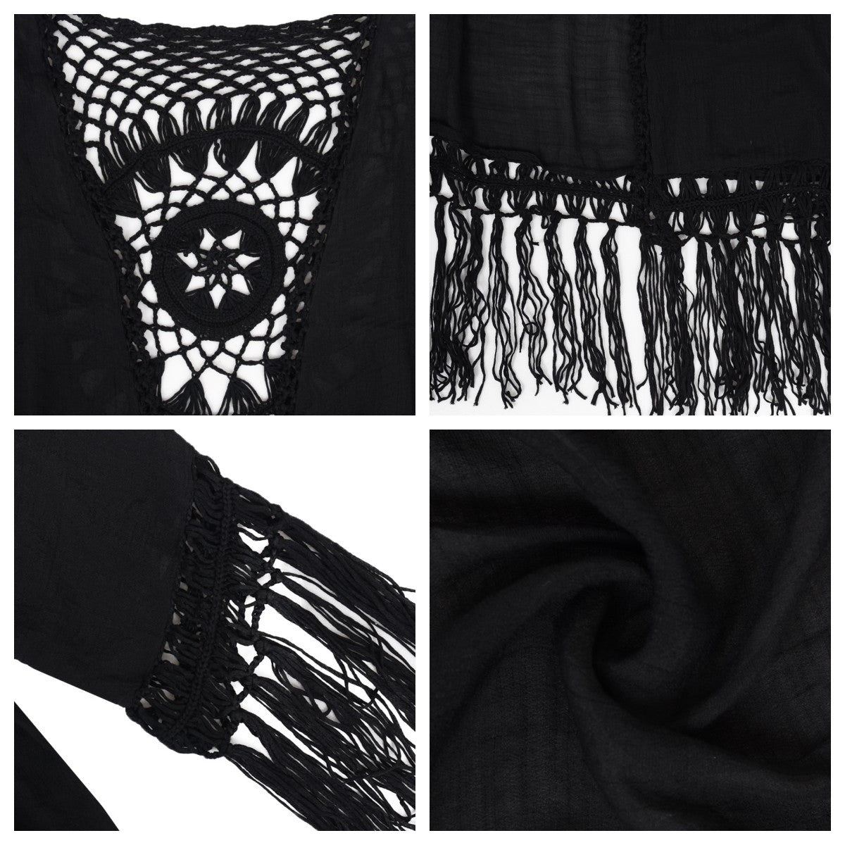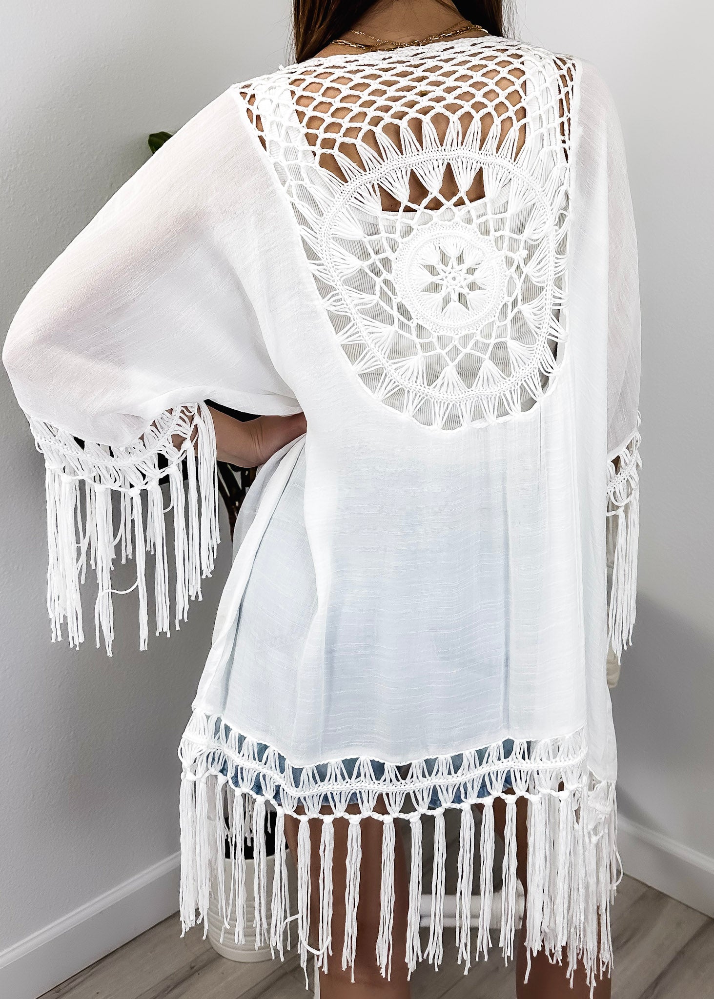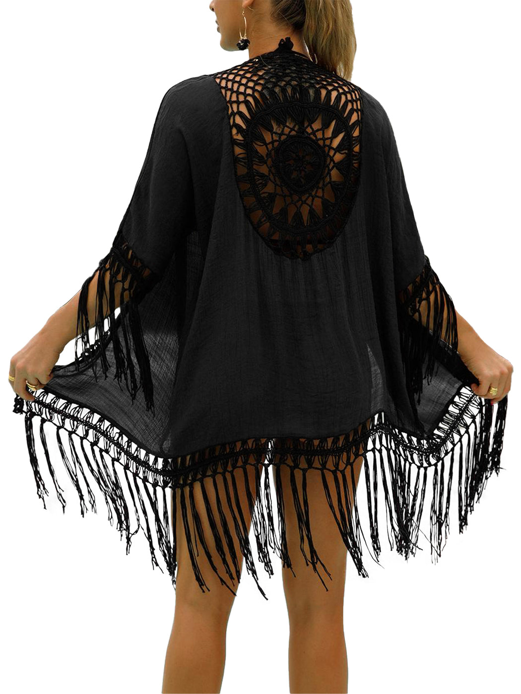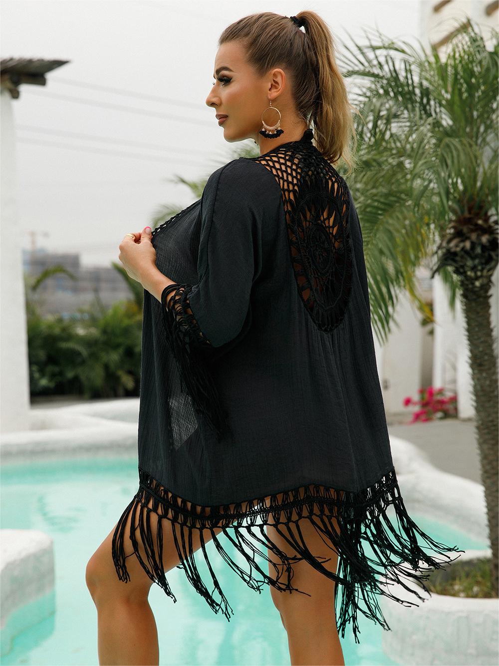 DETAILS - Featuring a bohemian style with semi-sheer fabric and a crochet pretty back design. The open front is loose and easy to take on, and the cardigan has a flowing mesh tassel trim at the hem for both fashion and comfort.