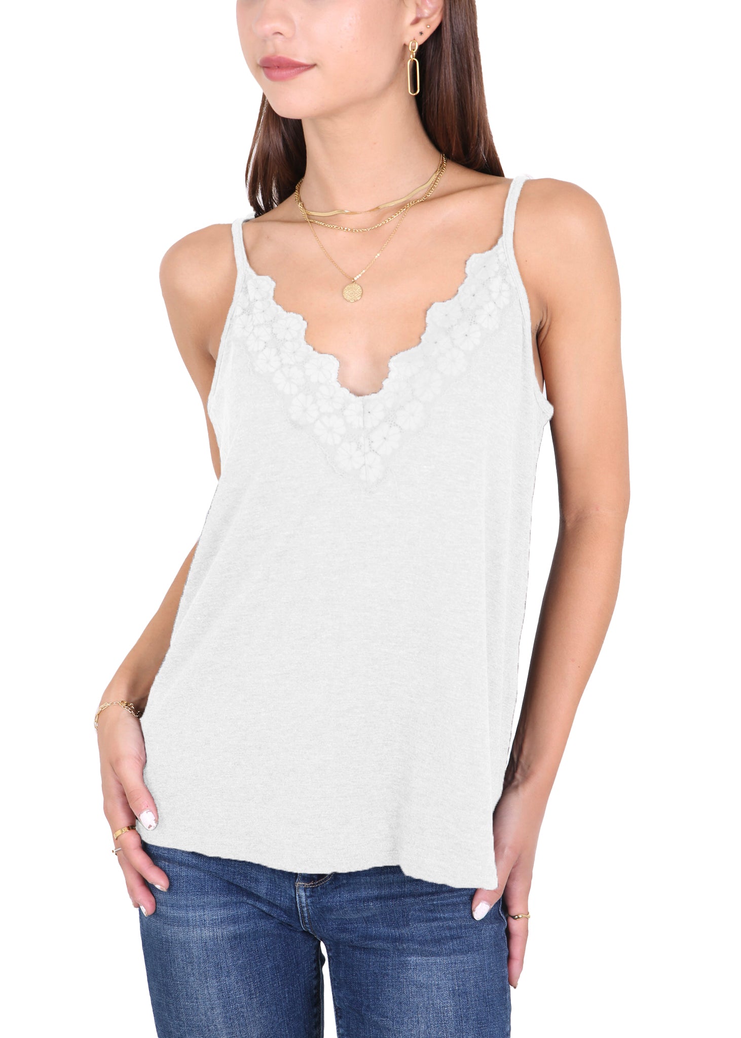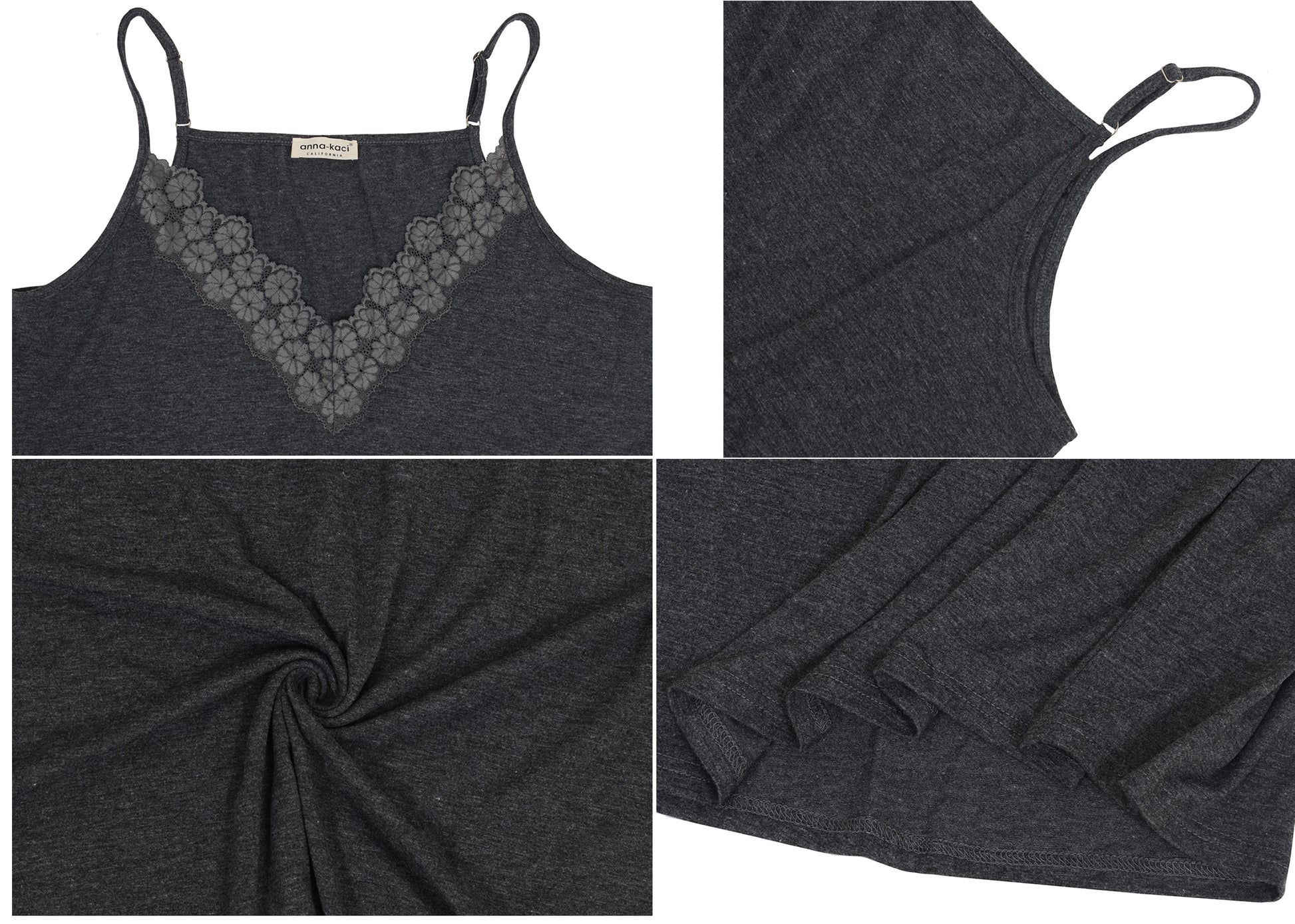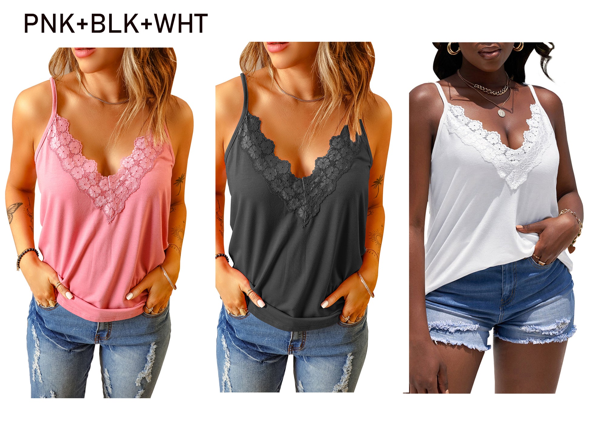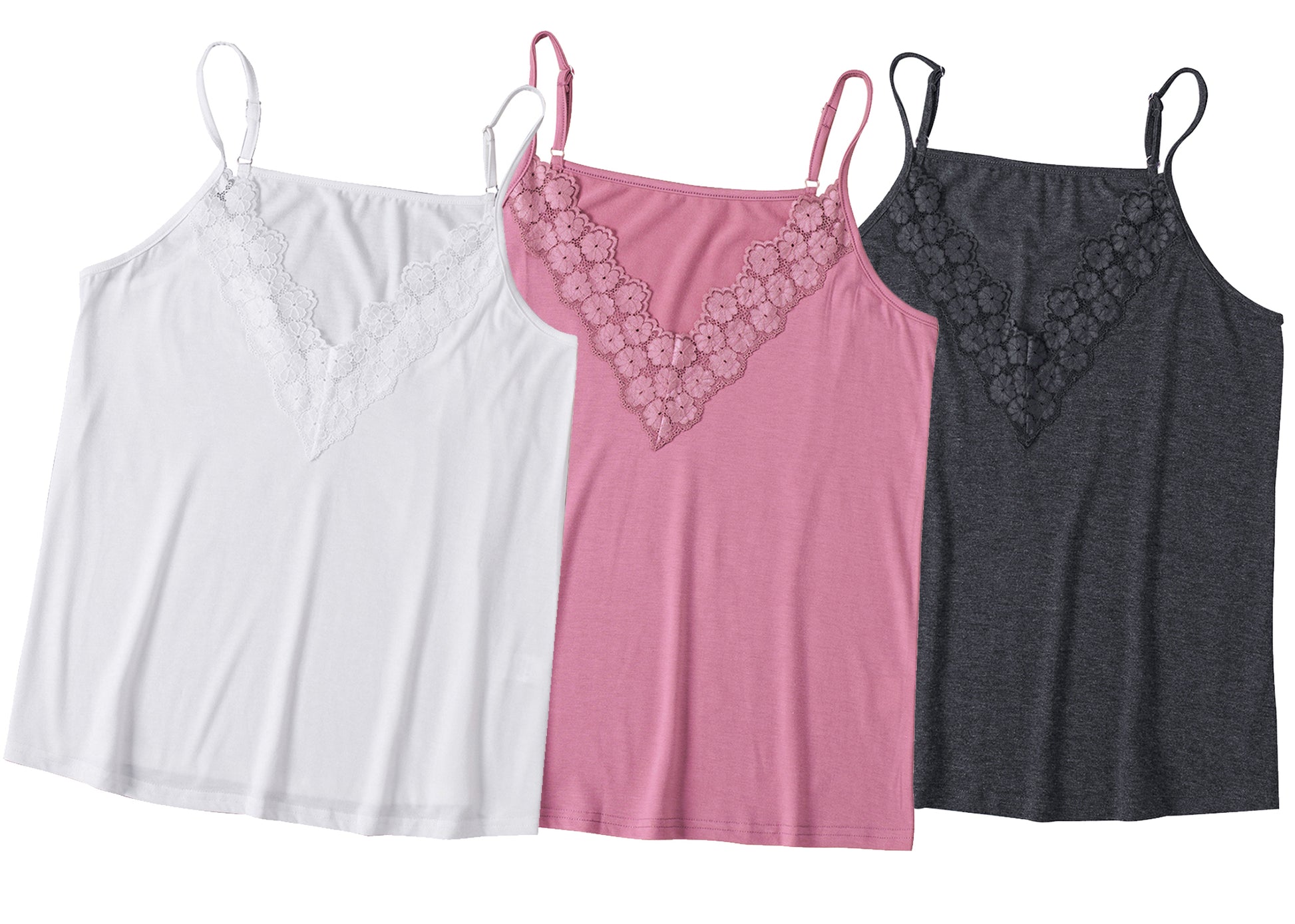 - Features -- V neckline,delicate lace floral trim for a feminine touch;Adjustable spaghetti straps ensure a perfect fit;Sleeveless design for staying cool on hot summer days.Lace trim , loose flowy, solid color design summer tank tops.
