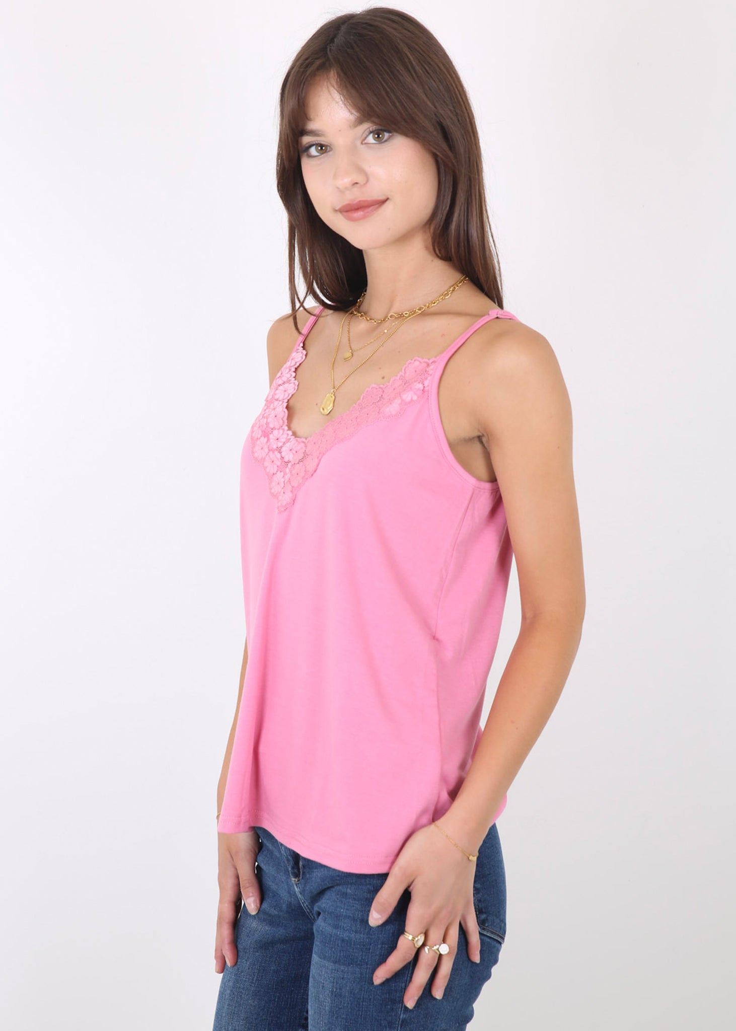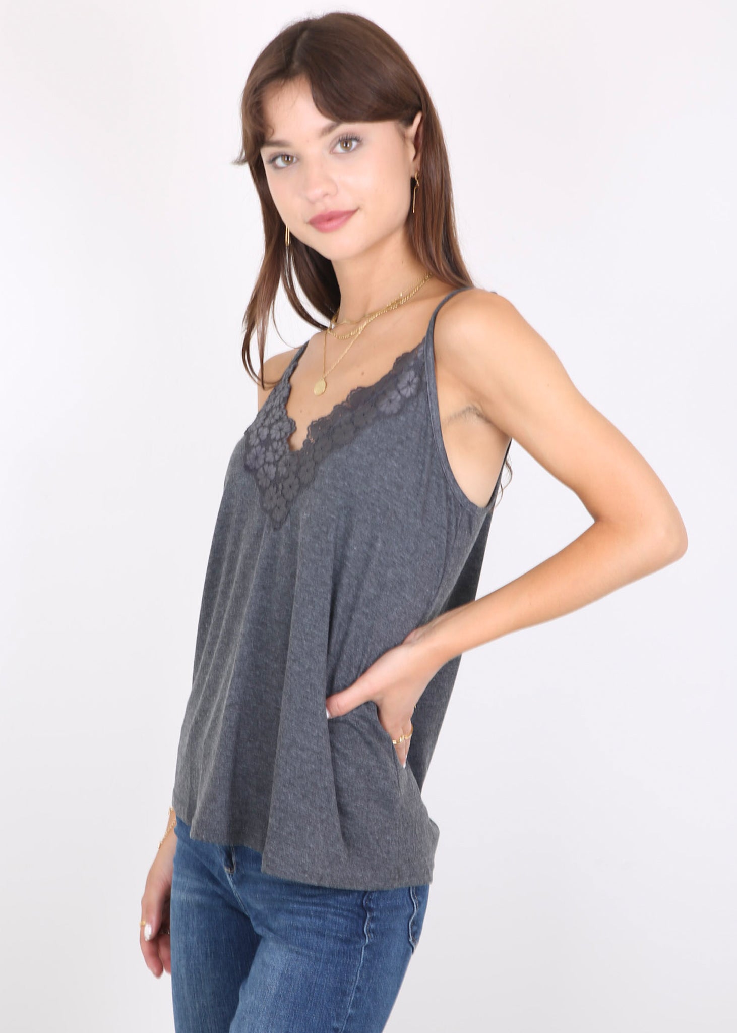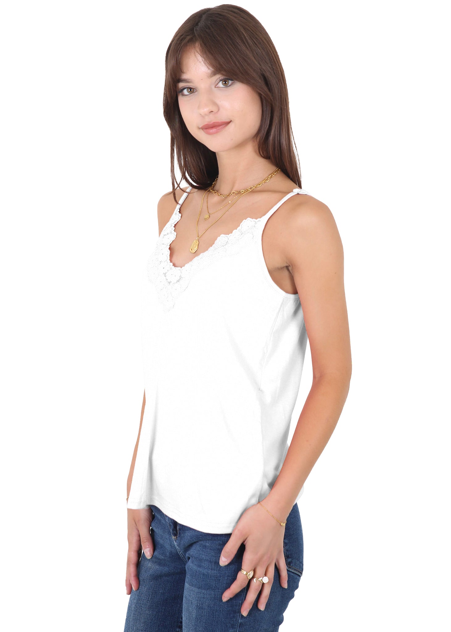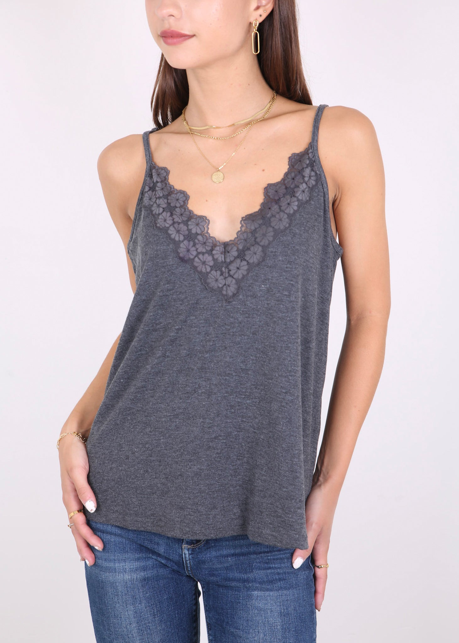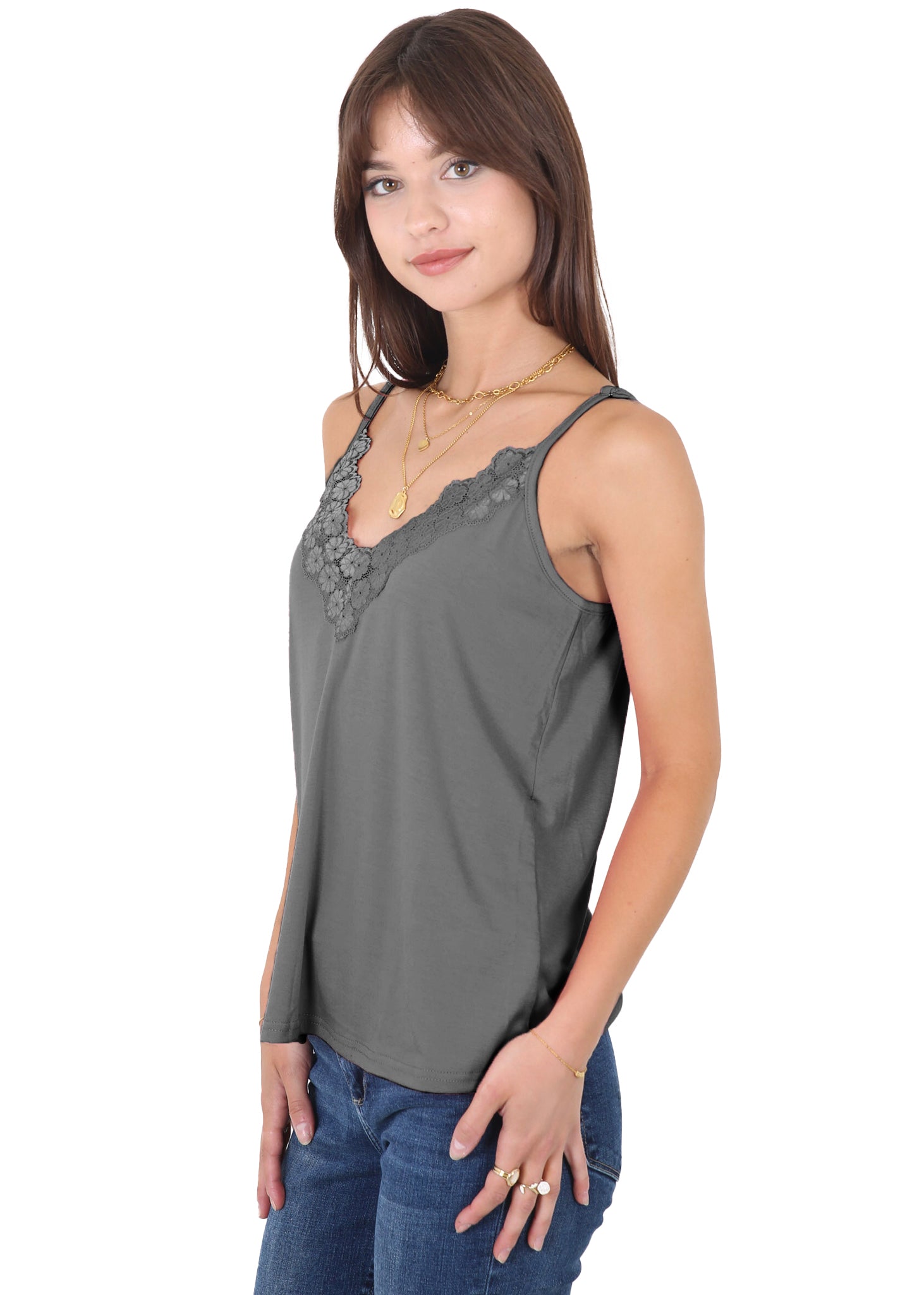 - Features -- V neckline,delicate lace floral trim for a feminine touch;Adjustable spaghetti straps ensure a perfect fit;Sleeveless design for staying cool on hot summer days.Lace trim , loose flowy, solid color design summer tank tops.